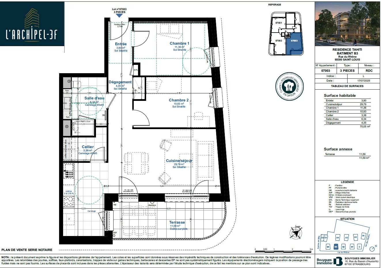 Appartement 3 pièces d’une superficie de 70.05 m² situé au rez de chaussée avec sa terrasse de 11.59m², comprenant :