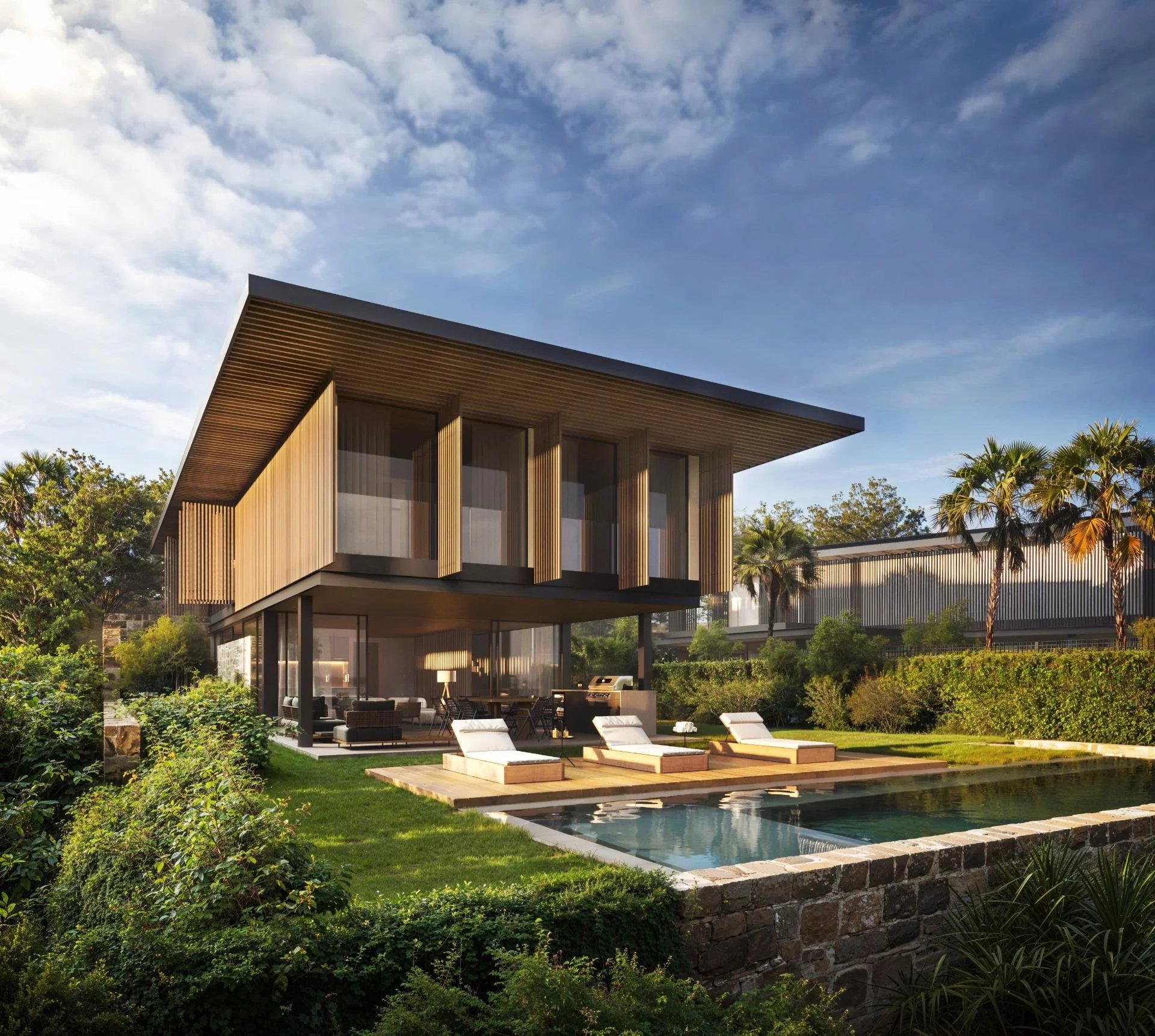 Des espaces de vie ouverts avec des portes vitrées du sol au plafond, maximisant la lumière naturelle et offrant une vie intérieure-extérieure transparente.