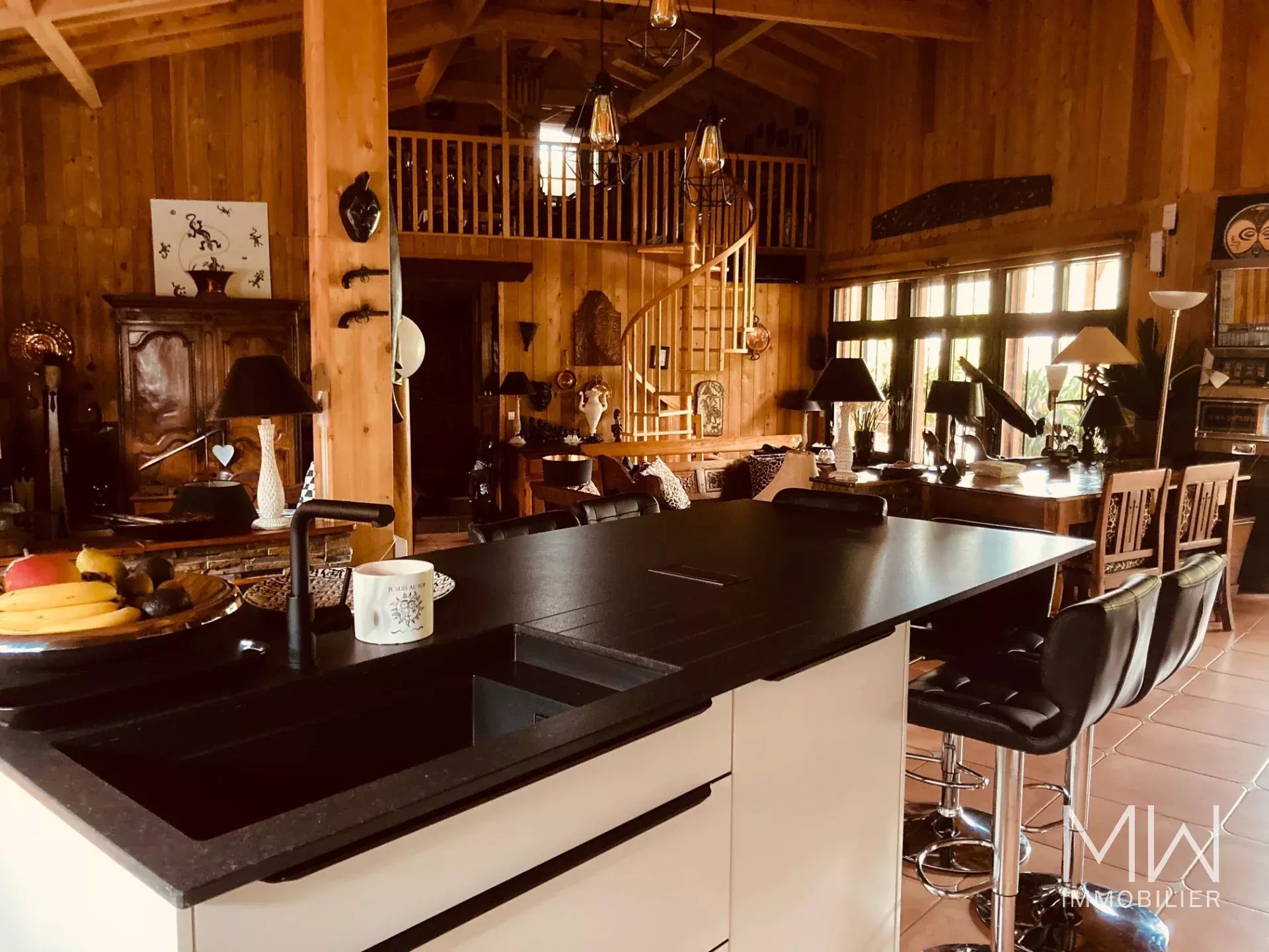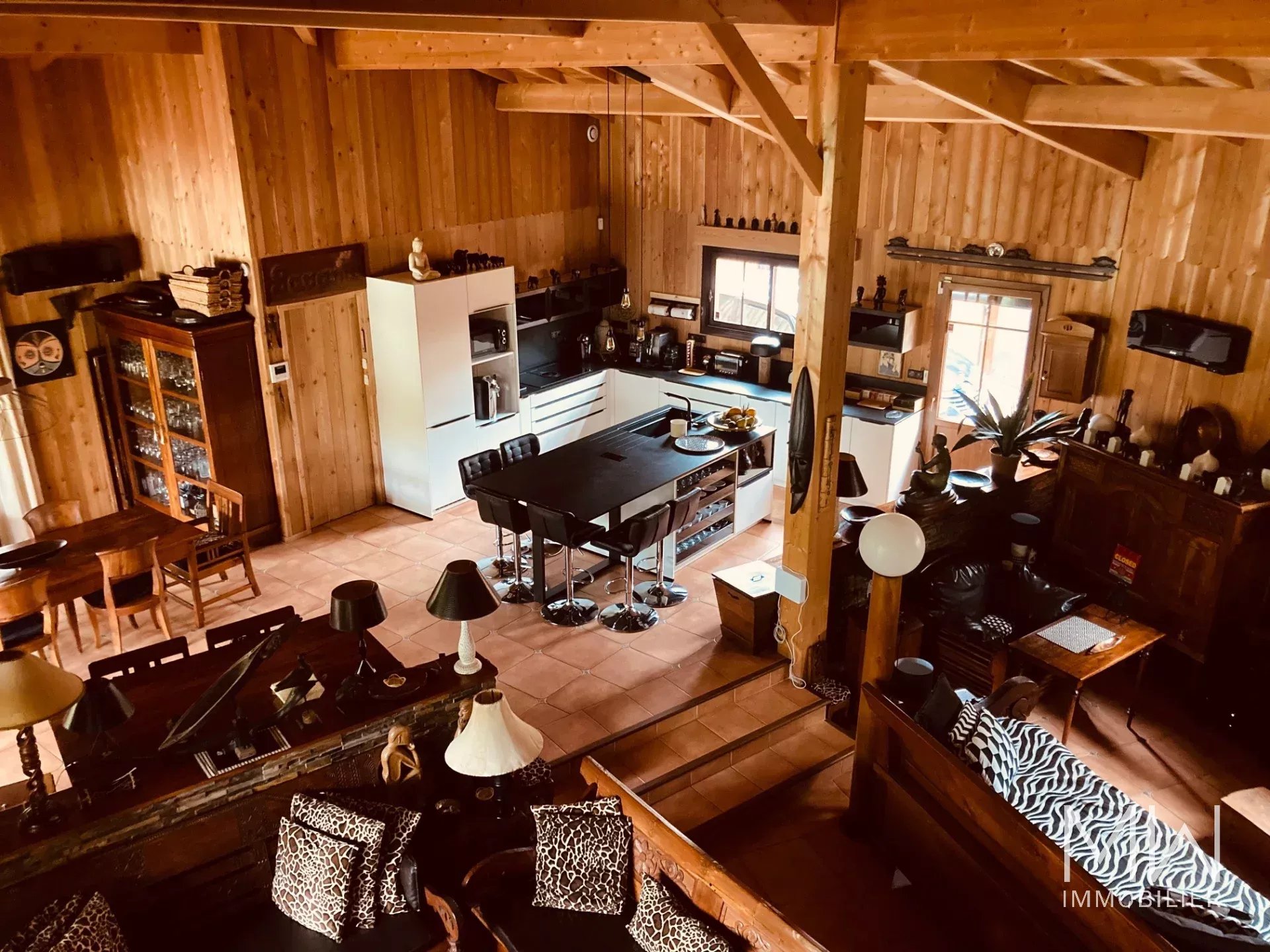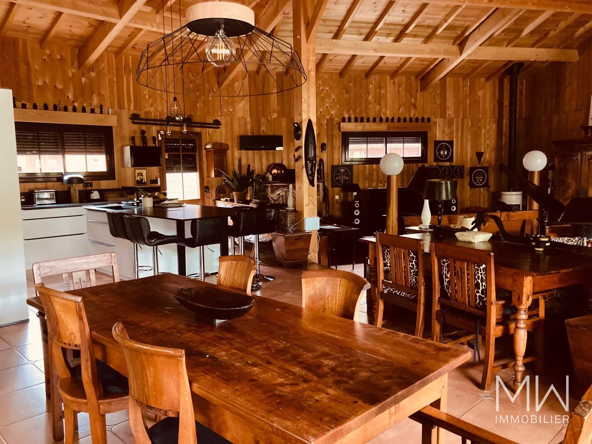 La cuisine américaine, de la maison principale, s'ouvre sur un grand salon et une salle à manger. 4 chambres doubles, dont 1 avec salle d'eau, et une salle de bain supplémentaire complètent le tout.