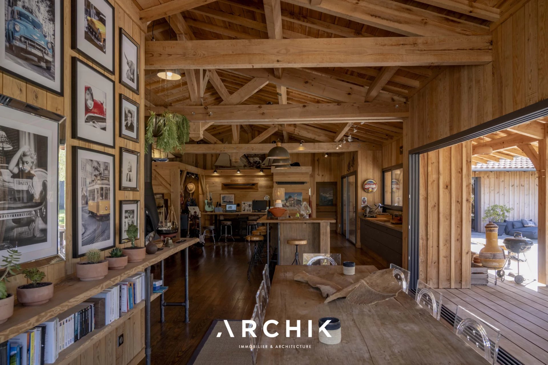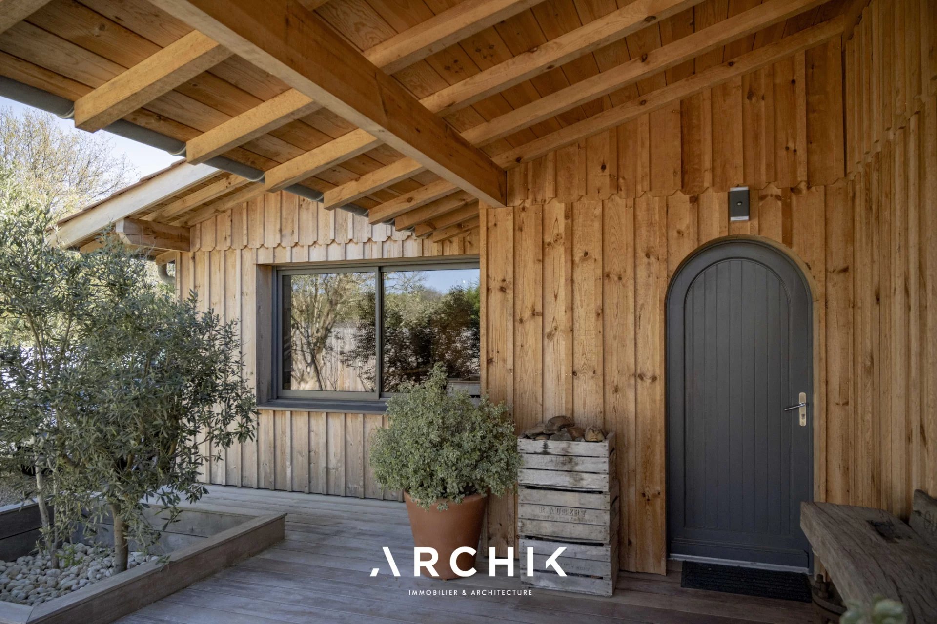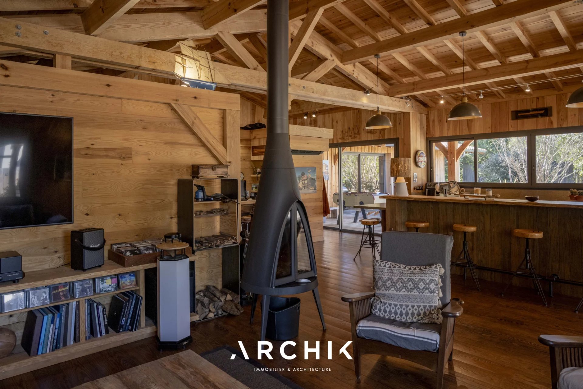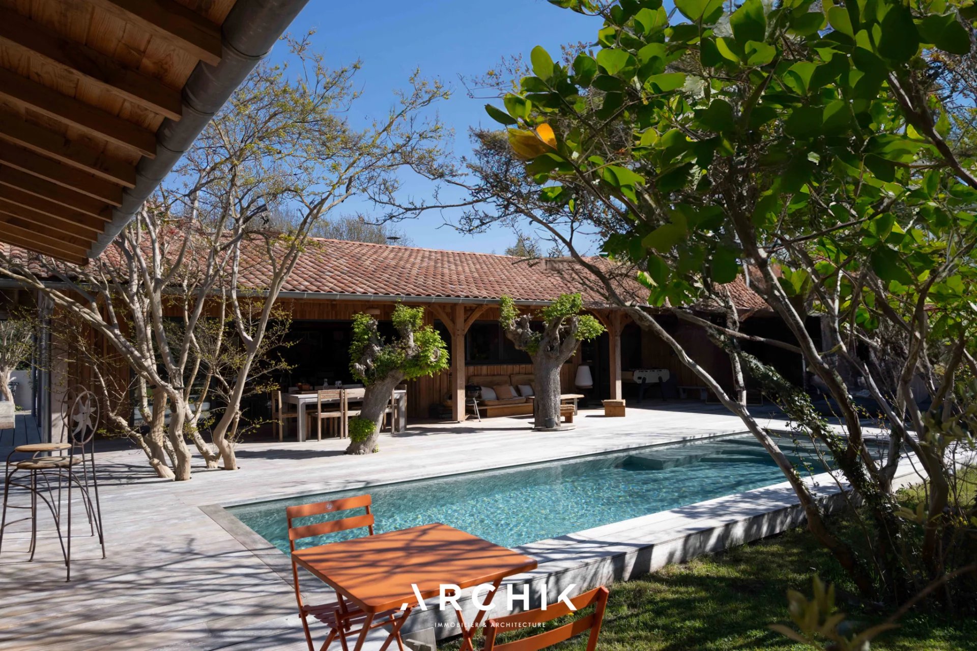 Construite en 2021, elle a été réalisée en pin des Landes par des Compagnons du Devoir. Dès l'entrée, la spectaculaire pièce à vivre offre un volume hors du commun qui laisse apparaitre la charpente et par l'intermédiaire de vastes baies à galandage permet de profiter de l'extérieur. Cette pièce en L permet de distinguer chaque espace avec un poêle central coté salon, une cuisine entièrement équipée avec bar et une grande table pour dix convives qui longe les baies vitrées, ouvrant sur la terrasse couverte avec son salon extérieur, son babyfoot et l'espace repas à l'ombre des Lilas des Indes centenaires. Les trois chambres de la maison dont une suite avec dressing ont toutes leur salle d'eau privative, et une des chambres est dotée de 4 couchages avec un lit double en bas et un lit double sur mezzanine. Une buanderie complète le bien. Dehors, la terrasse de 200 m2 en ipé encadre la piscine chauffée en pierre naturelle, prolongée par le jardin et son terrain de pétanque. Une dépendance qui abrite une salle de sport dispose aussi d'une cuisine extérieure couverte, équipée de plancha et barbecue, face à la piscine.