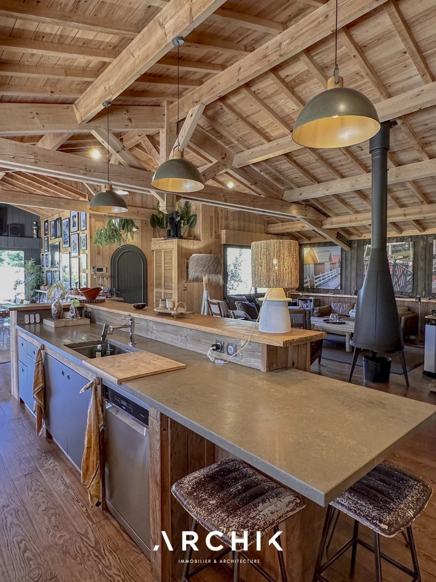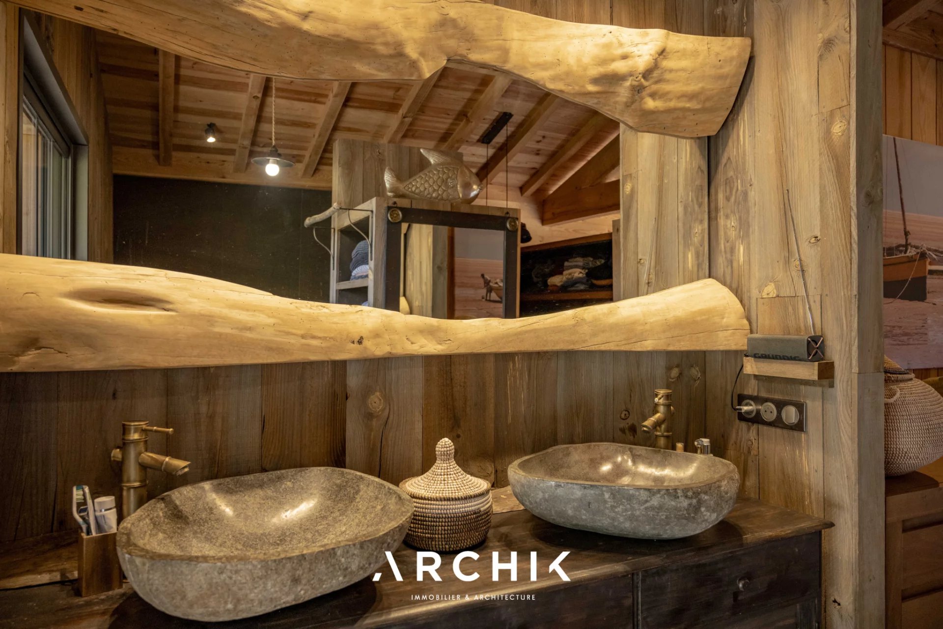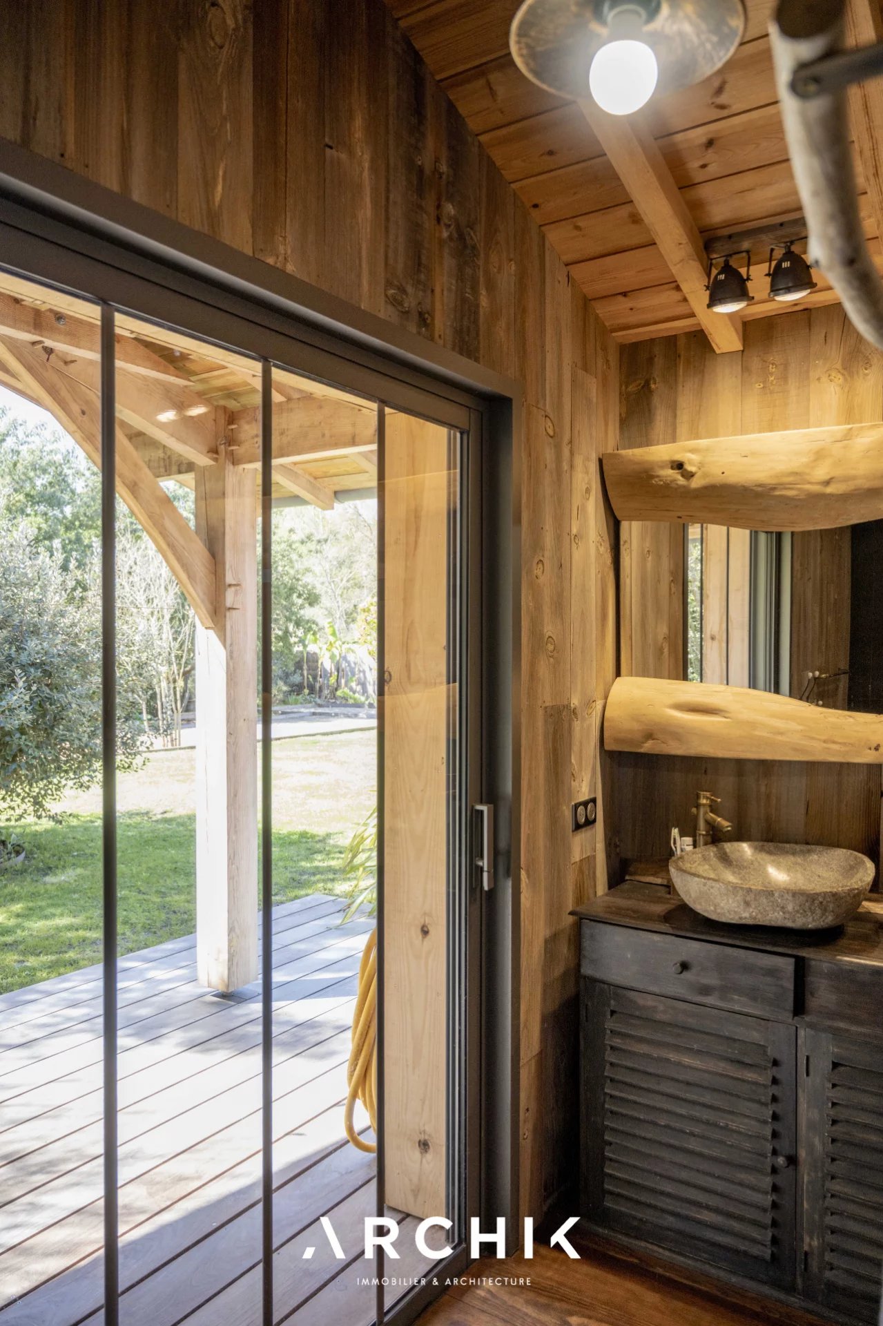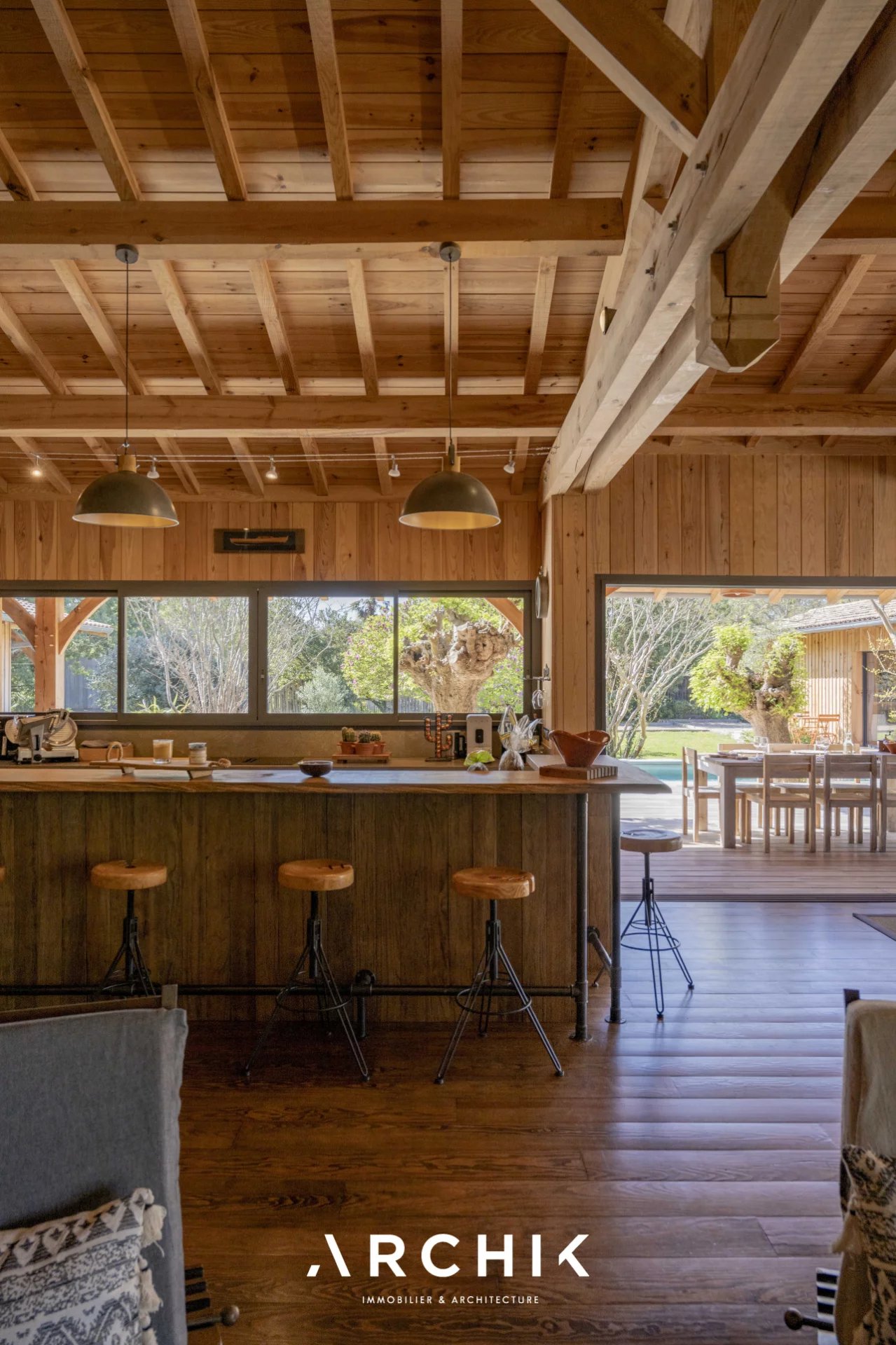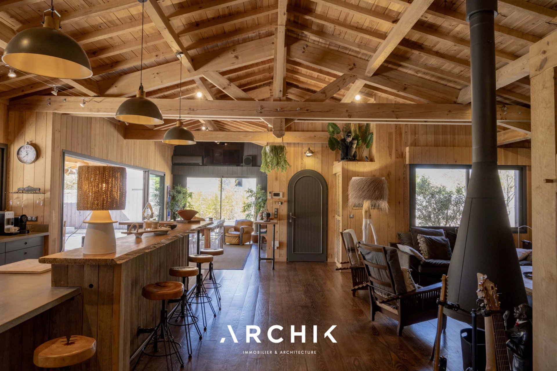 Construite en 2021, elle a été réalisée en pin des Landes par des Compagnons du Devoir. Dès l'entrée, la spectaculaire pièce à vivre offre un volume hors du commun qui laisse apparaitre la charpente et par l'intermédiaire de vastes baies à galandage permet de profiter de l'extérieur. Cette pièce en L permet de distinguer chaque espace avec un poêle central coté salon, une cuisine entièrement équipée avec bar et une grande table pour dix convives qui longe les baies vitrées, ouvrant sur la terrasse couverte avec son salon extérieur, son babyfoot et l'espace repas à l'ombre des Lilas des Indes centenaires. Les trois chambres de la maison dont une suite avec dressing ont toutes leur salle d'eau privative, et une des chambres est dotée de 4 couchages avec un lit double en bas et un lit double sur mezzanine. Une buanderie complète le bien. Dehors, la terrasse de 200 m2 en ipé encadre la piscine chauffée en pierre naturelle, prolongée par le jardin et son terrain de pétanque. Une dépendance qui abrite une salle de sport dispose aussi d'une cuisine extérieure couverte, équipée de plancha et barbecue, face à la piscine.