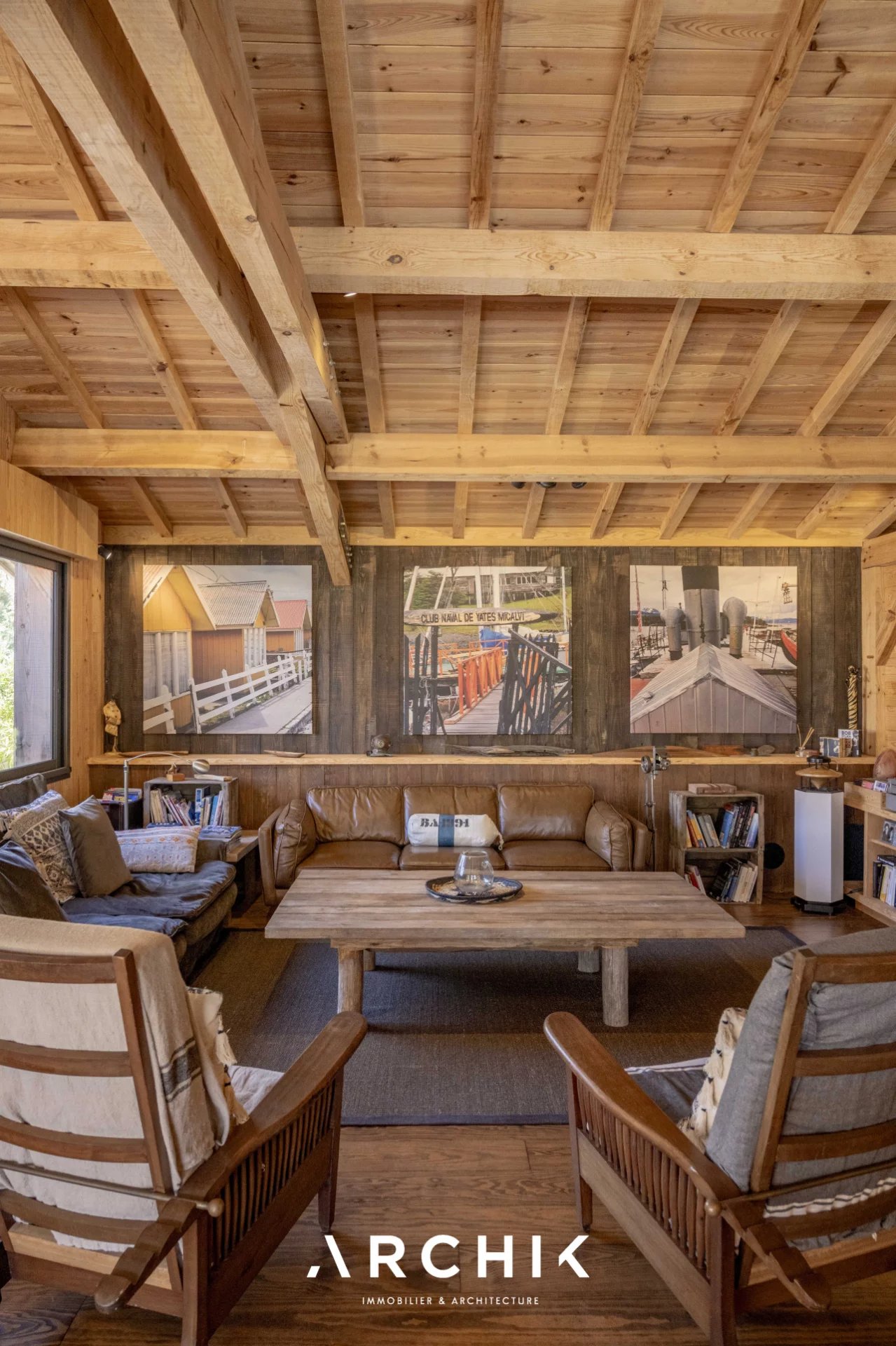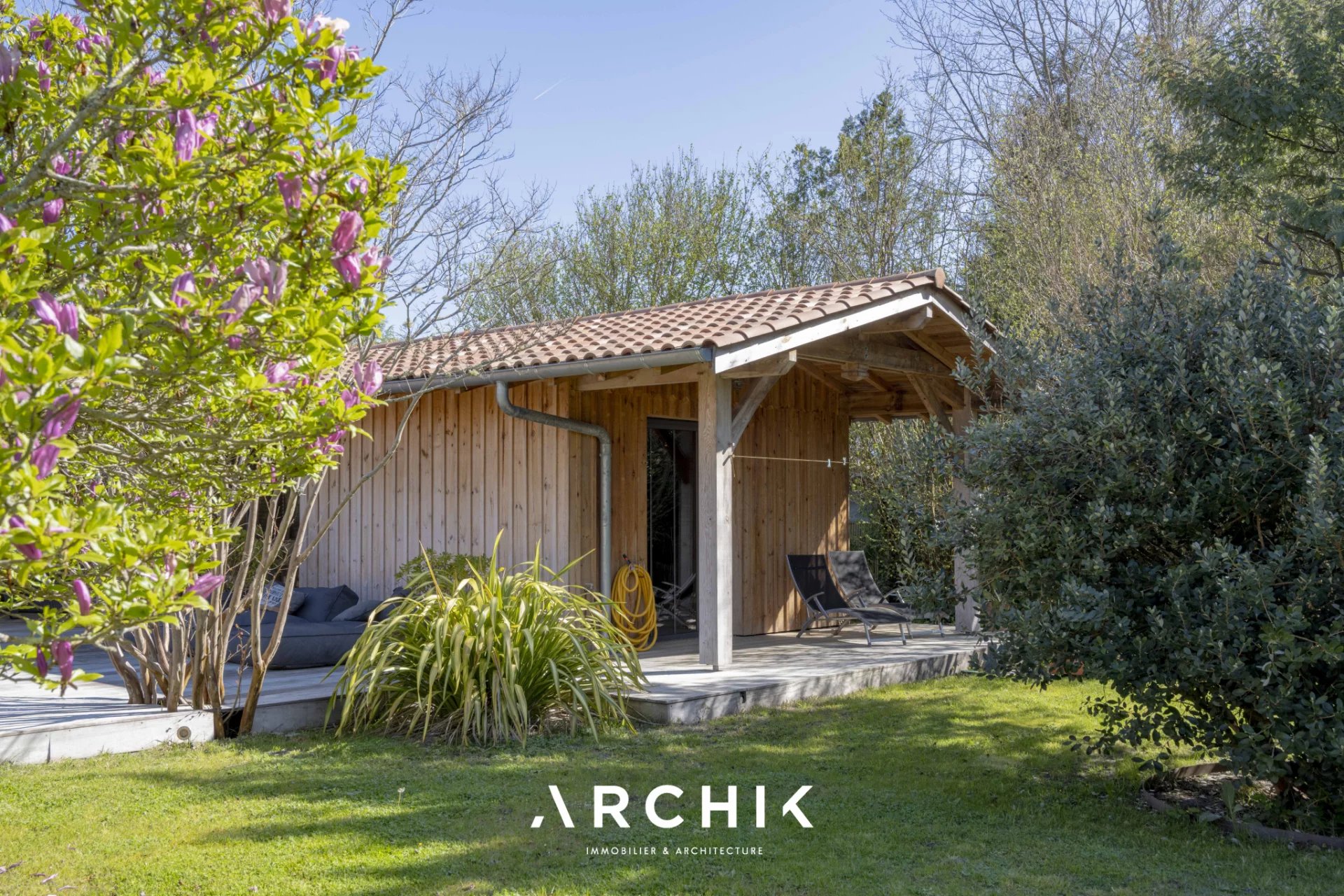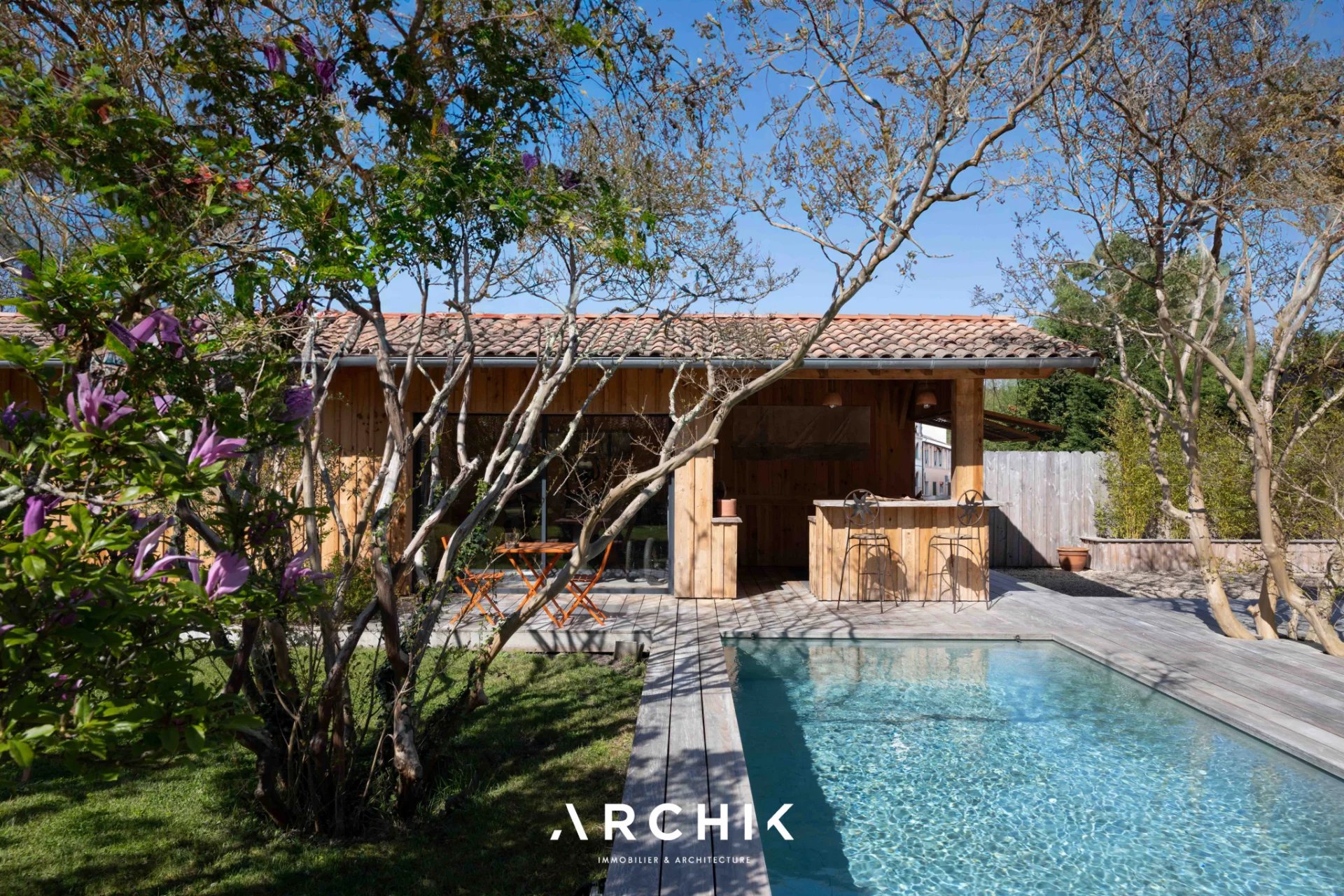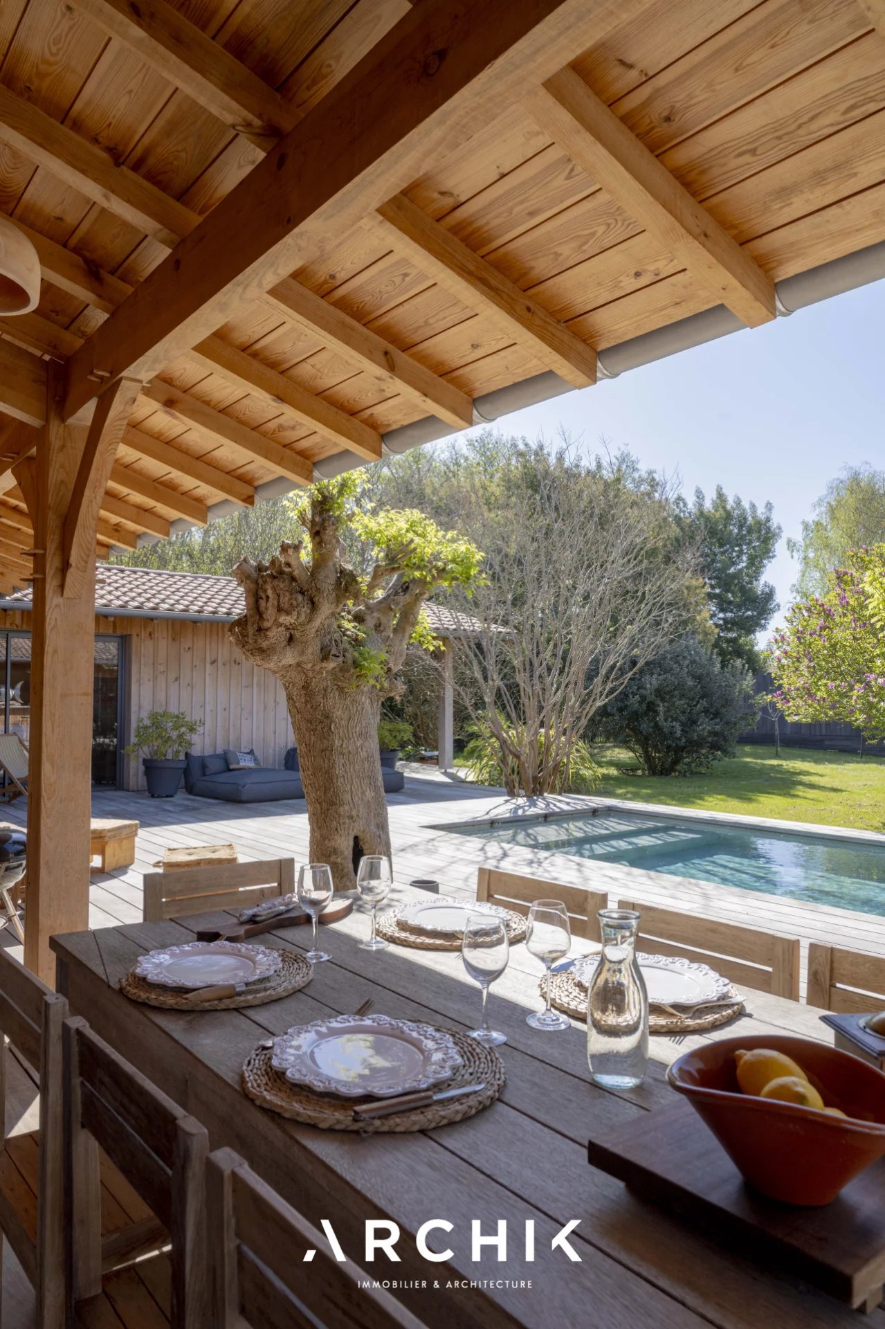 Architecture contemporaine en bois, cette maison de 200 m2 ouvre sur un parc de 1 860 m2 orné de nombreuses essences locales, dans un quartier préservé aux confins du centre de La Teste et du Pyla, avec une piste cyclable qui passant devant la propriété, idéale pour partir vers le Pyla ou vers le marché.