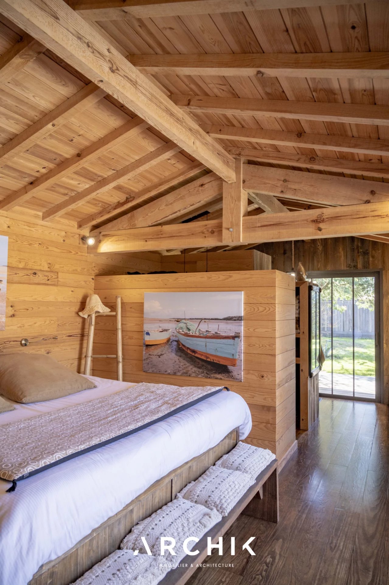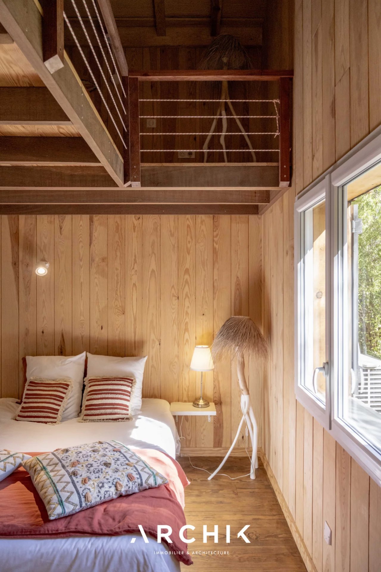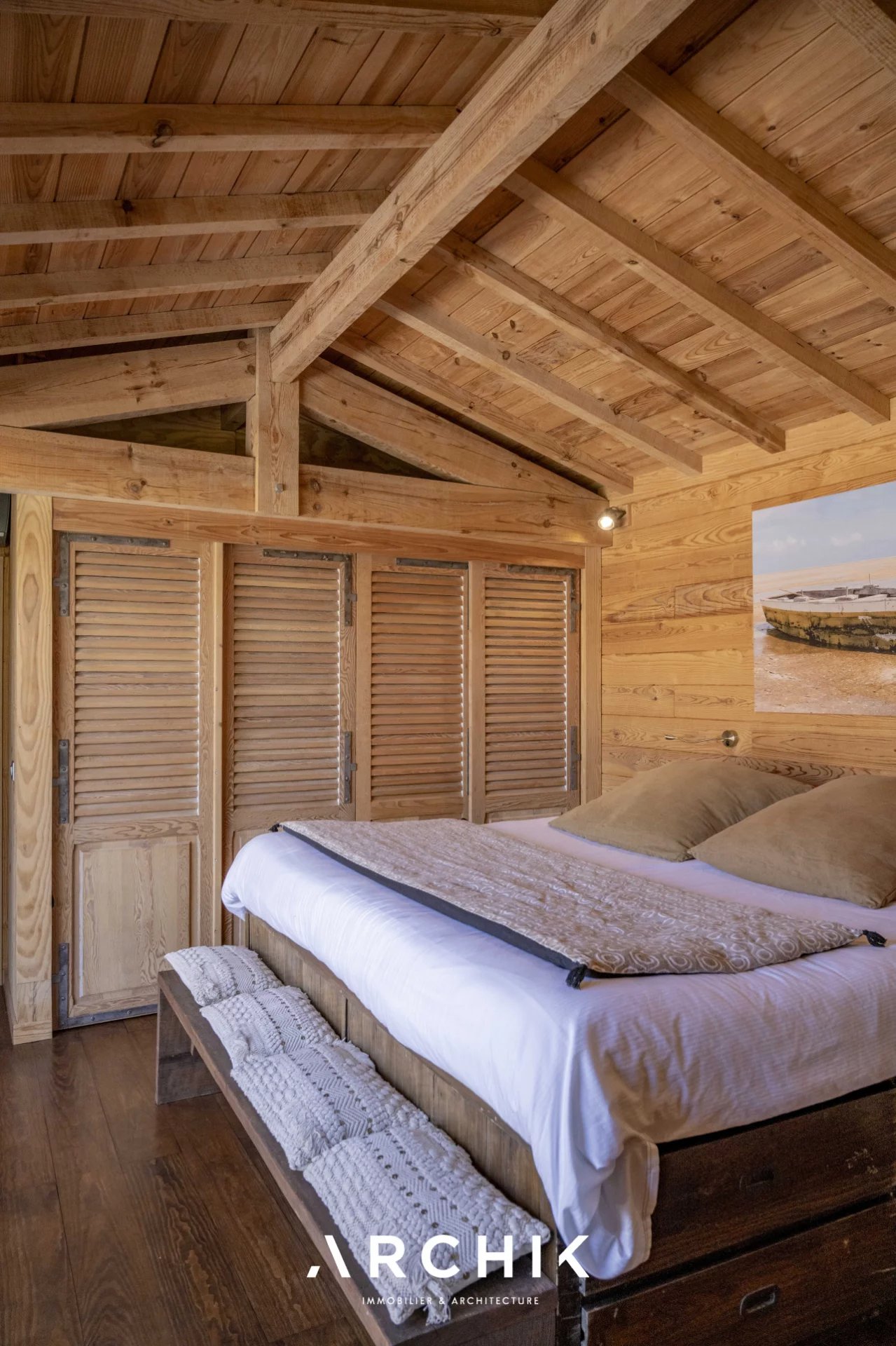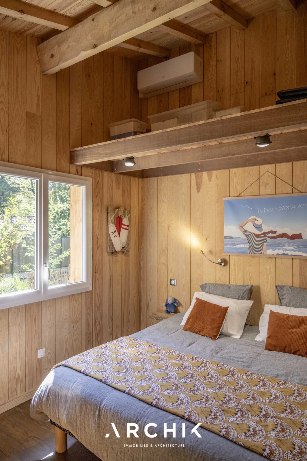 Architecture contemporaine en bois, cette maison de 200 m2 ouvre sur un parc de 1 860 m2 orné de nombreuses essences locales, dans un quartier préservé aux confins du centre de La Teste et du Pyla, avec une piste cyclable qui passant devant la propriété, idéale pour partir vers le Pyla ou vers le marché.