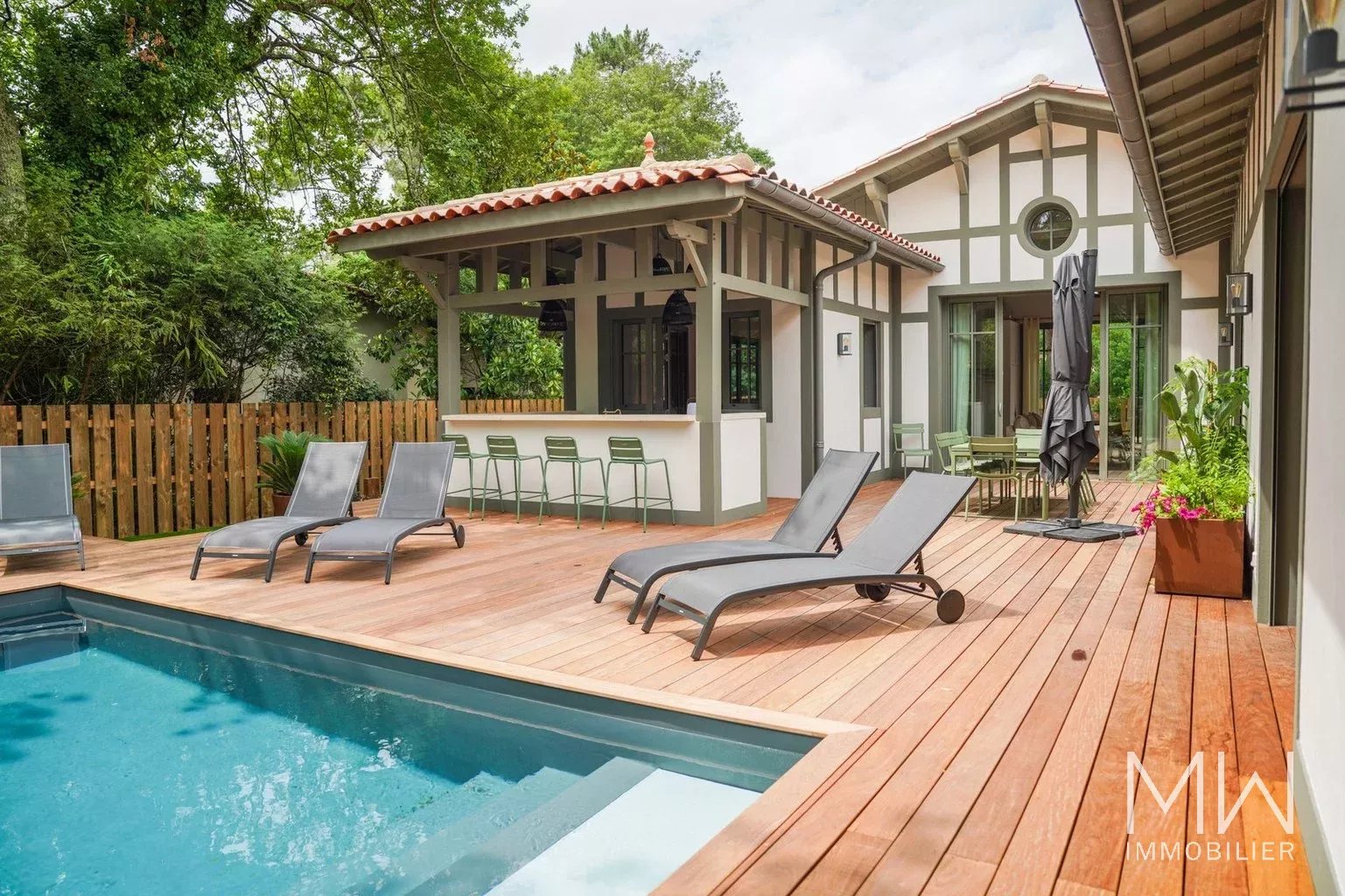 Une piscine, un espace bar extérieur, un boulodrome et de belles terrasses bois complètent le tout.
