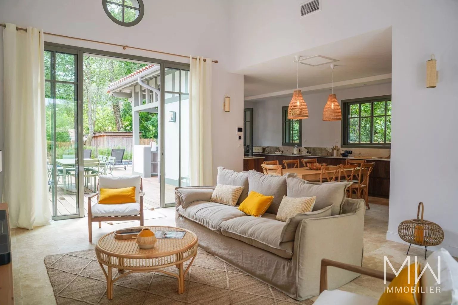 De plain pied, elle propose une vaste pièce de vie avec cuisine équipée ouverte sur une salle à manger et un salon lumineux.