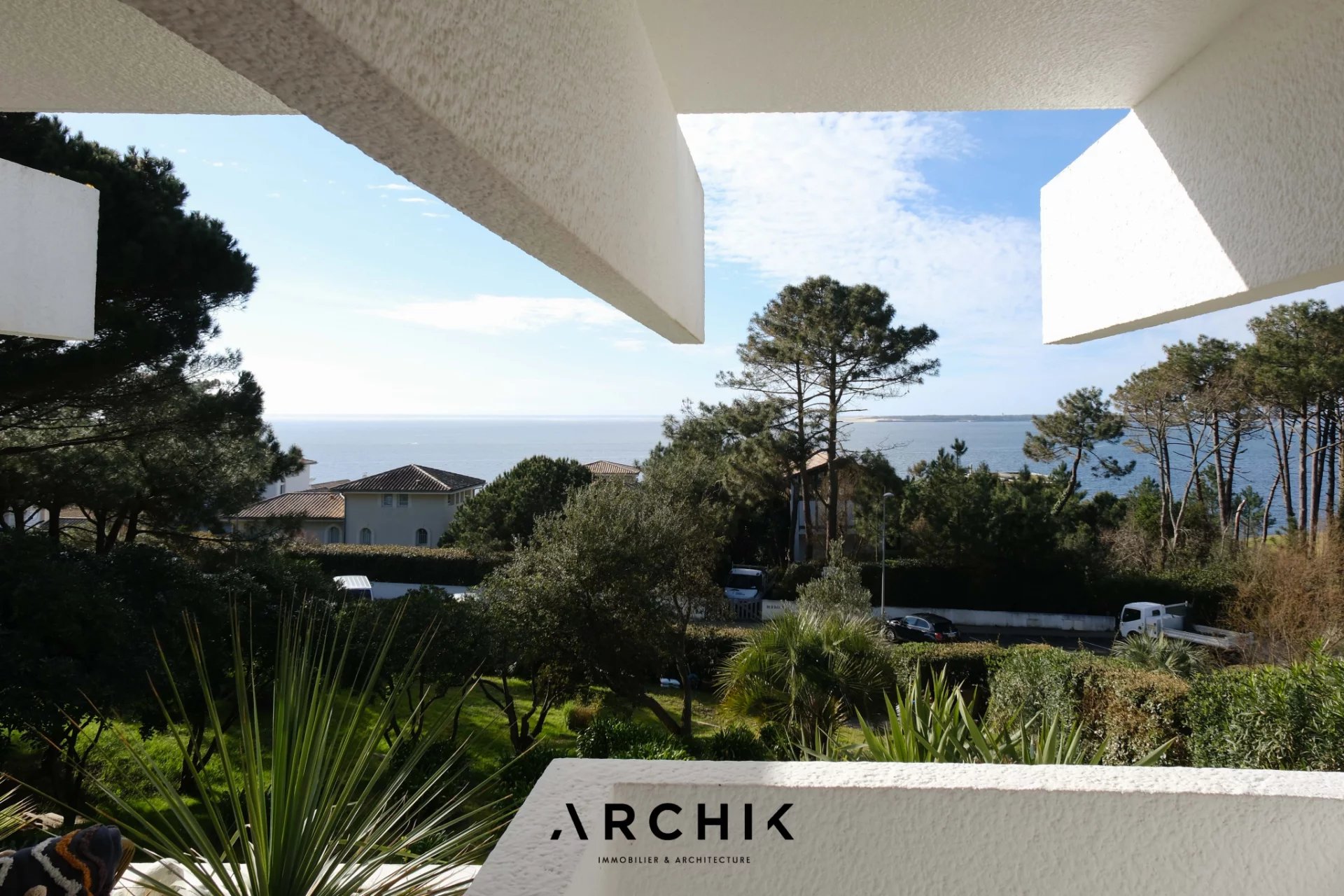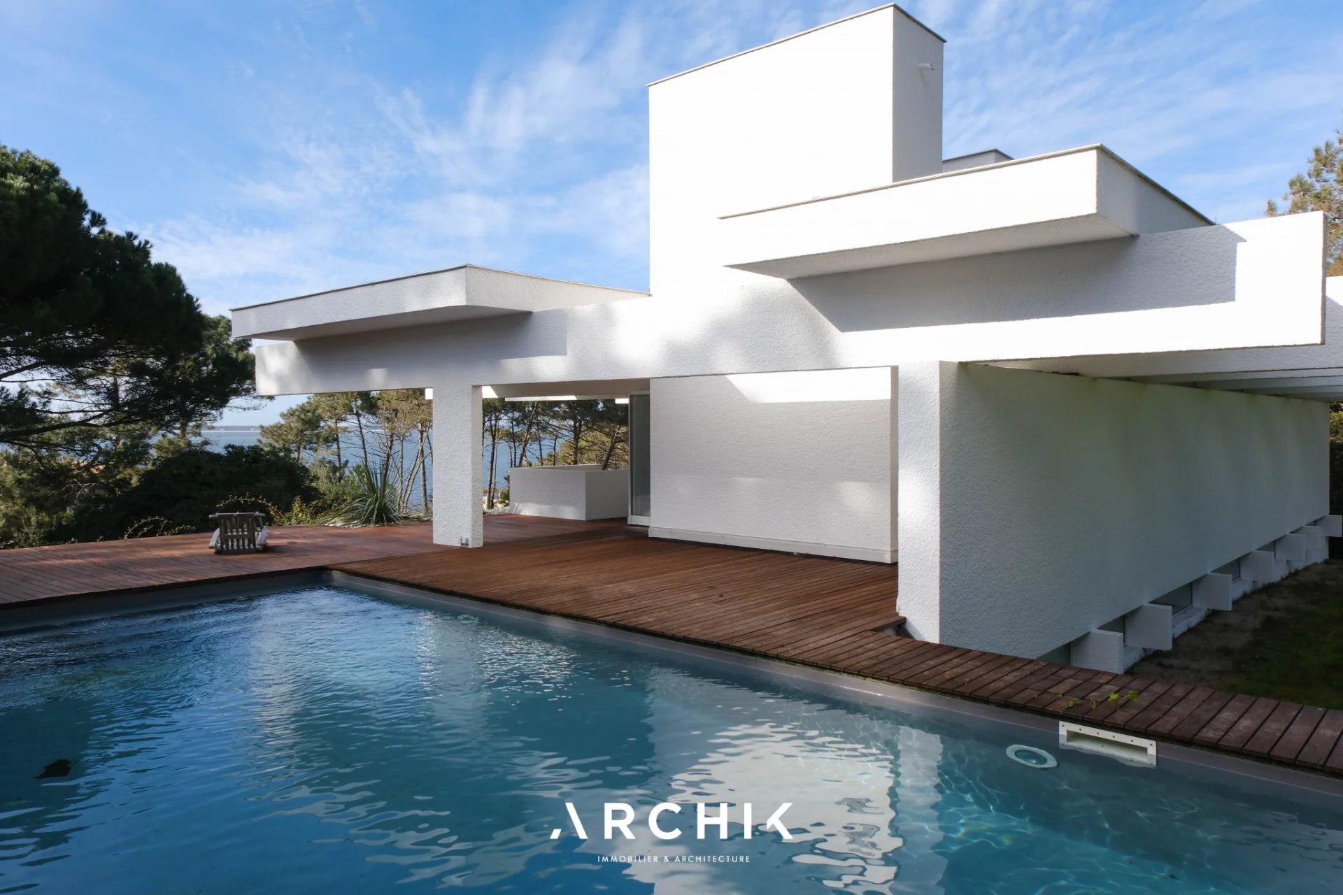 Construite en 1967 et récemment rénovée, cette maison réalisée par Yves Salier et la célèbre « école bordelaise » est un véritable manifeste d'architecture contemporaine. Ses lignes radicales associées à la blancheur du béton s'intègrent naturellement au coeur de cet environnement préservé. A l'intérieur et sur deux niveaux, elle dispose d'un plan inversé permettant à l'espace à vivre, inondé de lumière par de nombreuses baies et impostes, de profiter pleinement des superbes vues. Les quatre chambres et leurs salles d'eau occupent le rez-de-jardin et permettent d'accueillir huit personnes. Bordée par de belles terrasses prolongées par une piscine, elle constitue un lieu de villégiature hors du commun.