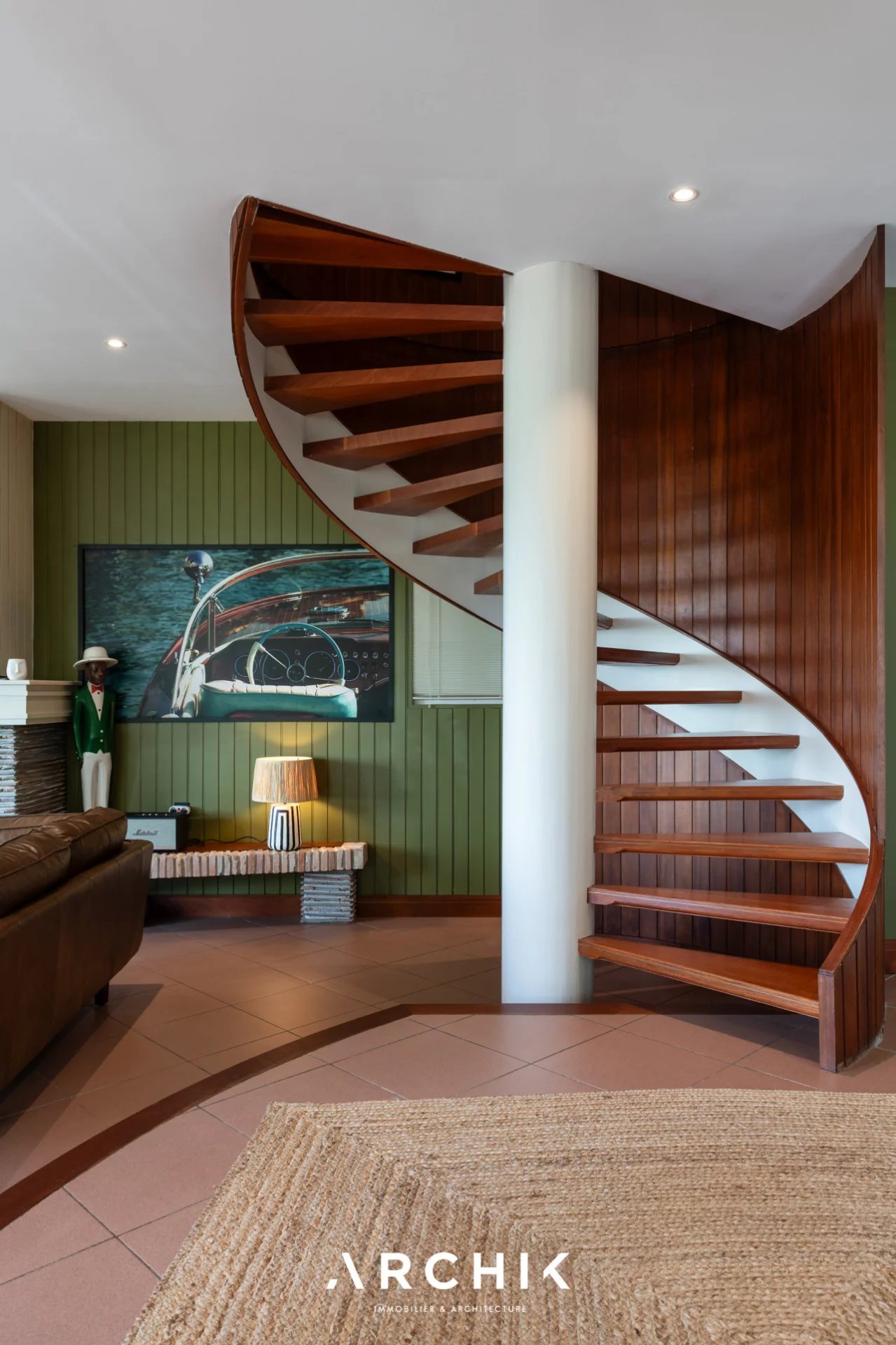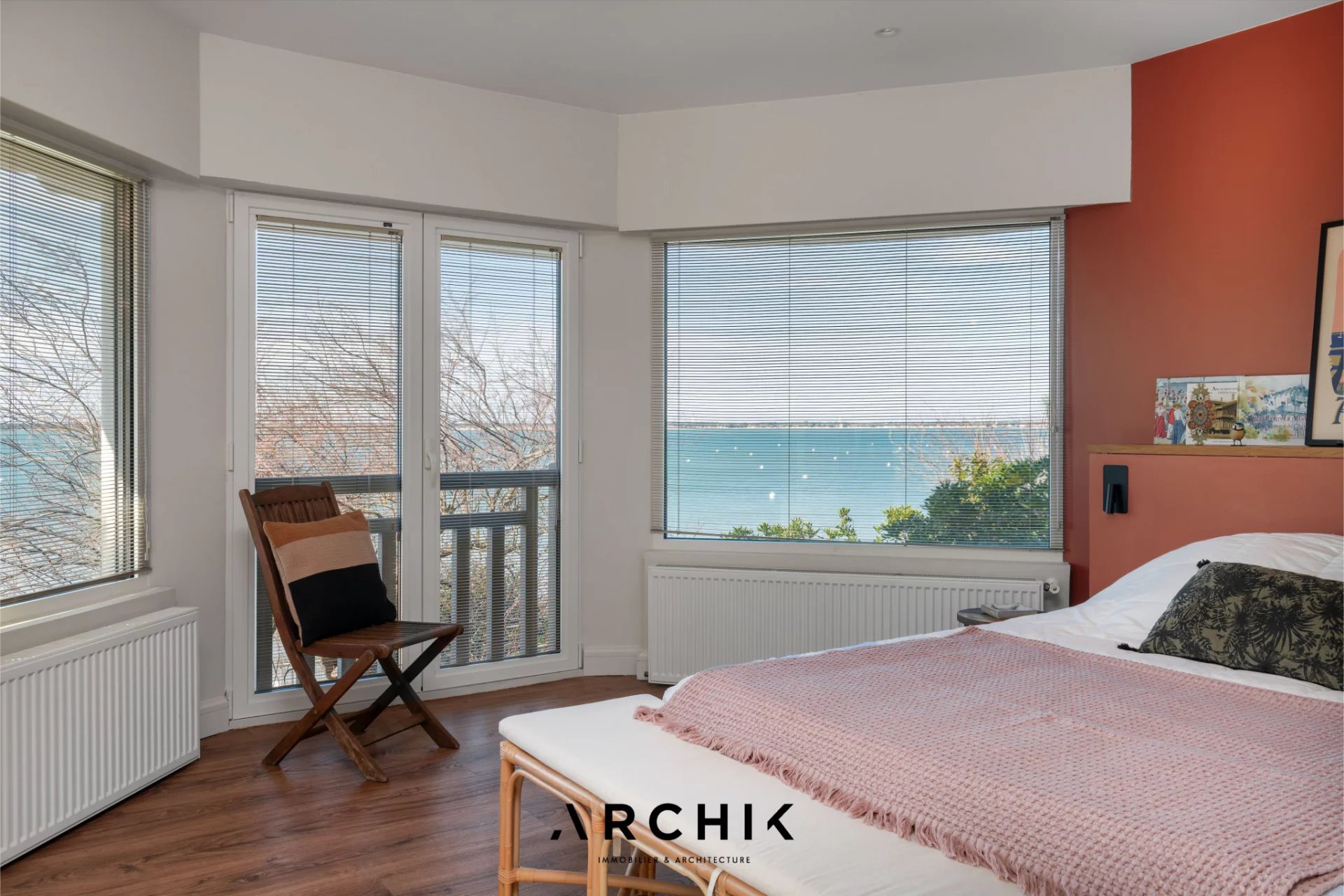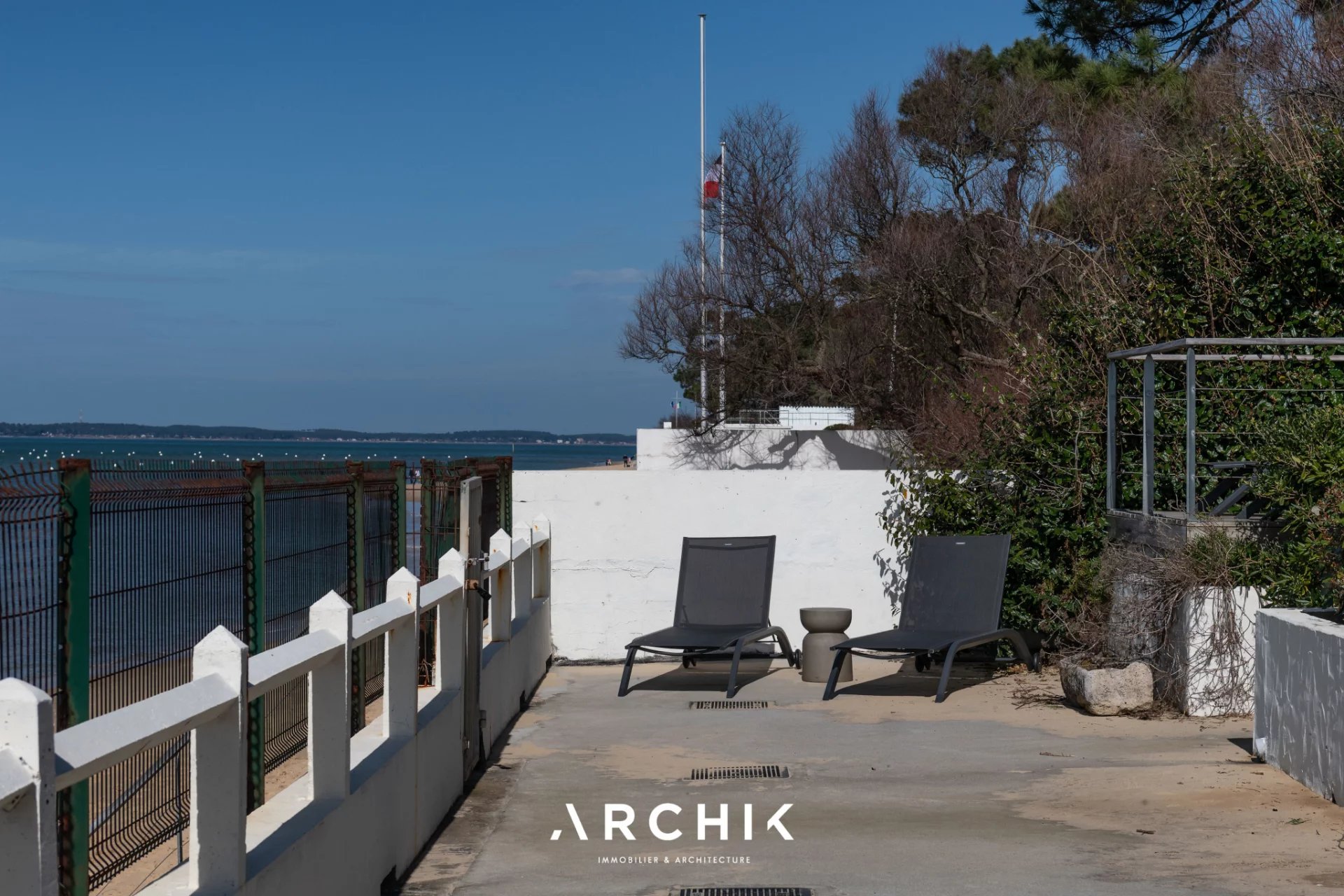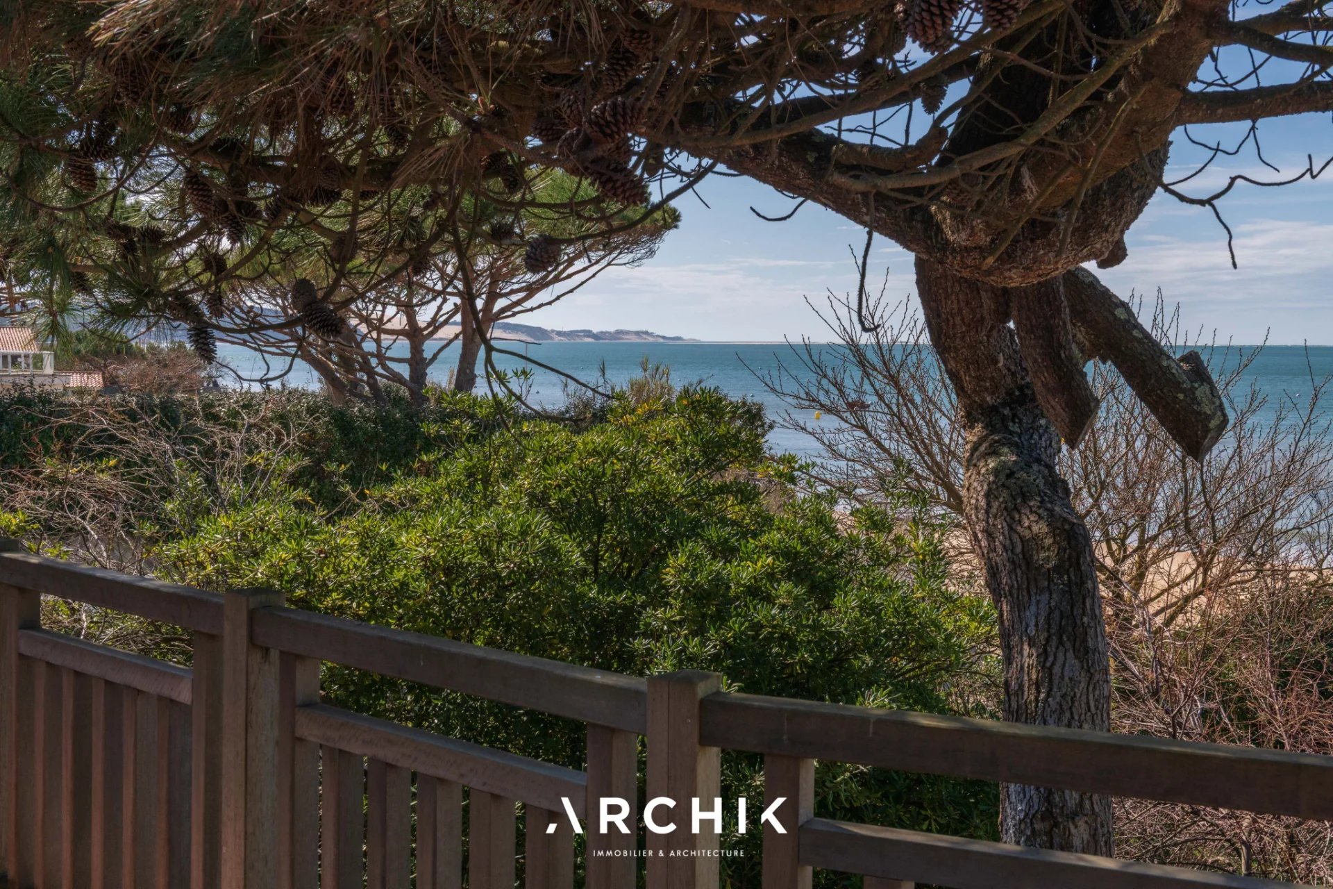 Entièrement rénovée en 2022, la maison offre des vues exceptionnelles sur le Bassin.Dès l'entrée le regard est attiré vers l'horizon à travers de grandes baies vitrées qui longent la façade coté salle à manger. Dans cette agréable pièce à vivre, un angle vitréaccueil une table pour 8 personnes,laissant filtrer la lumière du Sud à travers les feuillages. La cuisine entièrement équipée et revêtu d'un bois foncé est un emplacement privilégié avec son bar ouvert sur l'espace de vie afin de profiter de la vue.Le salon, enveloppé de lambris bois s'installe devant une cheminée en brique entre un grand bow-window qui encadre le paysage et un escalier hélicoïdal avec des pas en bois foncé tel une sculpture dans l'espace.Une chambre avec sa salle d'eau et une buanderie complètent ce premier niveau.