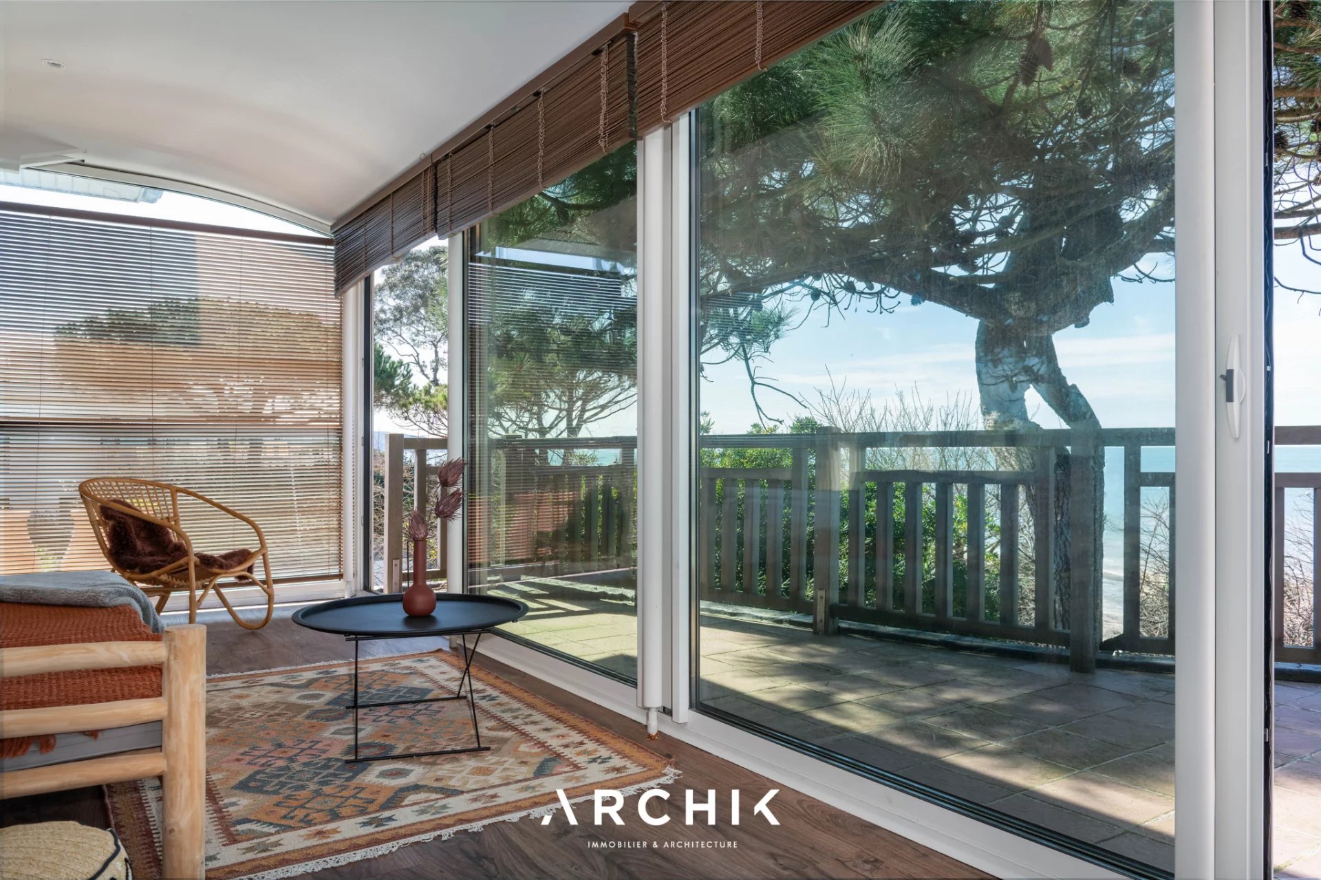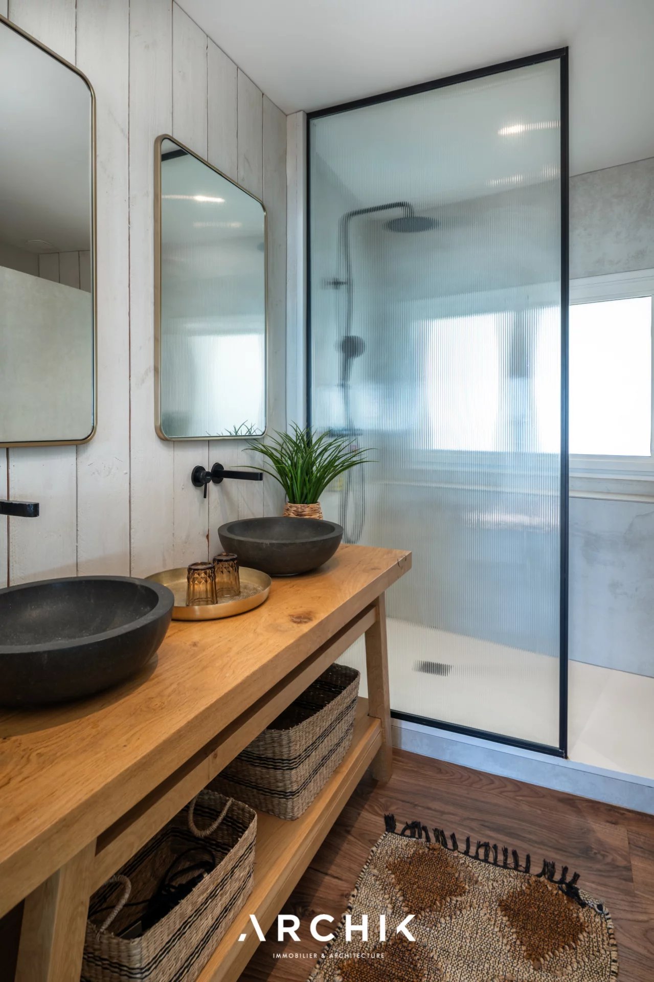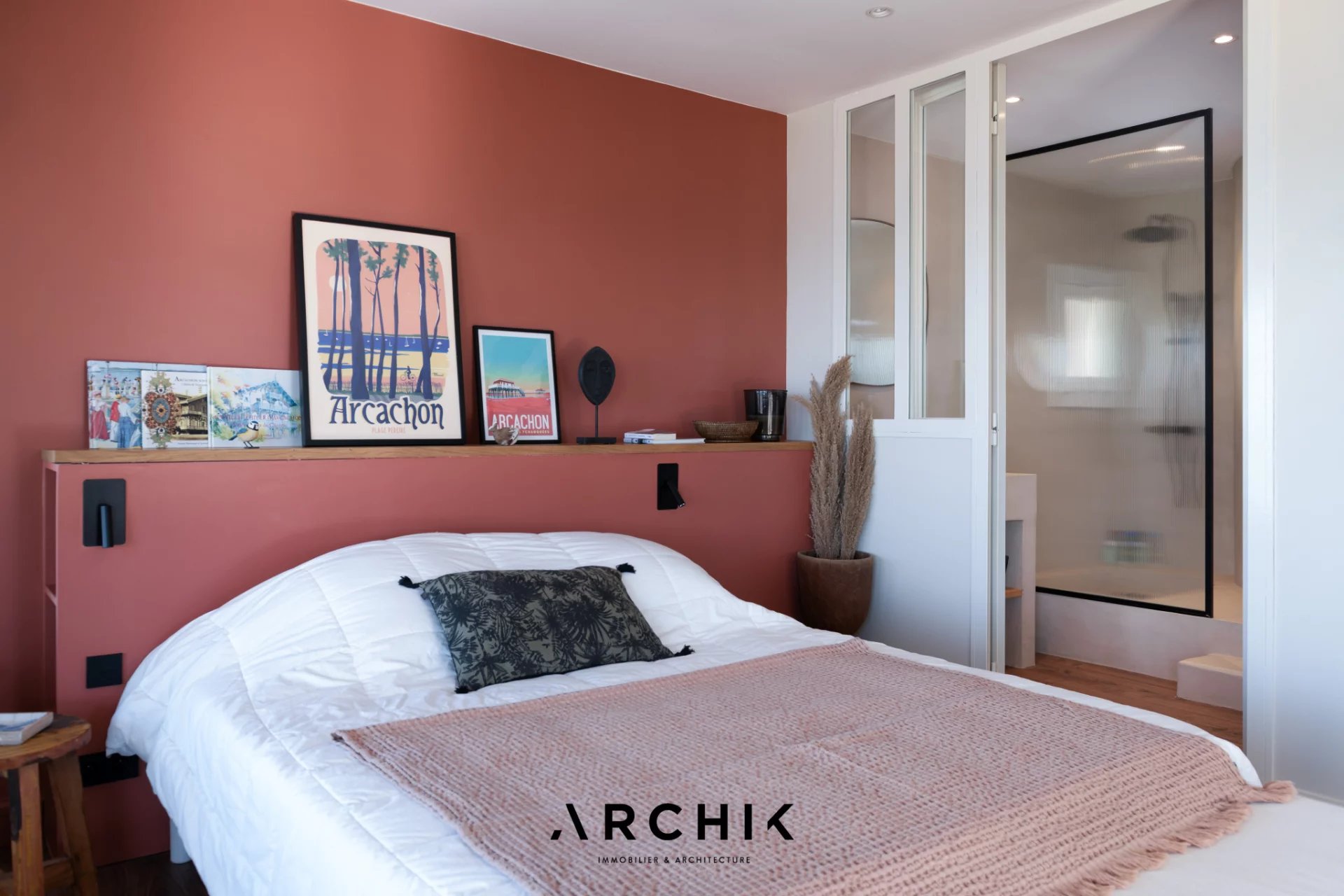 Entièrement rénovée en 2022, la maison offre des vues exceptionnelles sur le Bassin.Dès l'entrée le regard est attiré vers l'horizon à travers de grandes baies vitrées qui longent la façade coté salle à manger. Dans cette agréable pièce à vivre, un angle vitréaccueil une table pour 8 personnes,laissant filtrer la lumière du Sud à travers les feuillages. La cuisine entièrement équipée et revêtu d'un bois foncé est un emplacement privilégié avec son bar ouvert sur l'espace de vie afin de profiter de la vue.Le salon, enveloppé de lambris bois s'installe devant une cheminée en brique entre un grand bow-window qui encadre le paysage et un escalier hélicoïdal avec des pas en bois foncé tel une sculpture dans l'espace.Une chambre avec sa salle d'eau et une buanderie complètent ce premier niveau.
