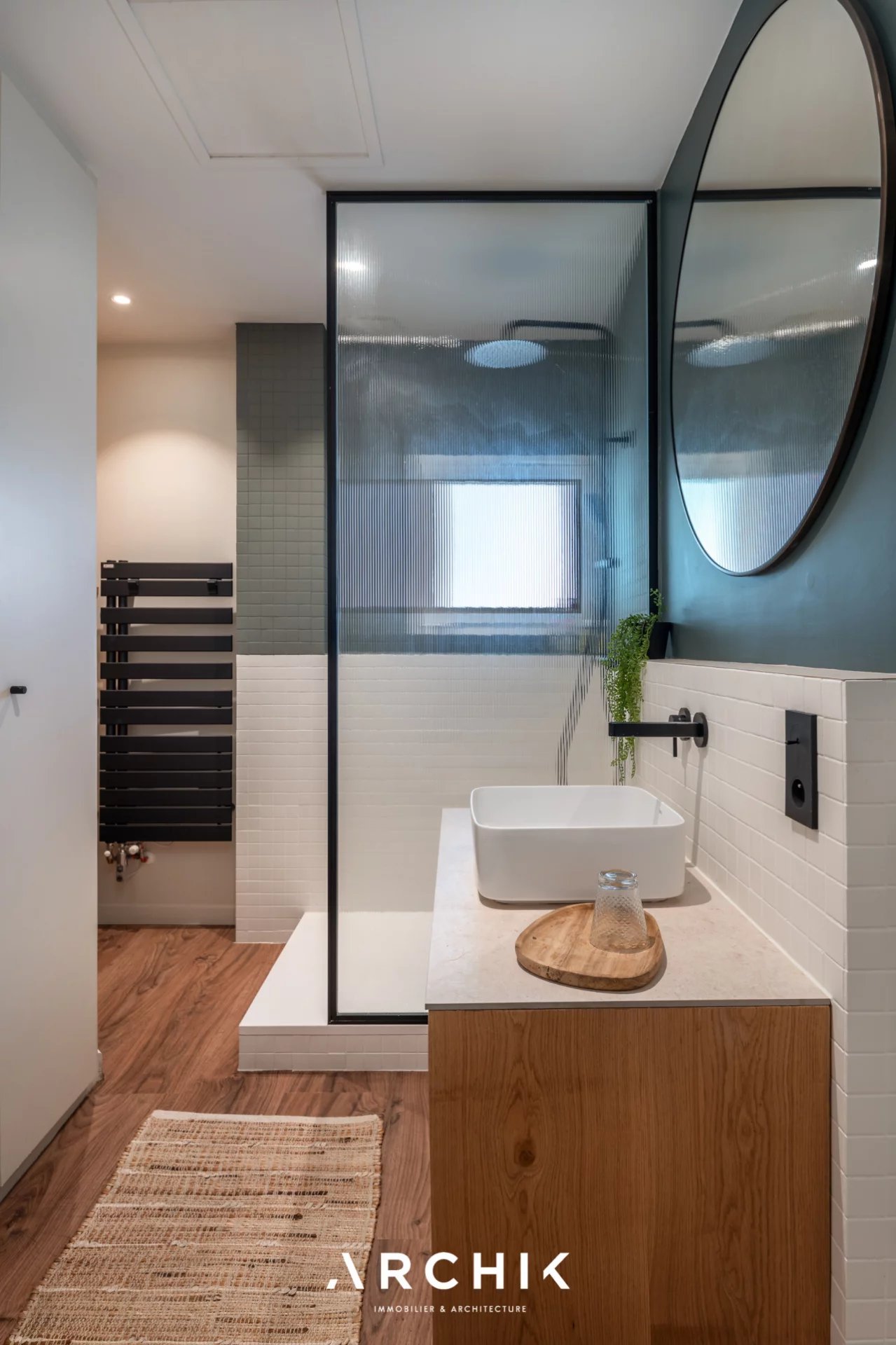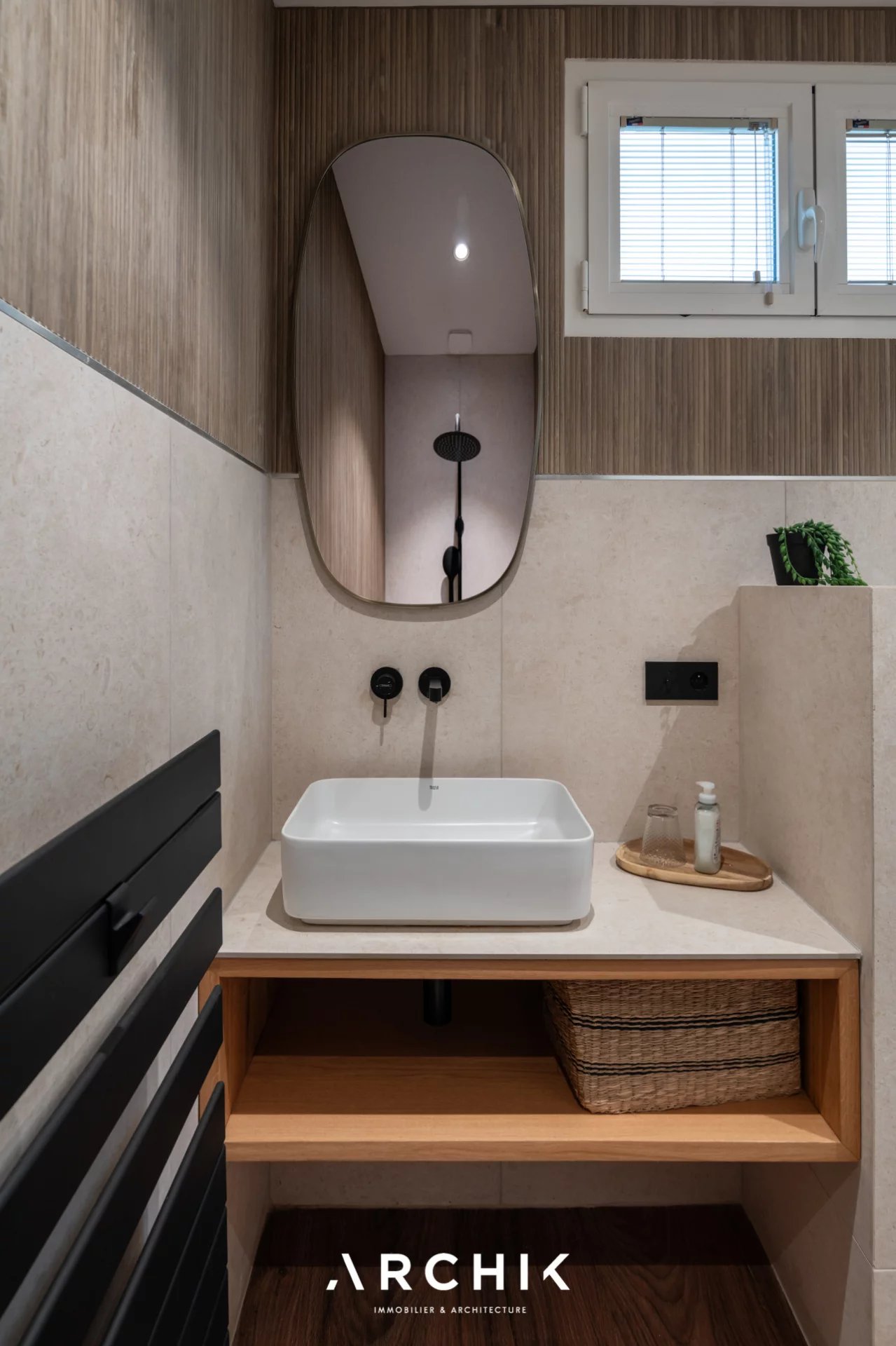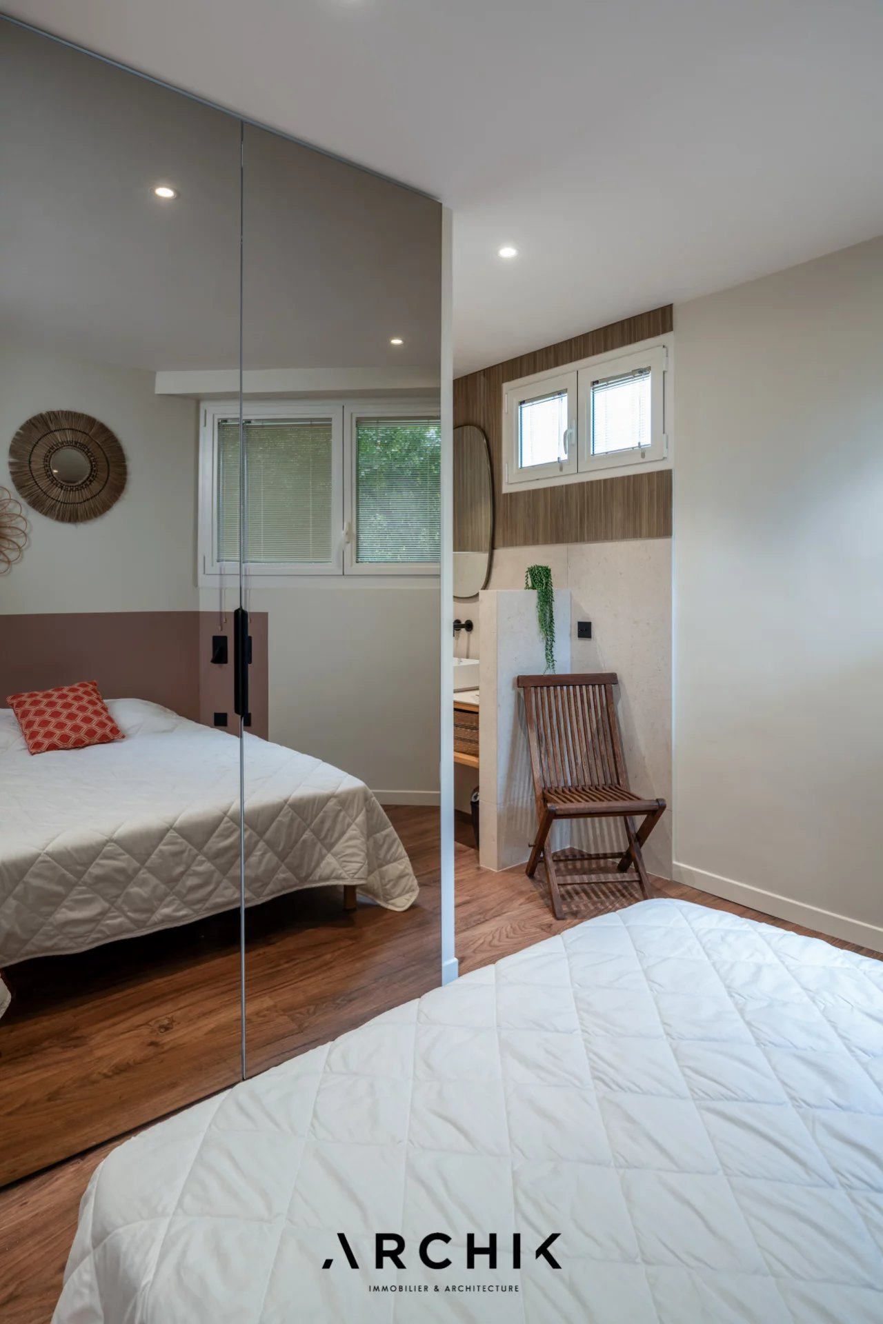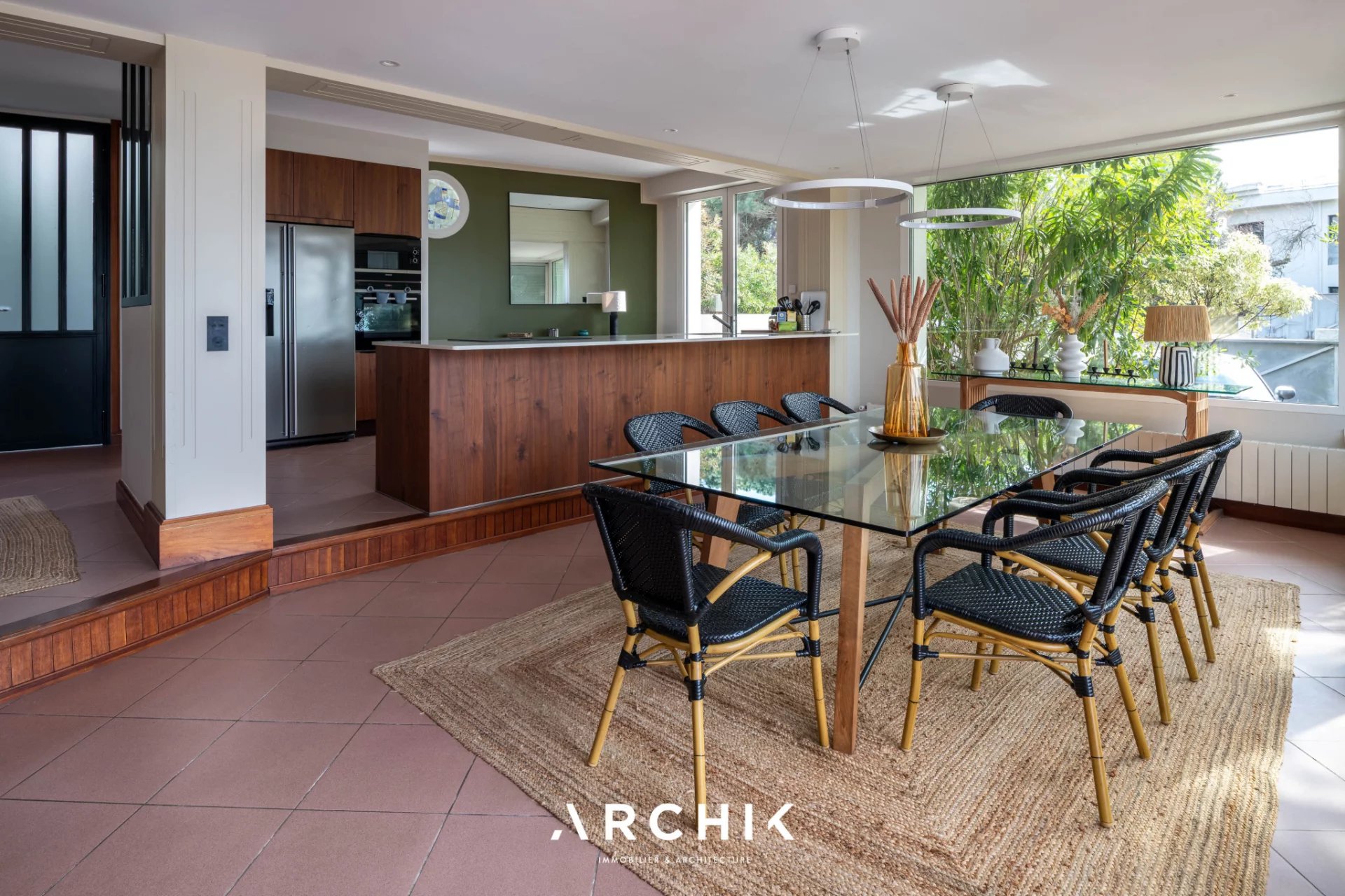 Entièrement rénovée en 2022, la maison offre des vues exceptionnelles sur le Bassin.Dès l'entrée le regard est attiré vers l'horizon à travers de grandes baies vitrées qui longent la façade coté salle à manger. Dans cette agréable pièce à vivre, un angle vitréaccueil une table pour 8 personnes,laissant filtrer la lumière du Sud à travers les feuillages. La cuisine entièrement équipée et revêtu d'un bois foncé est un emplacement privilégié avec son bar ouvert sur l'espace de vie afin de profiter de la vue.Le salon, enveloppé de lambris bois s'installe devant une cheminée en brique entre un grand bow-window qui encadre le paysage et un escalier hélicoïdal avec des pas en bois foncé tel une sculpture dans l'espace.Une chambre avec sa salle d'eau et une buanderie complètent ce premier niveau.