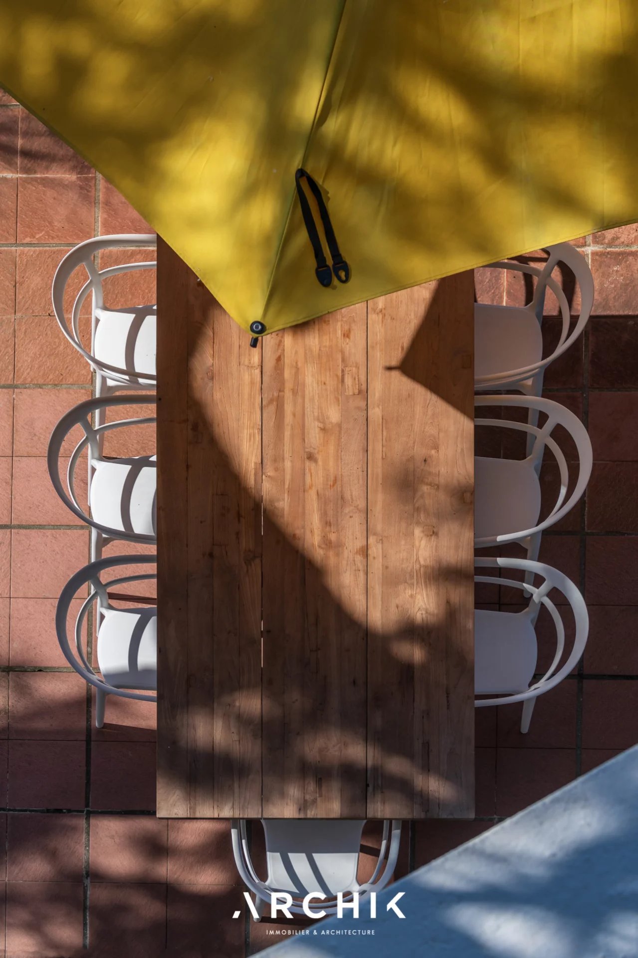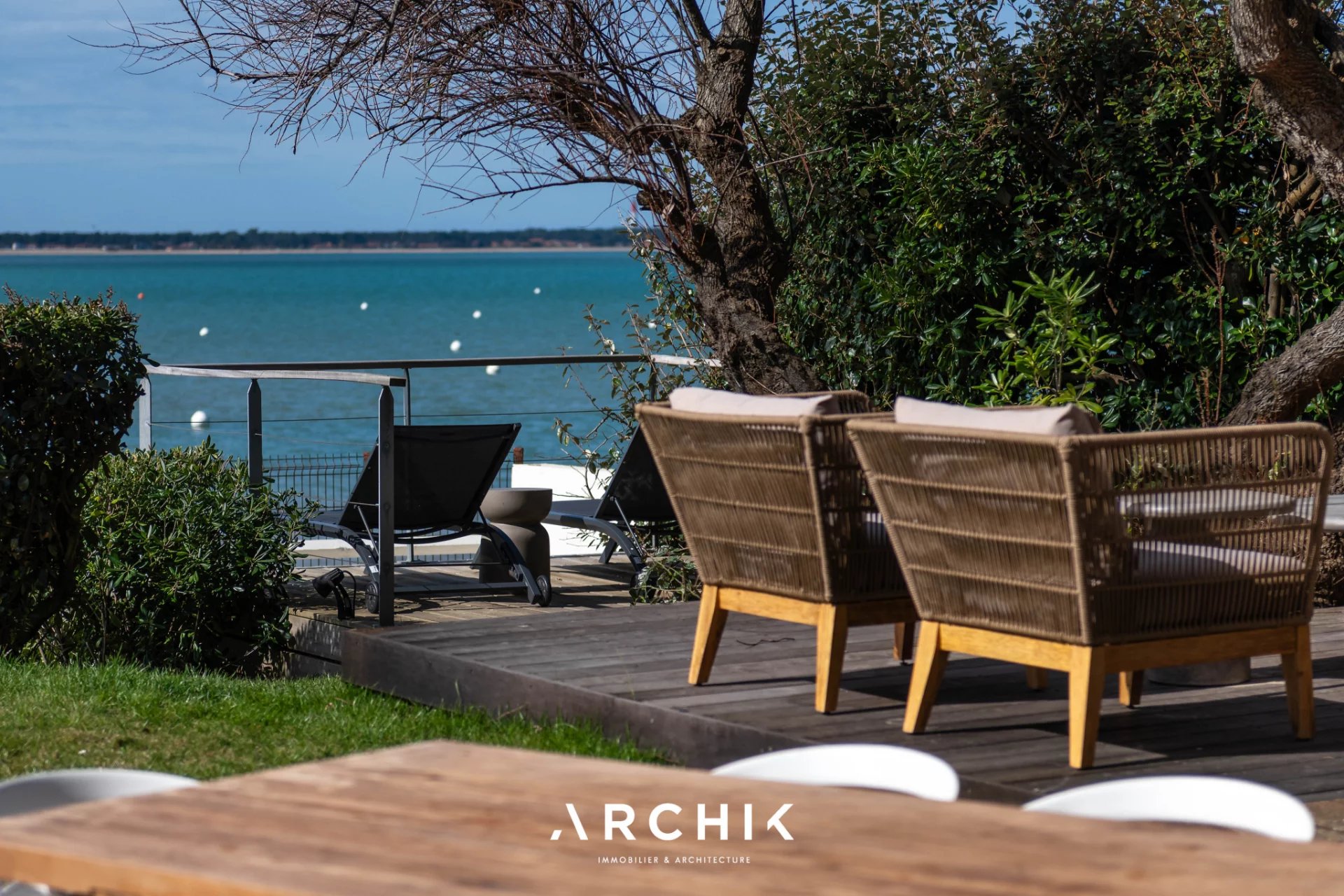 Le jardin, accolé à la plage est décoré par une végétation riche en essences locales. Ilest animé par un jeu de niveau permettant à chaque espace de profiter de la vue exceptionnelle. A proximité de la maison se trouve un espace dinatoire, un agréable salon extérieur sous l'ombre du Tamaris est élevé sur une estrade et en contre bas le perré privé aménagé avec des transats donne un accès direct à la plage.