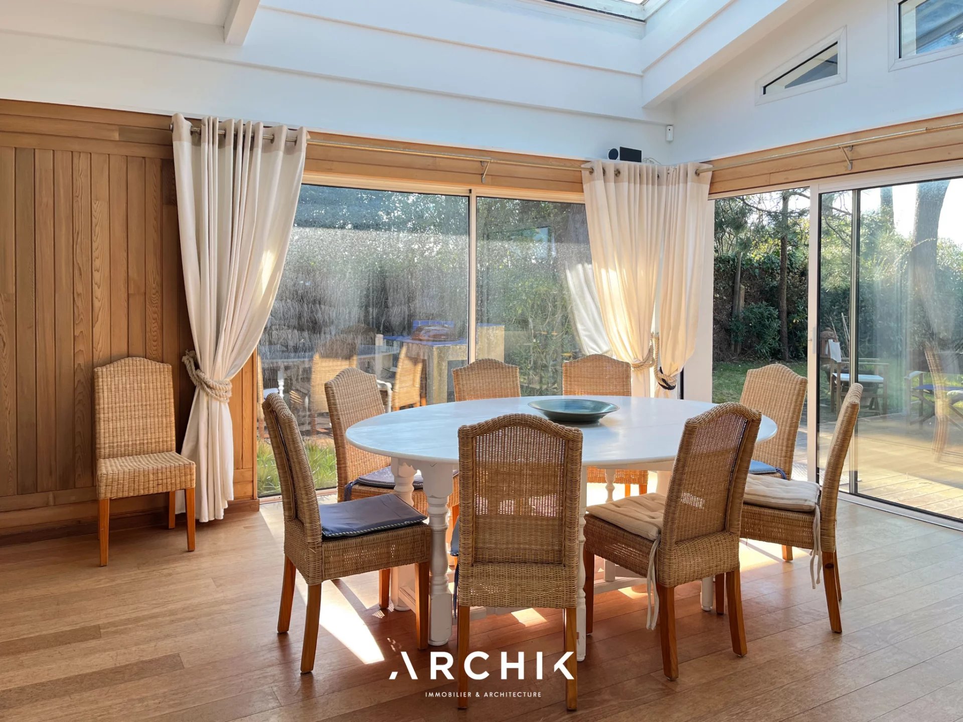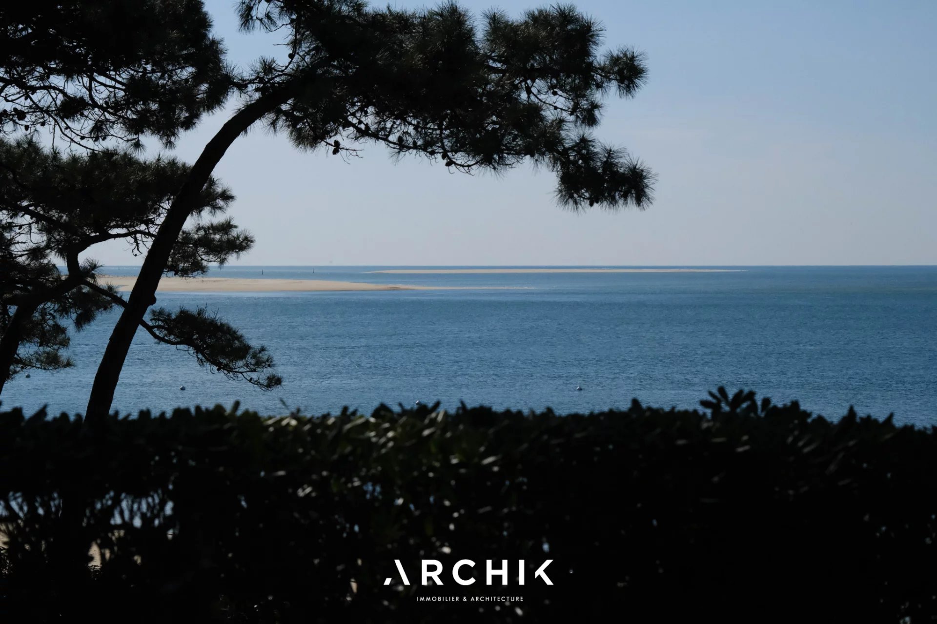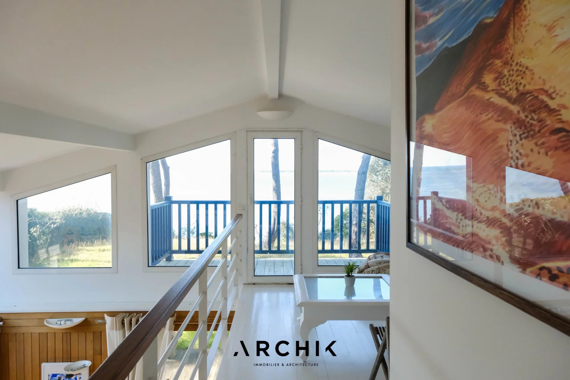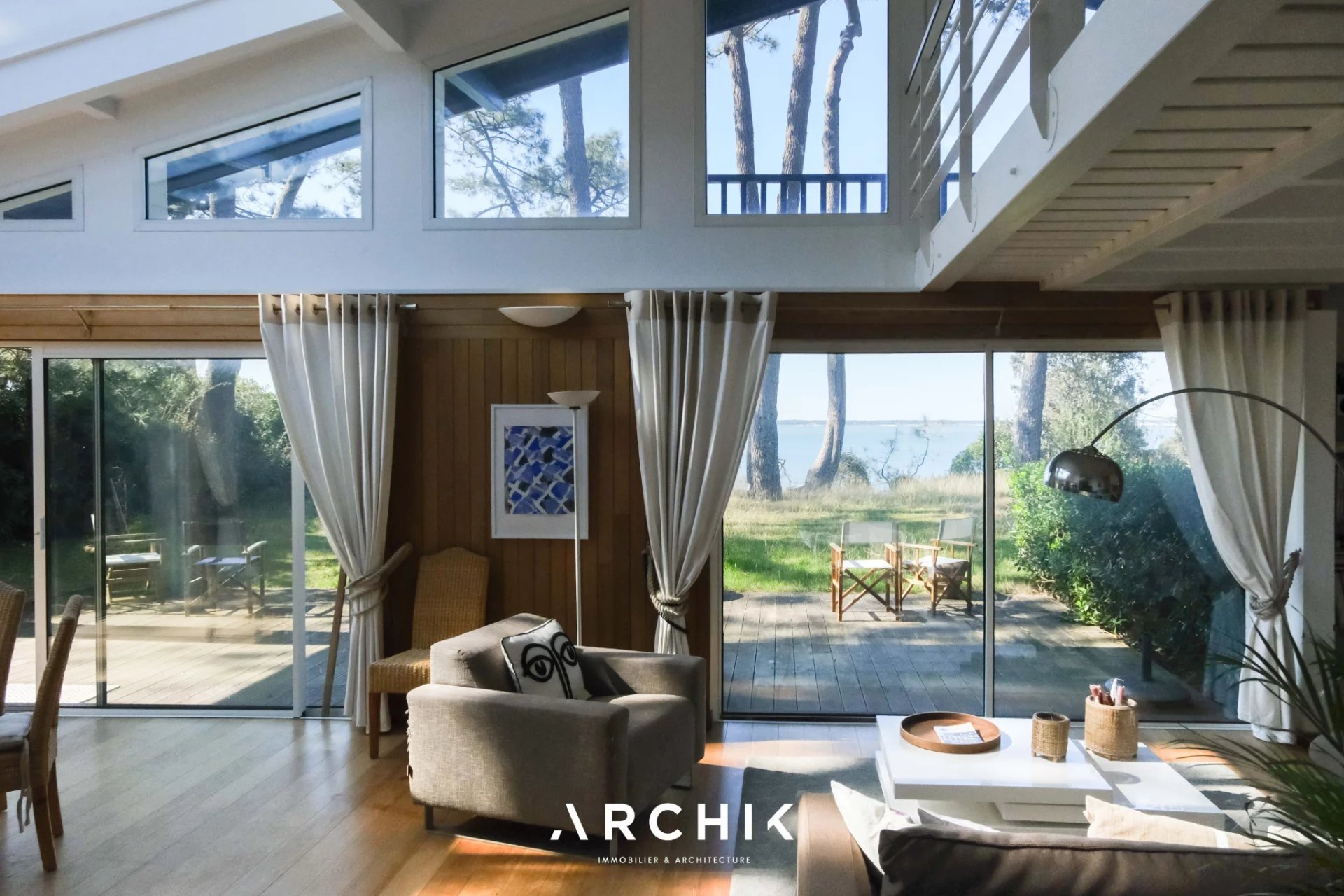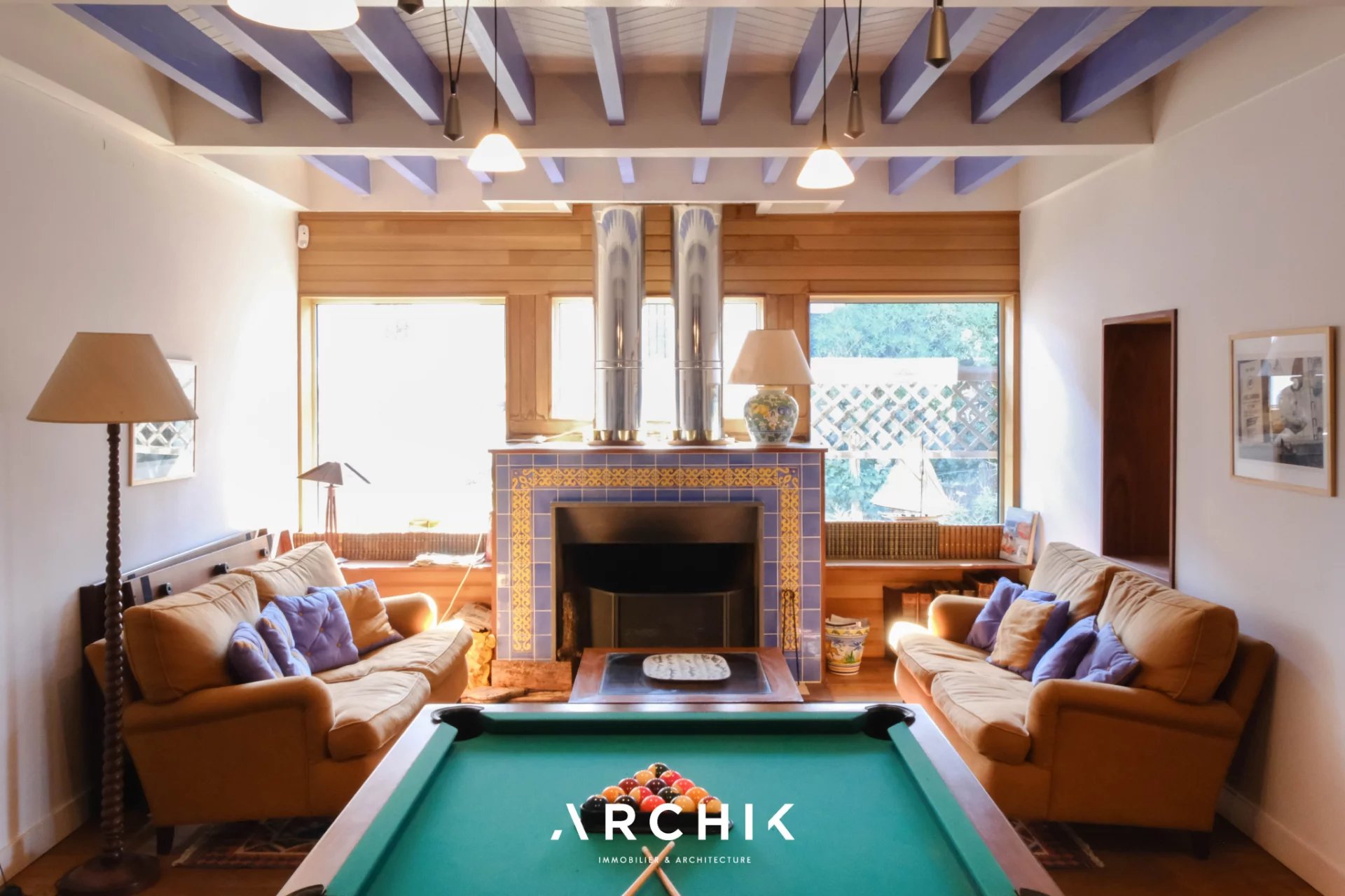 Pensée par un architecte italien, la maison profite de beaux volumes. En rez-de-jardin, la pièce de vie sous rampant s'ouvre sur la vue dégagée vers le Bassin et la pointe du Cap Ferret. Largement vitrée, la pièce est baignée de lumière avec l'espace repas sous une verrière, adossé à la cuisine entièrement équipée et semi ouverte. L'espace salon, face à la mer, se glisse sous une mezzanine en galerie qui surplombe l'espace de vie et sert de coin détente pour lire ou contempler la mer. Orienté vers le Bassin, le beau jardin arboré s'étend jusqu'au perré privé entièrement aménagé avec une douche de plage, une cuisine équipée, une voile d'ombrage et du mobilier pour profiter pleinement de la plage même à marée haute. Un deuxième salon avec cheminée et billard invite à la convivialité en soirée ou en mi-saison.