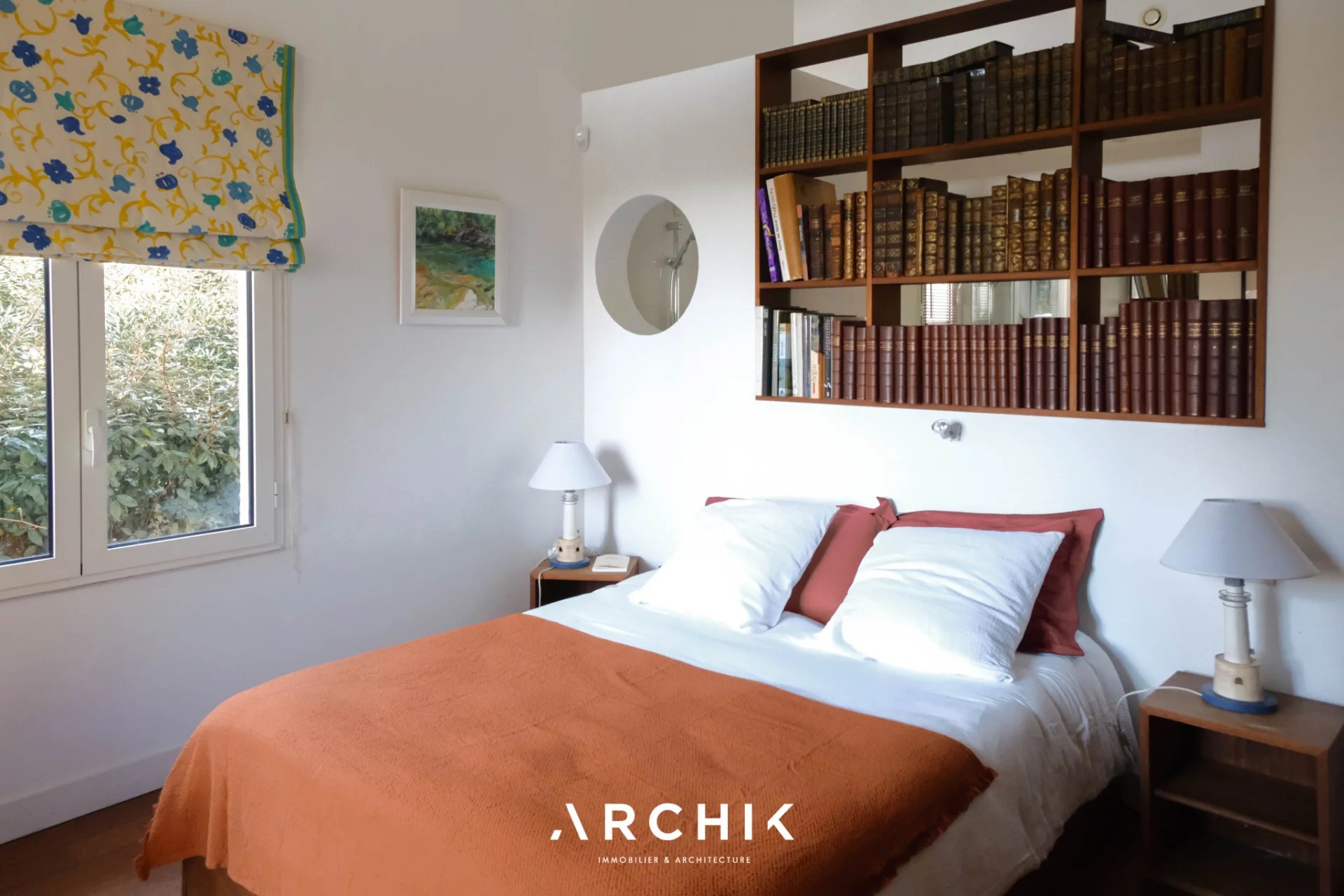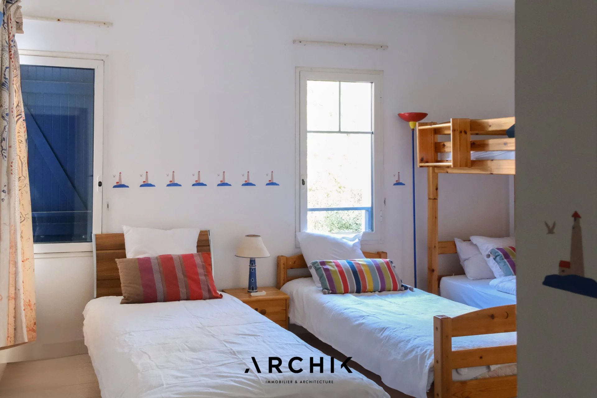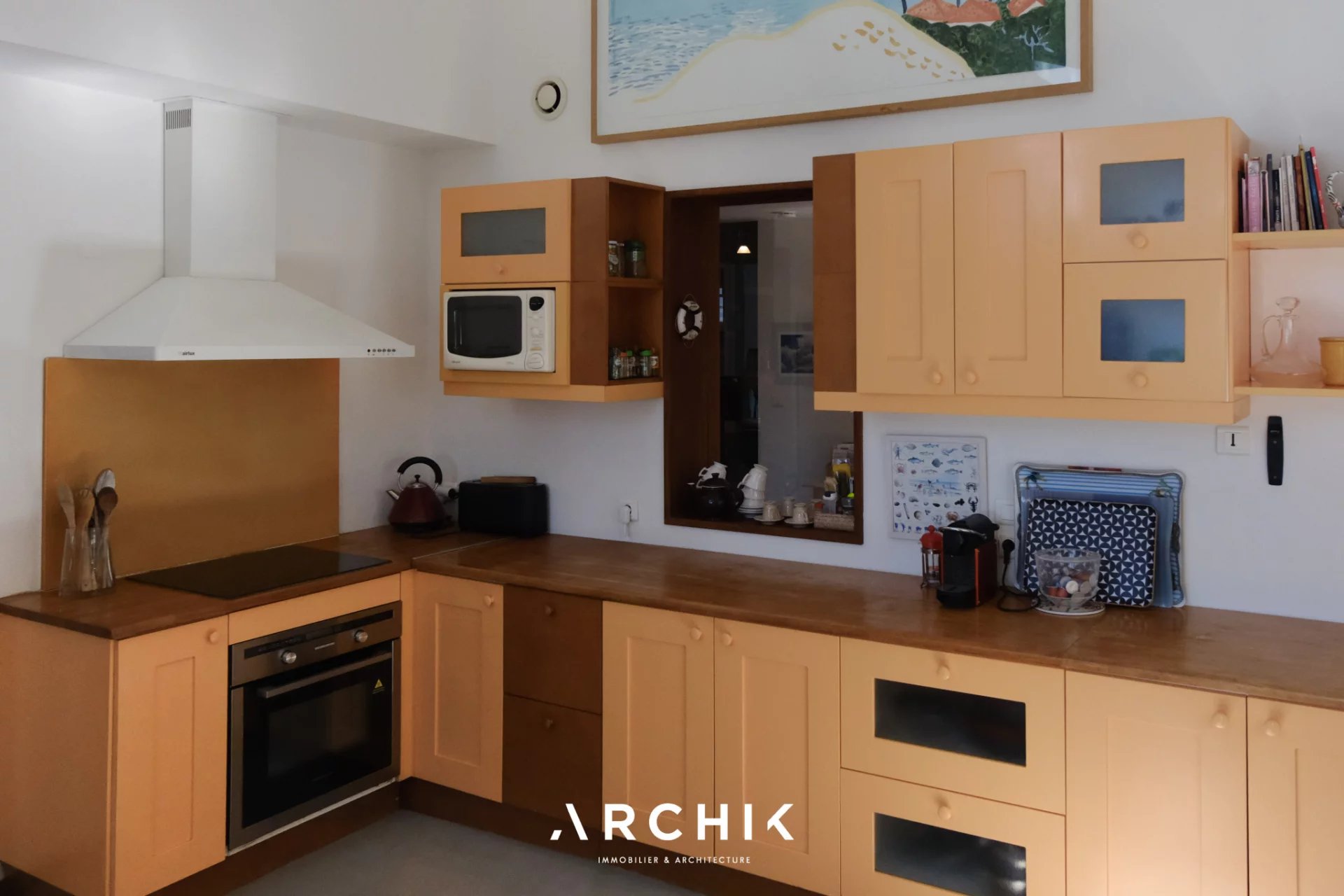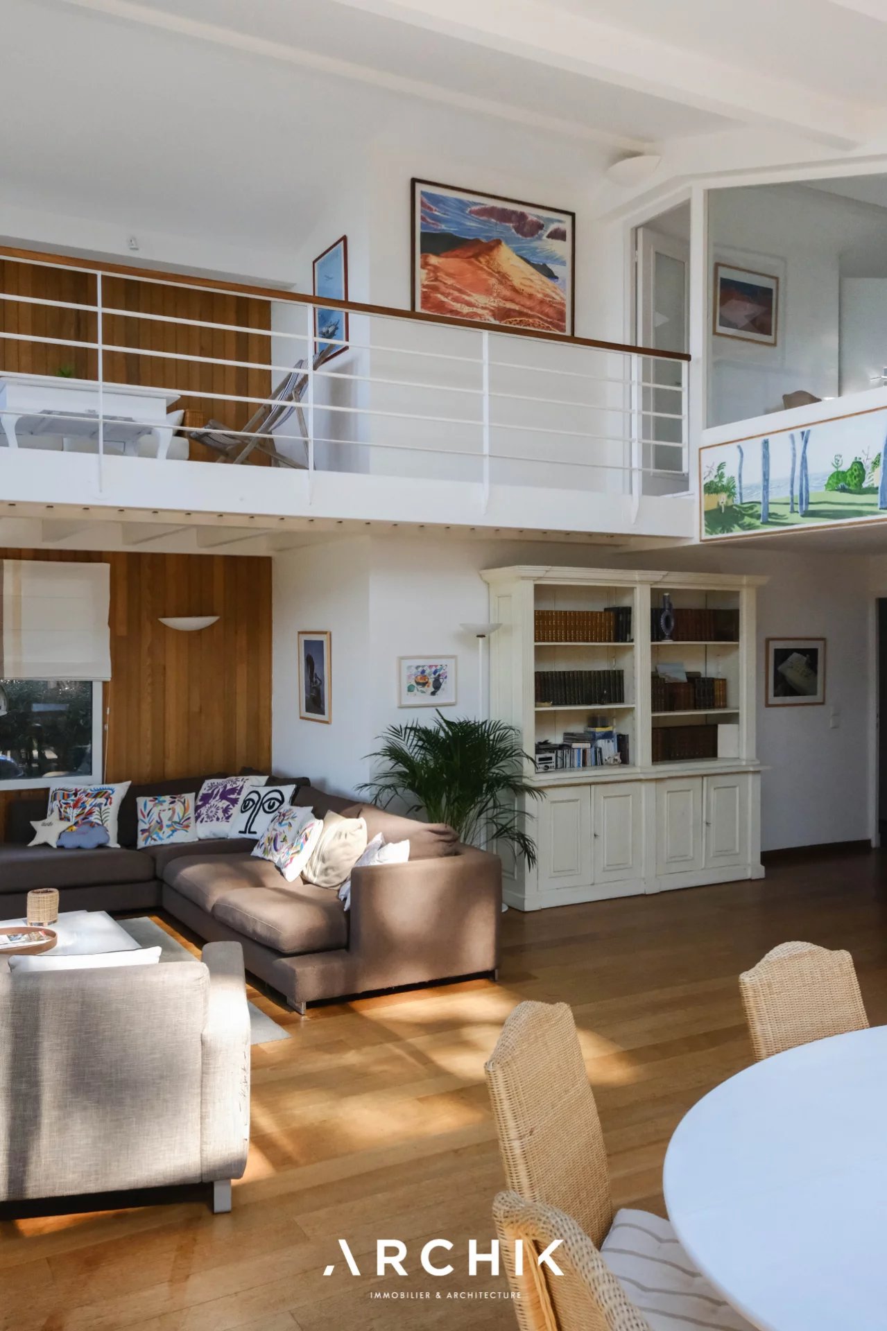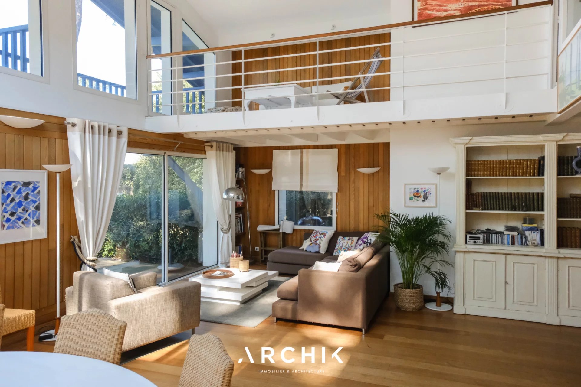 Pensée par un architecte italien, la maison profite de beaux volumes. En rez-de-jardin, la pièce de vie sous rampant s'ouvre sur la vue dégagée vers le Bassin et la pointe du Cap Ferret. Largement vitrée, la pièce est baignée de lumière avec l'espace repas sous une verrière, adossé à la cuisine entièrement équipée et semi ouverte. L'espace salon, face à la mer, se glisse sous une mezzanine en galerie qui surplombe l'espace de vie et sert de coin détente pour lire ou contempler la mer. Orienté vers le Bassin, le beau jardin arboré s'étend jusqu'au perré privé entièrement aménagé avec une douche de plage, une cuisine équipée, une voile d'ombrage et du mobilier pour profiter pleinement de la plage même à marée haute. Un deuxième salon avec cheminée et billard invite à la convivialité en soirée ou en mi-saison.
