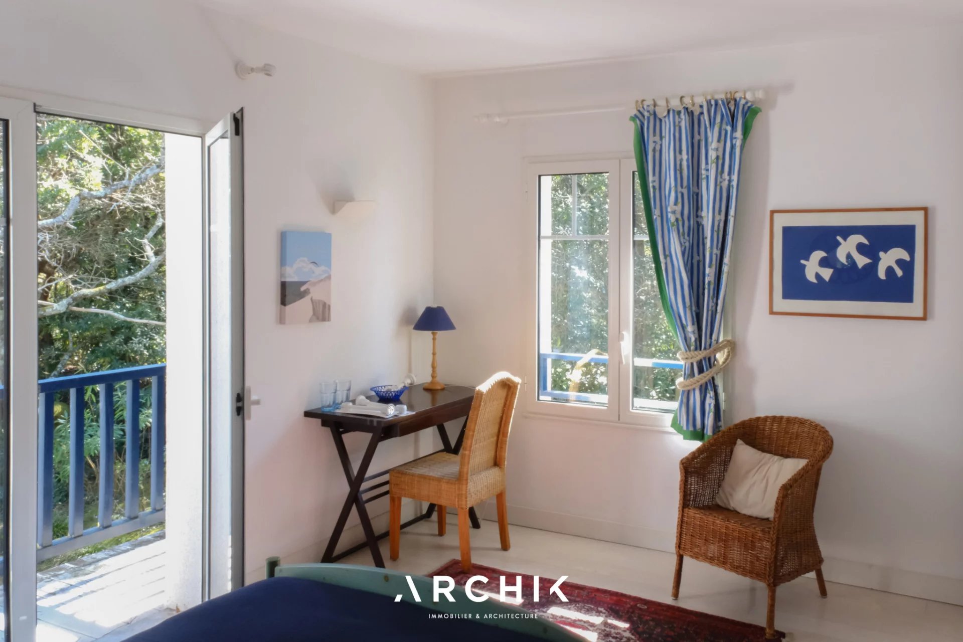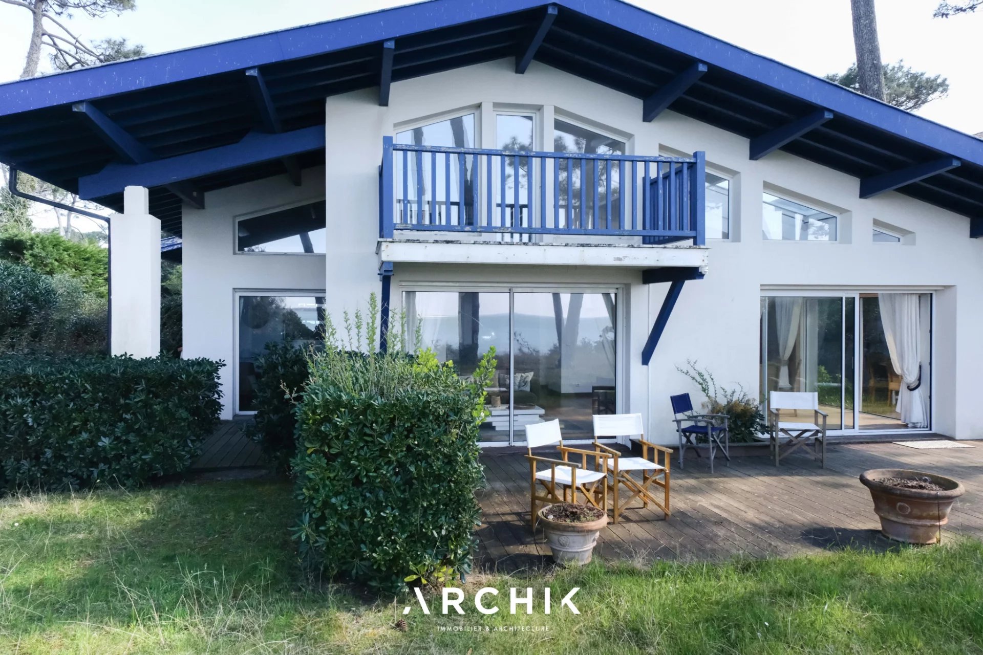 Architecture des années 80, cette maison de 280 m2 est bâtie sur un terrain arboré de 2 200 m2 en première ligne, au coeur du quartier Haïtza du Pyla avec son perré privatif et son accès direct à la plage. en retrait de la route nichée sous les pins.