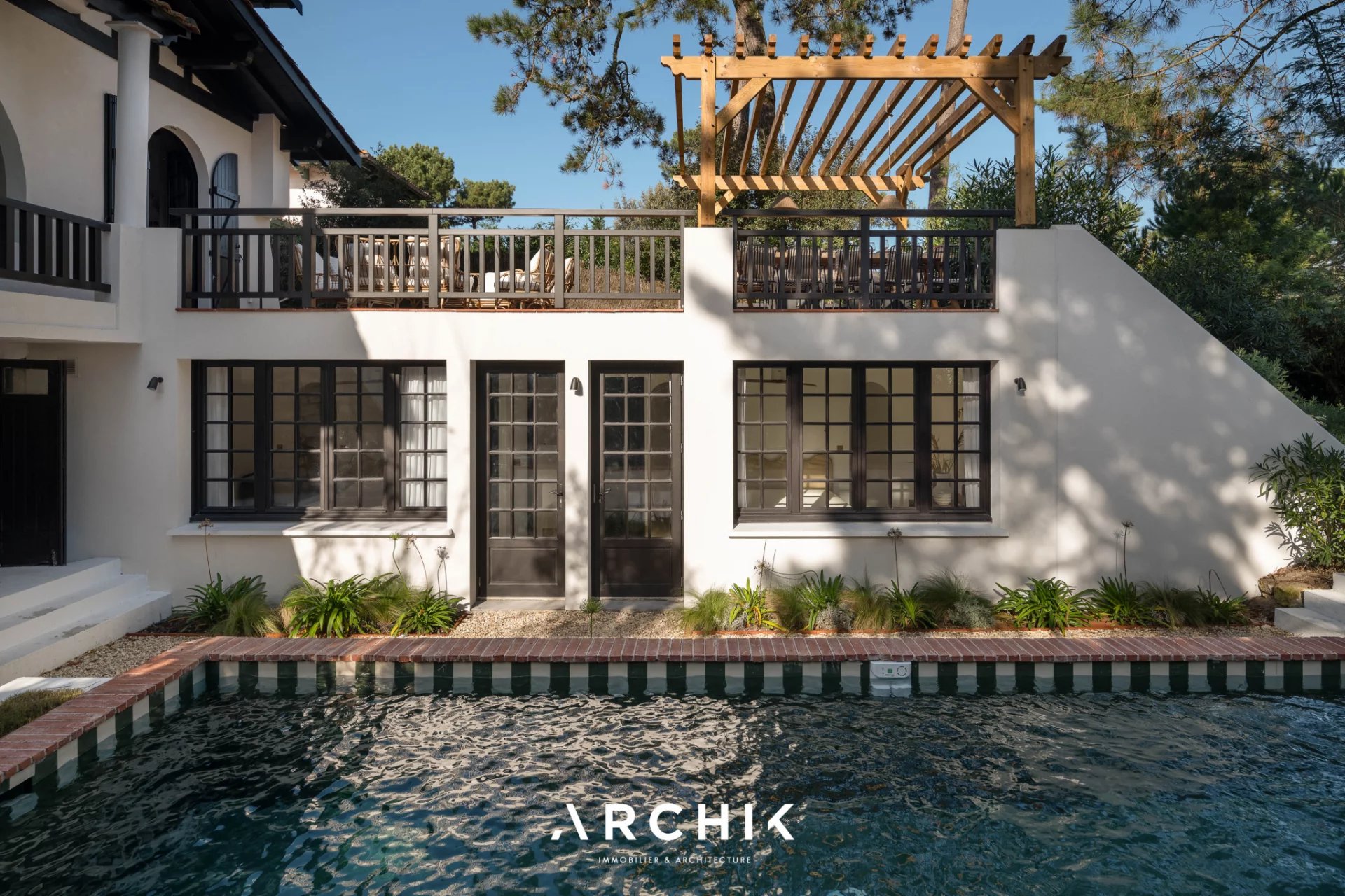 Architecture des années 30 d'inspiration néo basque, cette maison de 220 m2 en 2ème ligne du Bassin sur un terrain de 740 m2 fait partie des premières maisons bâties au Pyla sur Mer et dispose d'un accès privé à un chemin qui conduit à la plage.