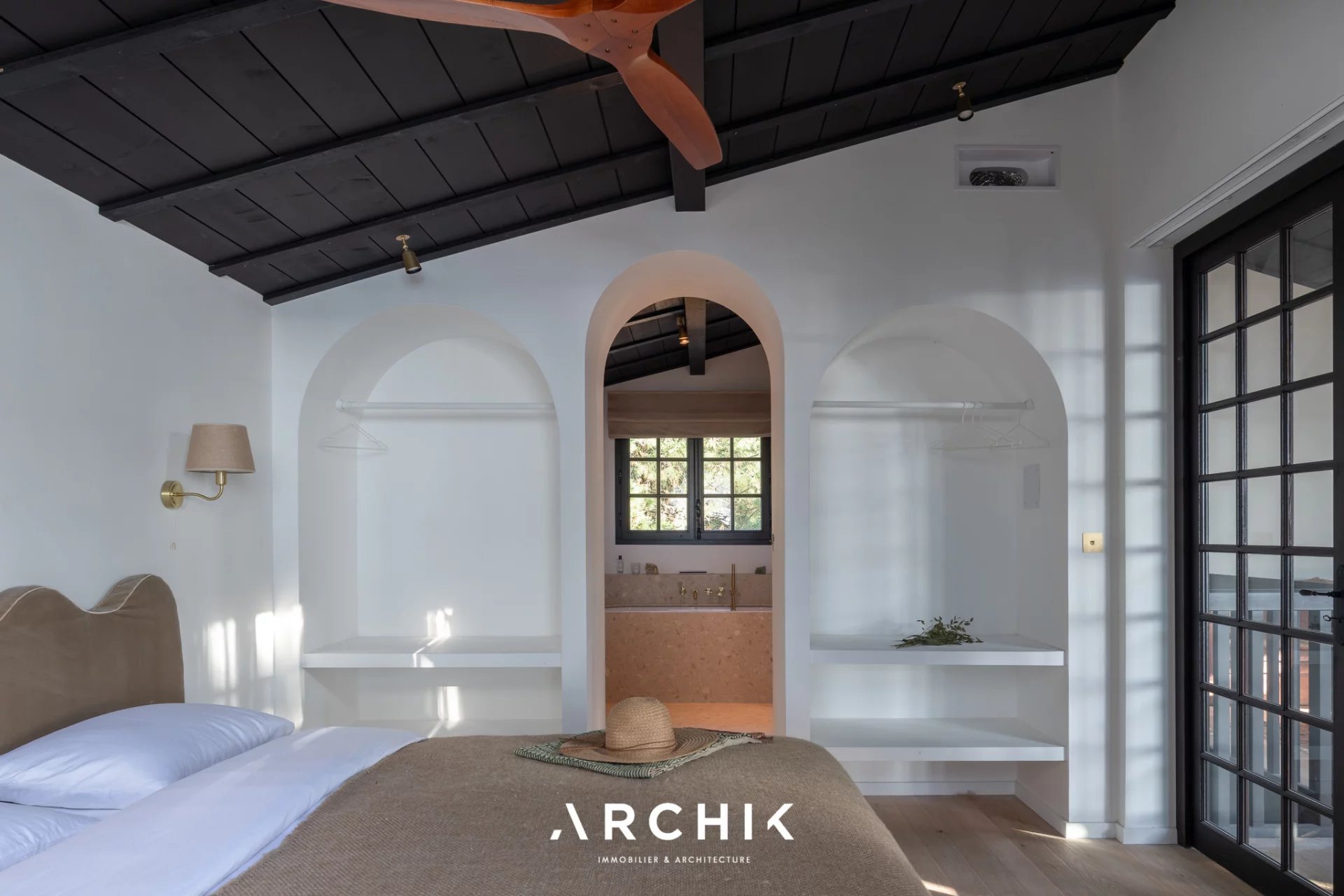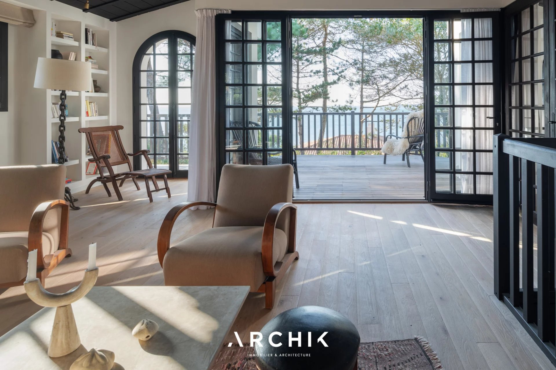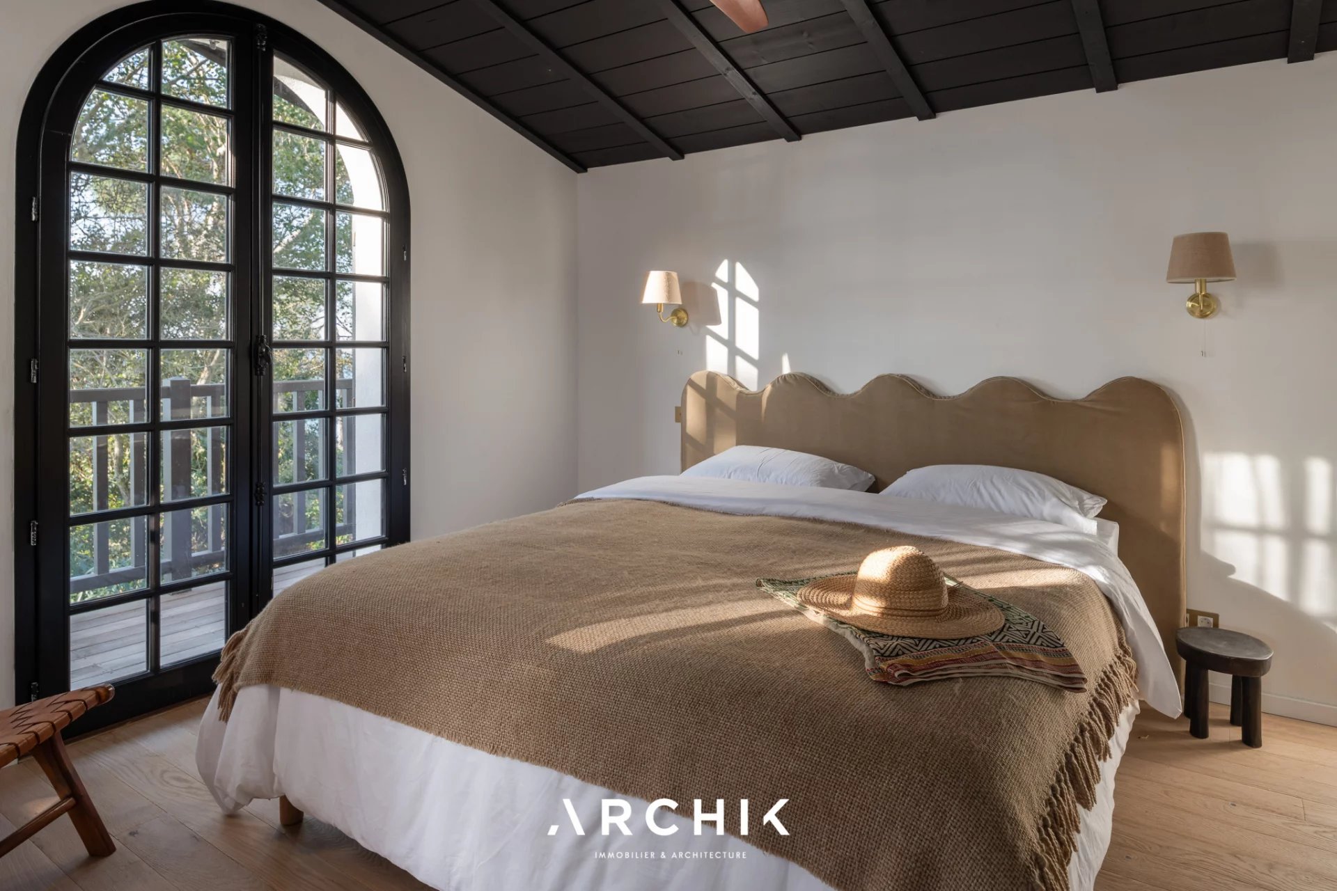 Entièrement rénovée avec succès par l'architecte Theresa Brunvoll-Cochet en 2024 qui a réussi à créer un équilibre entre les parties anciennes et les éléments contemporains perpétuant ainsi l'histoire de la bâtisse. Au rez-de-jardin et face à la piscine carrelée, bordée de briquettes, une extension abritant deux suites indépendantes, est surplombée par une vaste terrasse en terre cuite aménagée d'une pergola. Le premier niveau est occupé par une belle pièce à vivre bordée par un bow window tourné vers l'océan, une cuisine ouverte habillée de bois et de marbre ainsi que trois chambres avec chacune sa salle d'eau. Au dernier étage, le salon cosy avec cheminée est prolongé par une terrasse offrant une très belle vue sur le Bassin. Une grande suite avec dressing et salle de bains complète ce niveau qui invite à la détente. Le bois souvent peint en noir souligne les espaces et met en valeur l'ensemble des aménagements réalisés. Les arrondies des ouvertures extérieures et intérieures s'imposent comme un fil conducteur qui rythme l'ensemble. A l'extérieur, le jardin aux essences locales, associé aux terrasses et à la piscine chauffée permettent de profiter pleinement de cette maison hors du temps et de son environnement privilégié. Disponible à la location saisonnière toute l'année, capacité d'accueil 12 personnes.