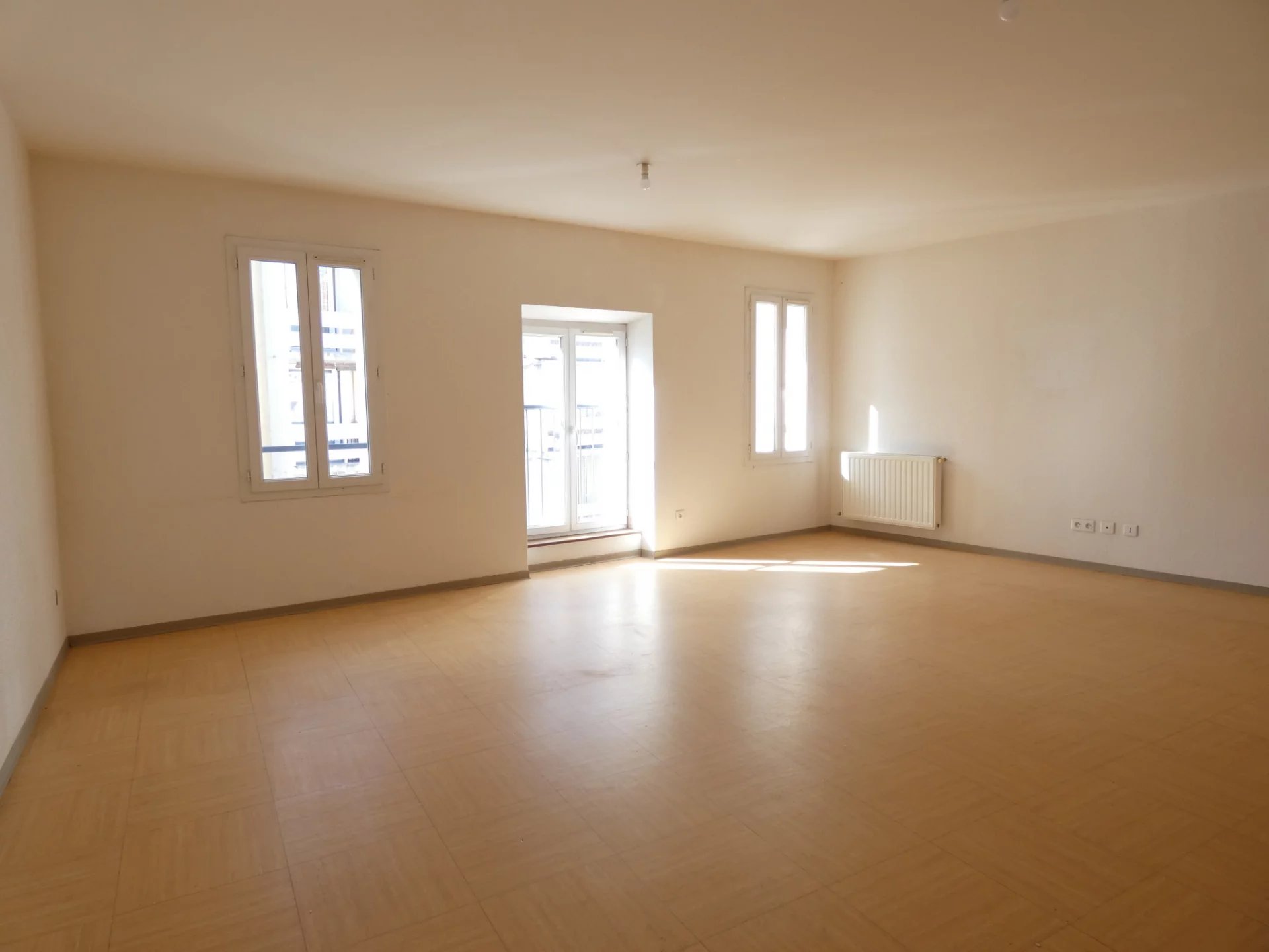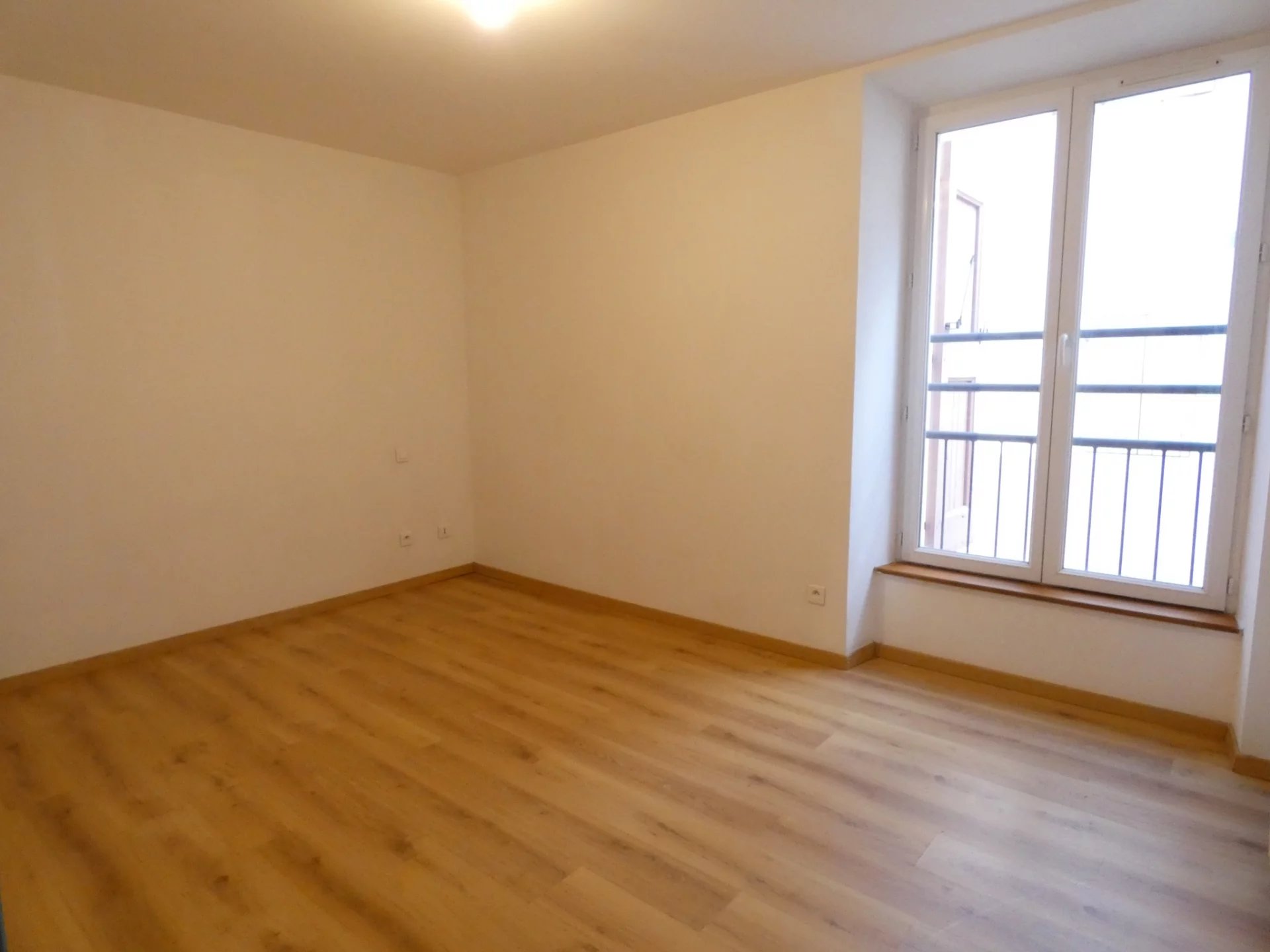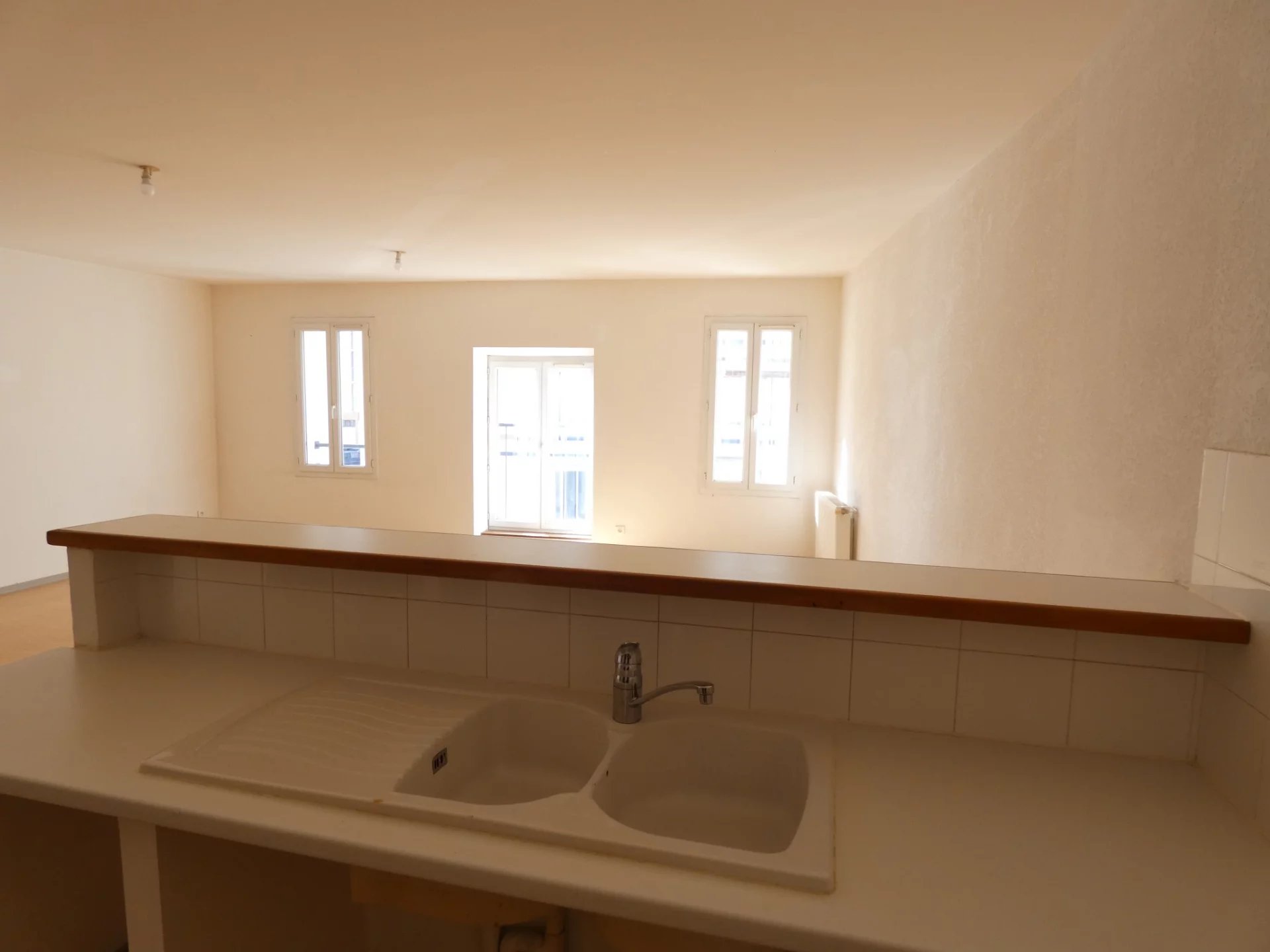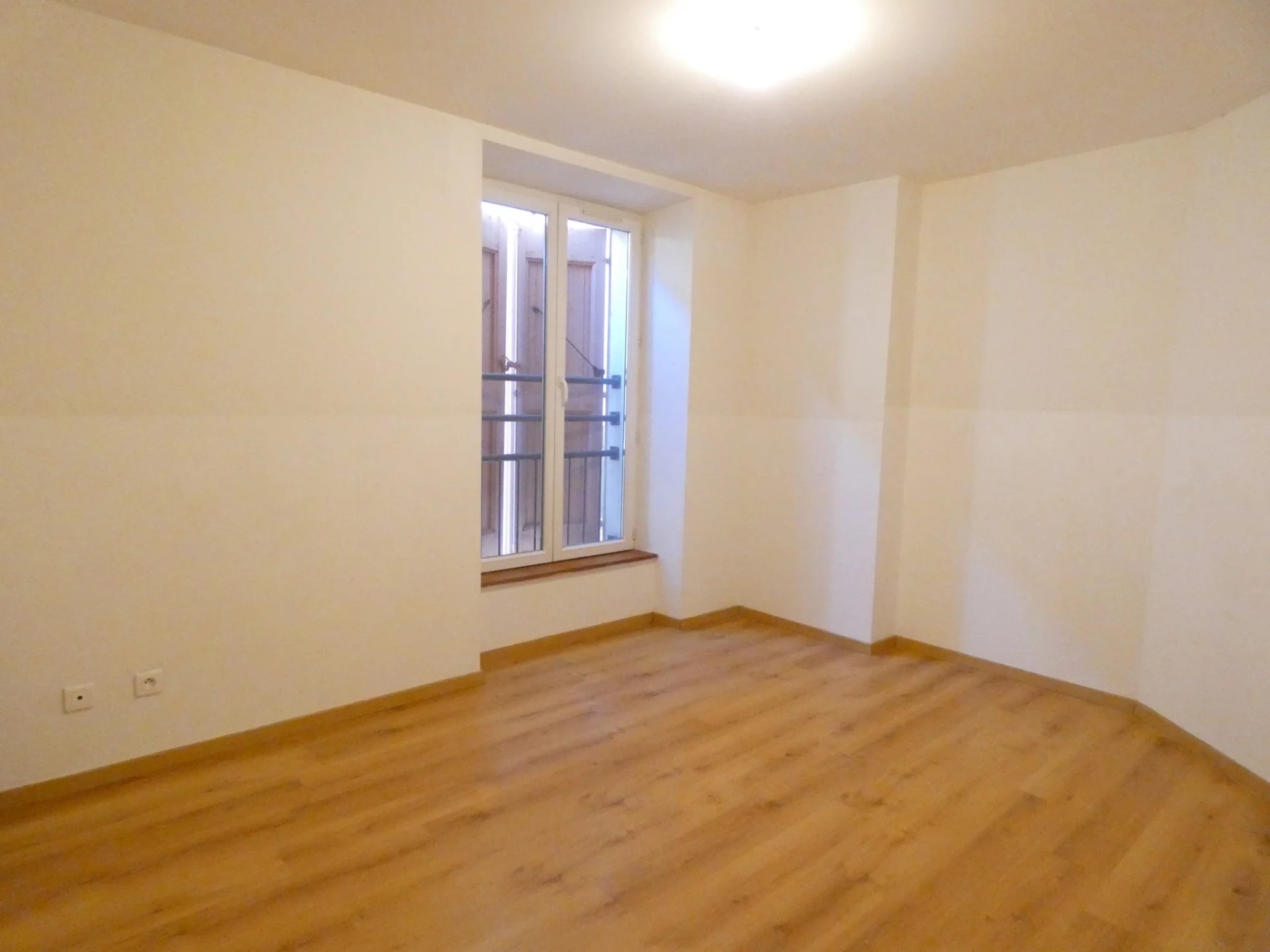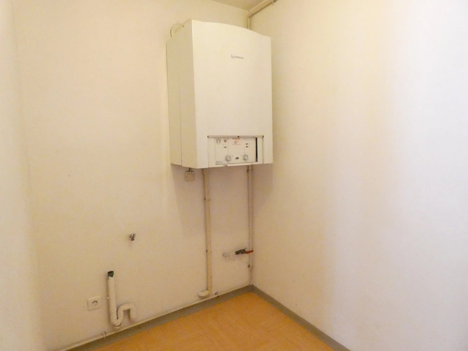 Alès, Grand'rue, proximité des Halles de l'Abbaye, type 3 au 2ème étage : Entrée/dégagement avec placard, séjour avec coin cuisine américain, cellier, deux chambres dont une avec placard, salle de bains, toilettes. Local à vélos et poussettes. interphone. Chauffage central gaz de ville.