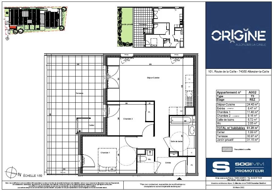 Ce logement moderne livré en 2024 comprend une cuisine équipée ouverte sur un lumineux séjour, une salle de douche, deux chambres avec placards intégrés ainsi qu'une terrasse de 30 m² avec son cellier et son jardin privatif de 30 m² supplémentaires.