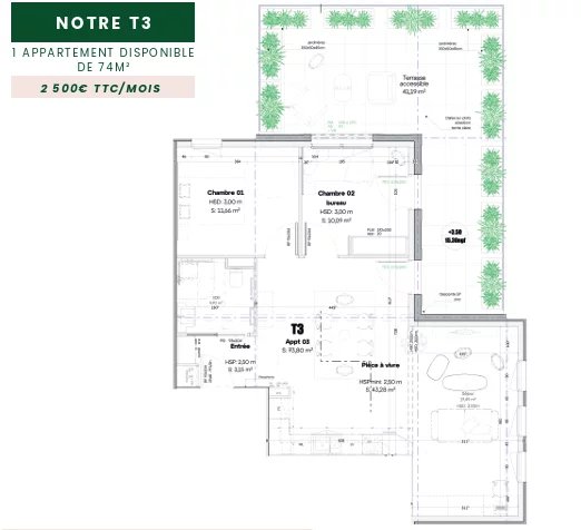 Prestations incluses : - Emplacement vélos - Accès sécurisé et vidéosurveillance - Parcours de santé dans le parc - Réseau wifi très haut débit - Entretien des espaces verts et des parties communes