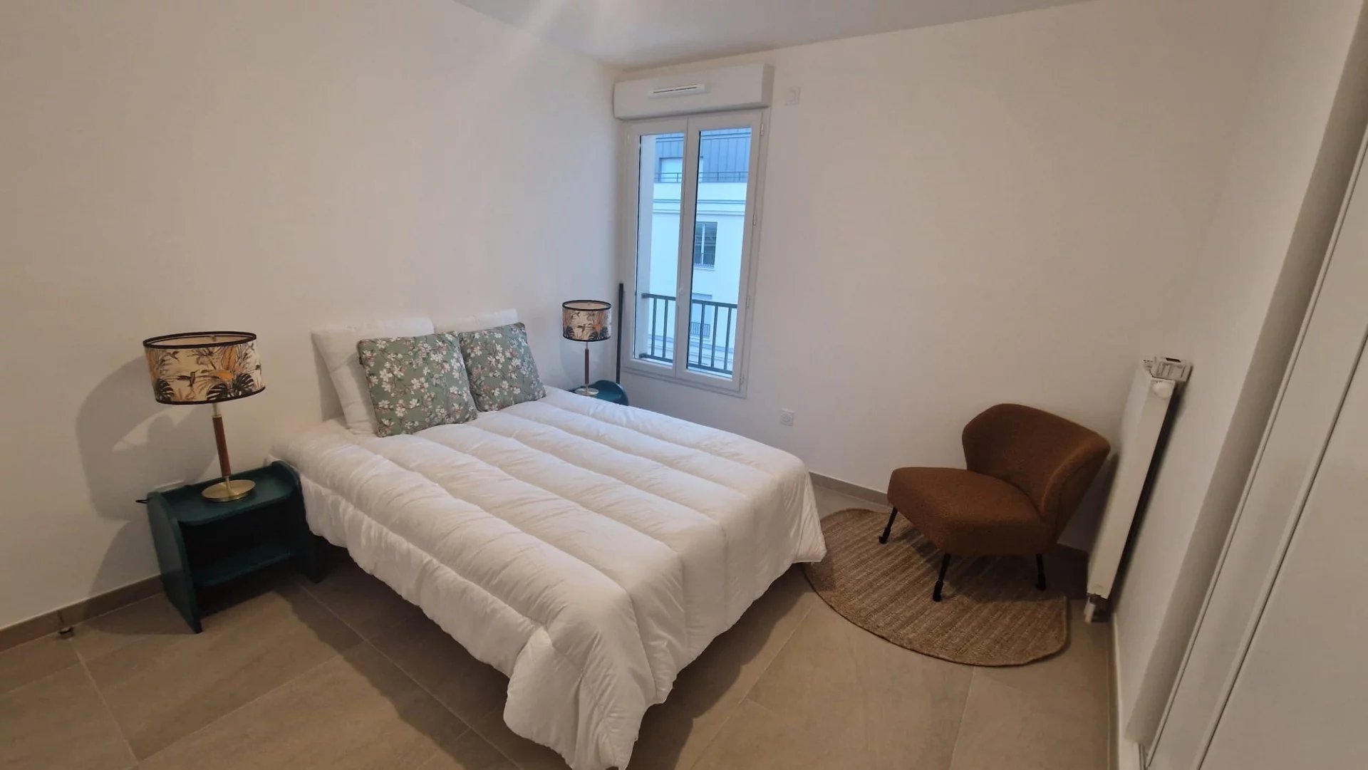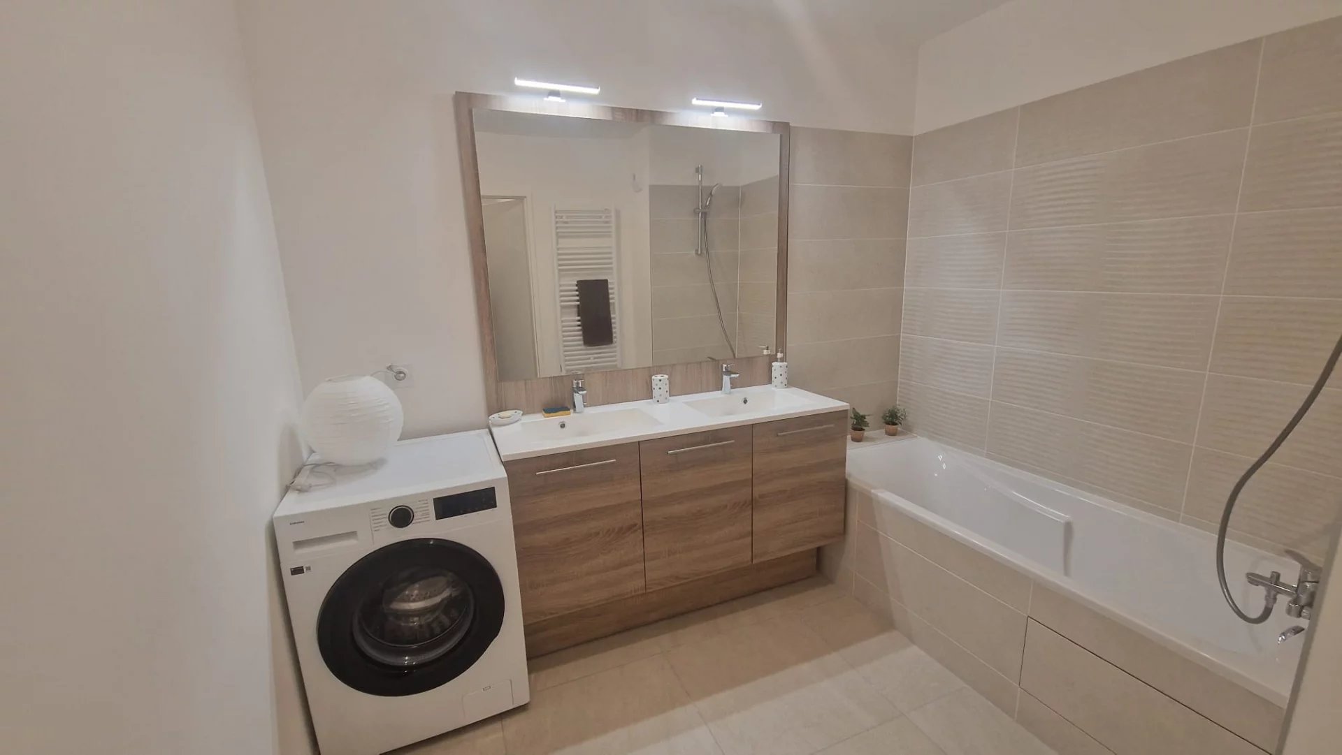 A deux pas de la mairie, école élémentaire et commerces, bel appartement 3 pièces meublé avec terrasse exposée sud/sud-ouest. Il dispose d'une entrée avec placard, un séjour donnant sur la terrasse de plus de 5m² avec cuisine ouverte équipée, un dégagement avec 2 chambres et une salle de bains double vasque et des wc séparés. Au sous-sol, un garage double complète ce bien neuf.