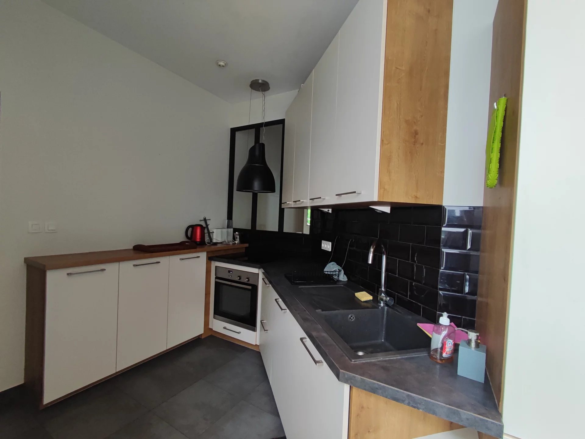 - Au rez-de-chaussée : entrée avec placard, chambre avec salle d'eau, salon-séjour avec sa cheminée décorative, cuisine aménagée et équipée (plaque, hotte, four, lave-vaisselle, réfrigérateur et congélateur), coin buanderie avec machine à laver, WC.
