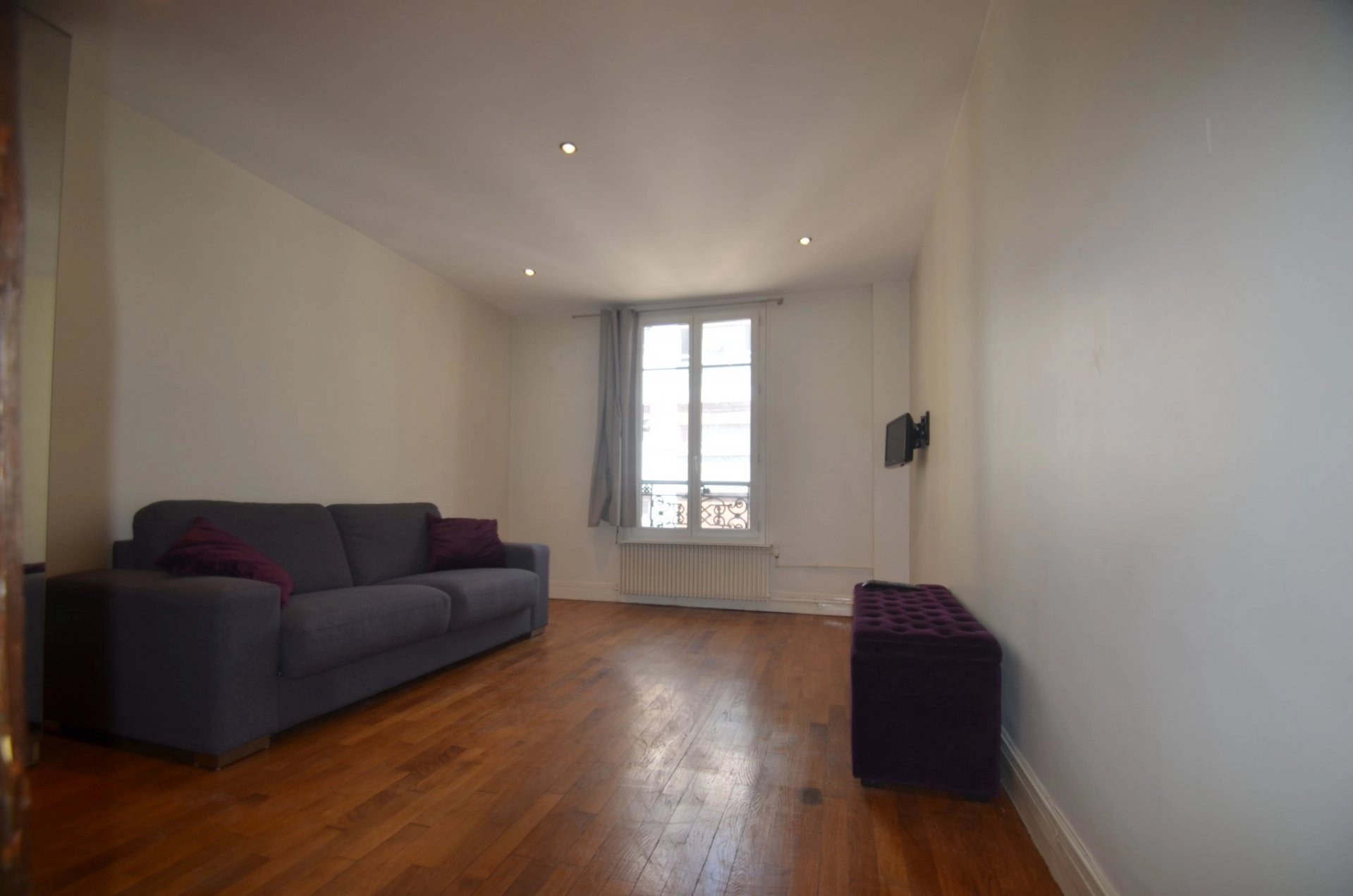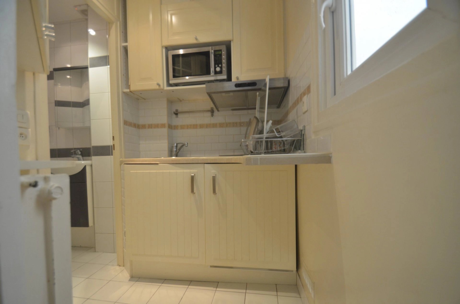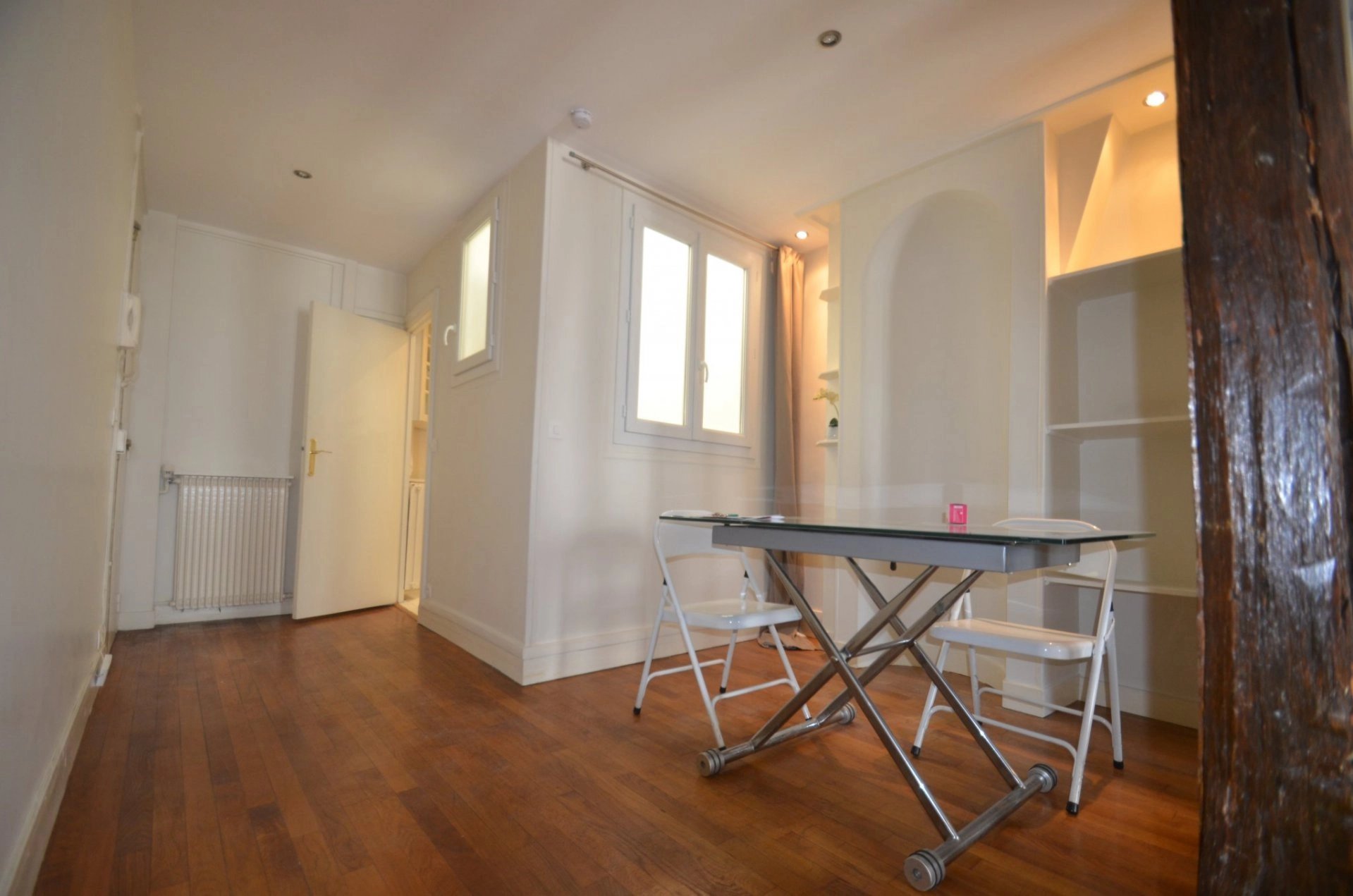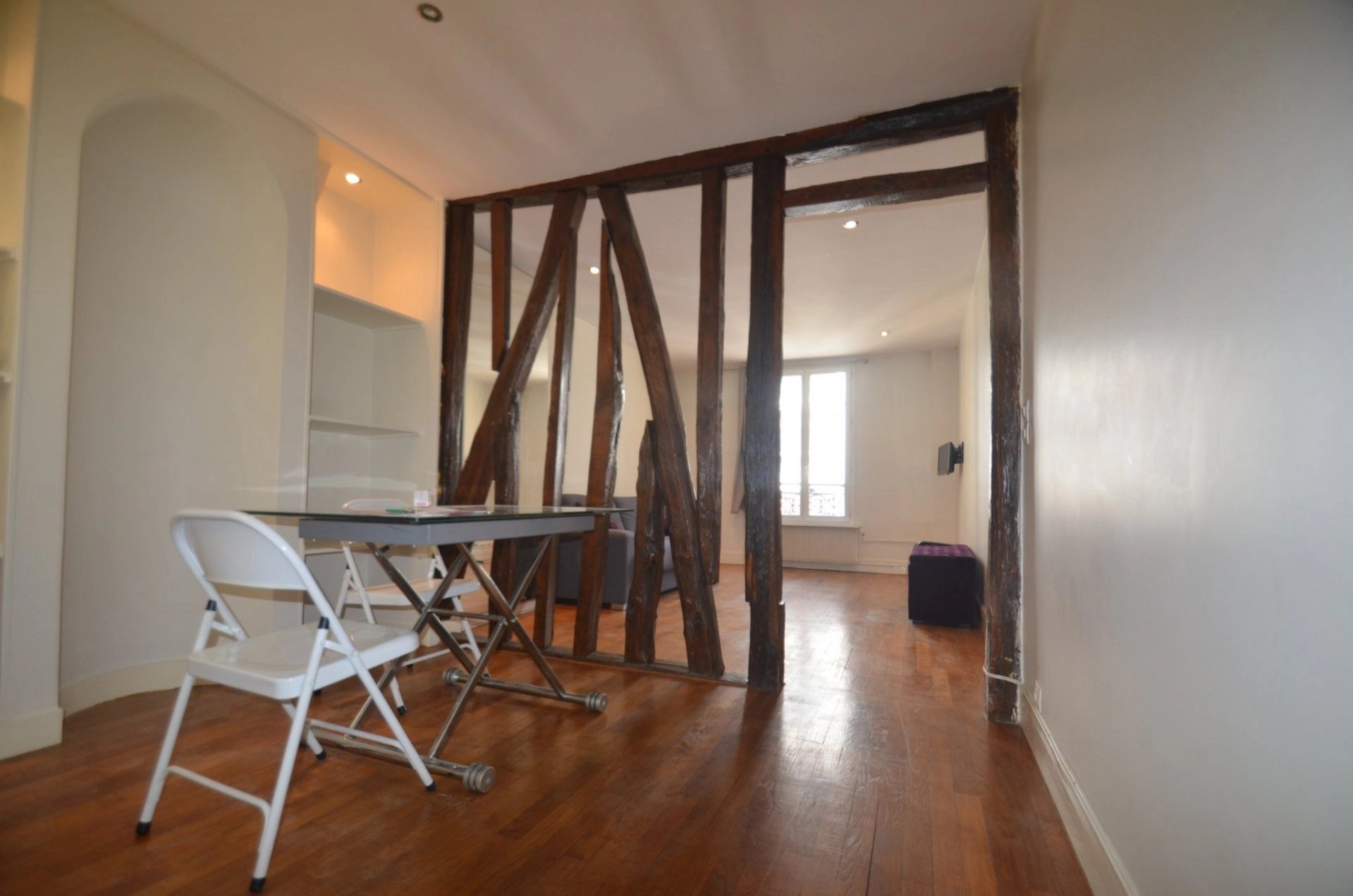 Mo Villers. Dans un bel immeuble ancien au 3ème étage sans ascenseur sur rue et cour un appartement comprenant une entrée un séjour donnant sur rue un coin salle à manger une cuisine séparée équipée une salle d'eau avec WC. Parquet au sol. Poutres apparentes. Chauffage collectif. Bon état.