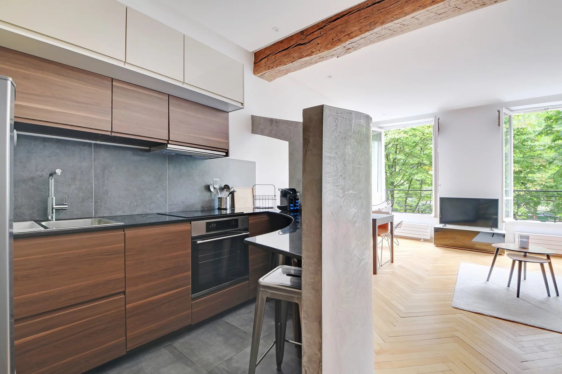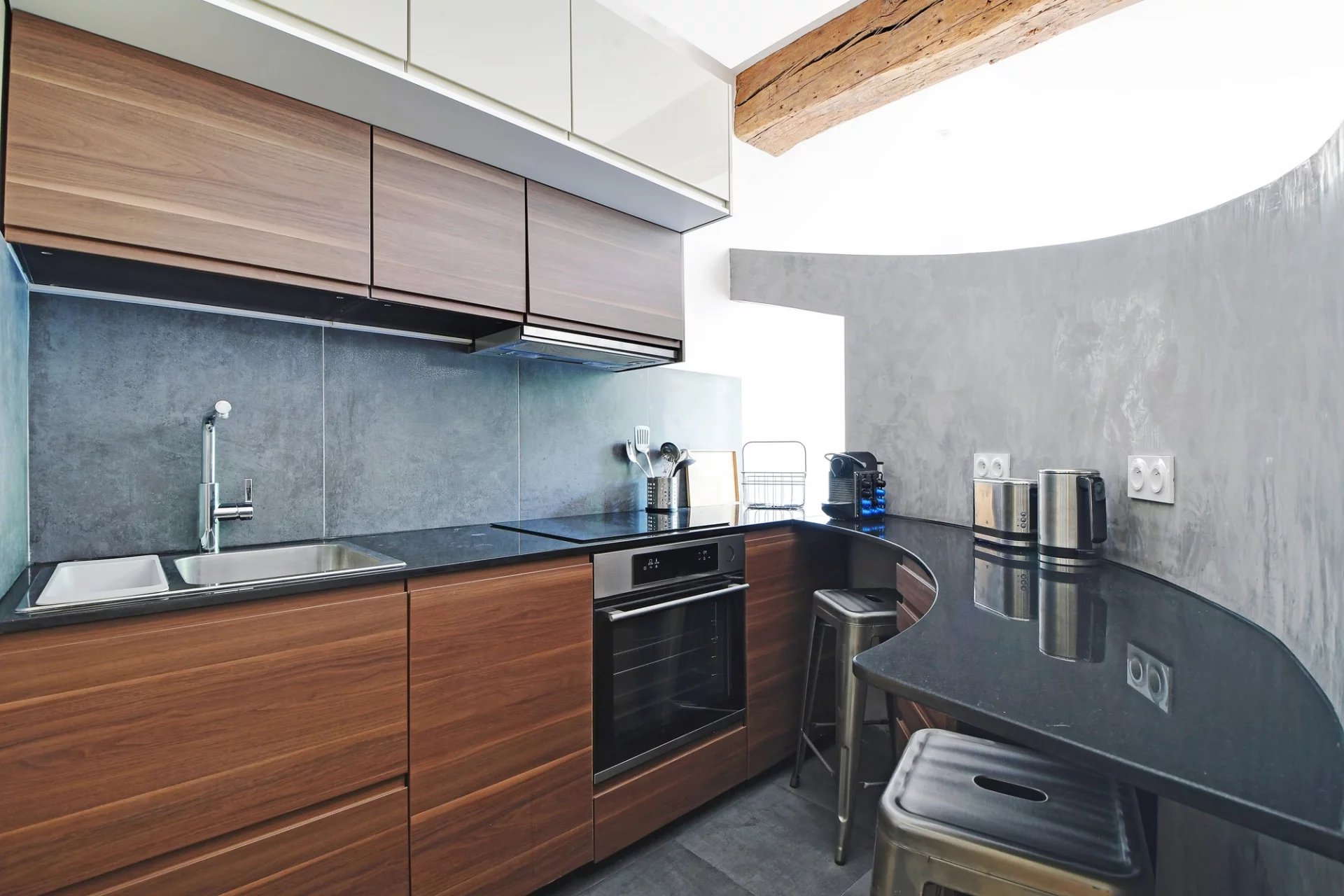 - cuisine moderne entièrement équipée avec réfrigérateur, four, hotte, plaques, micro ondes, nombreux rangements,