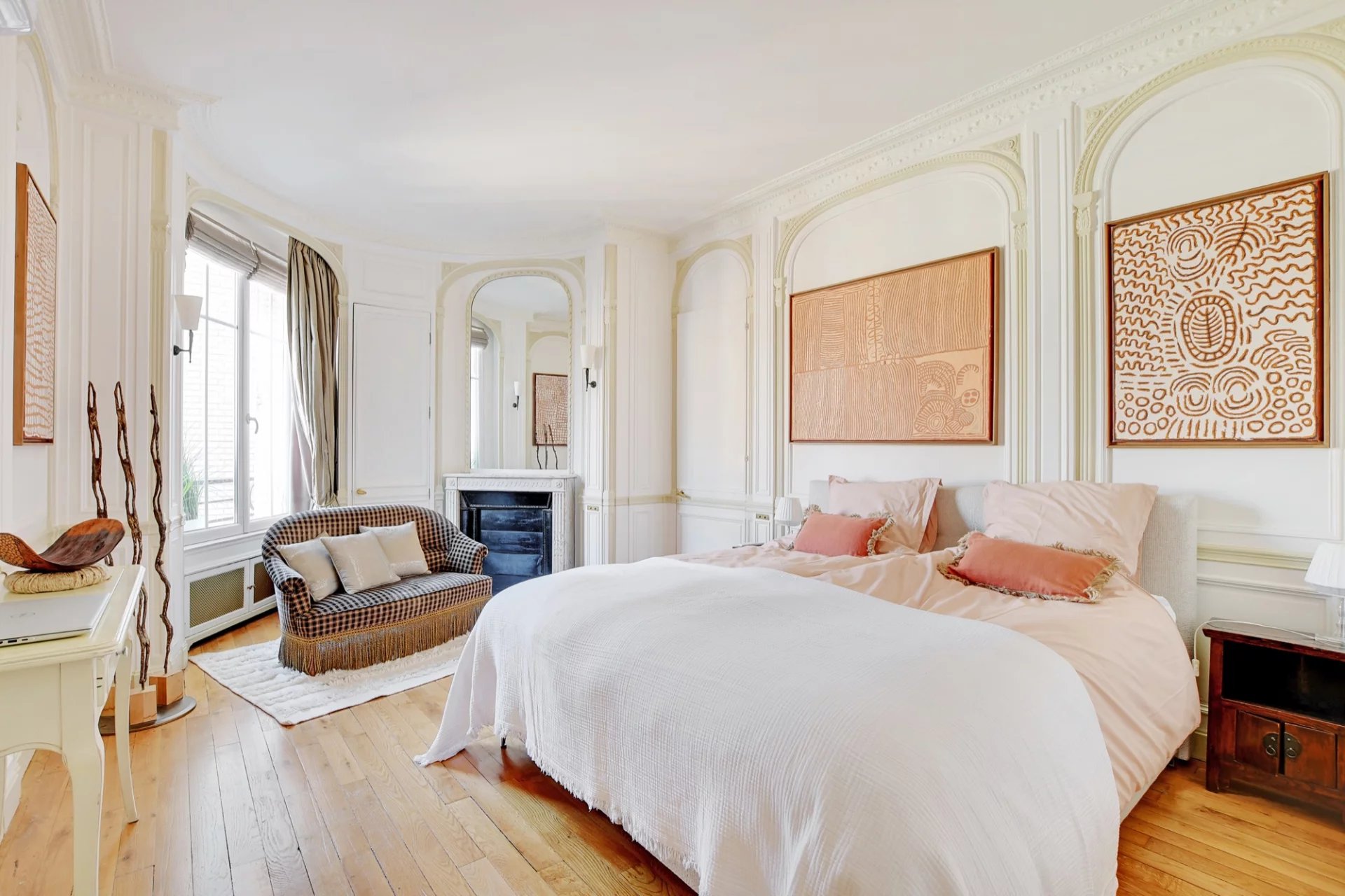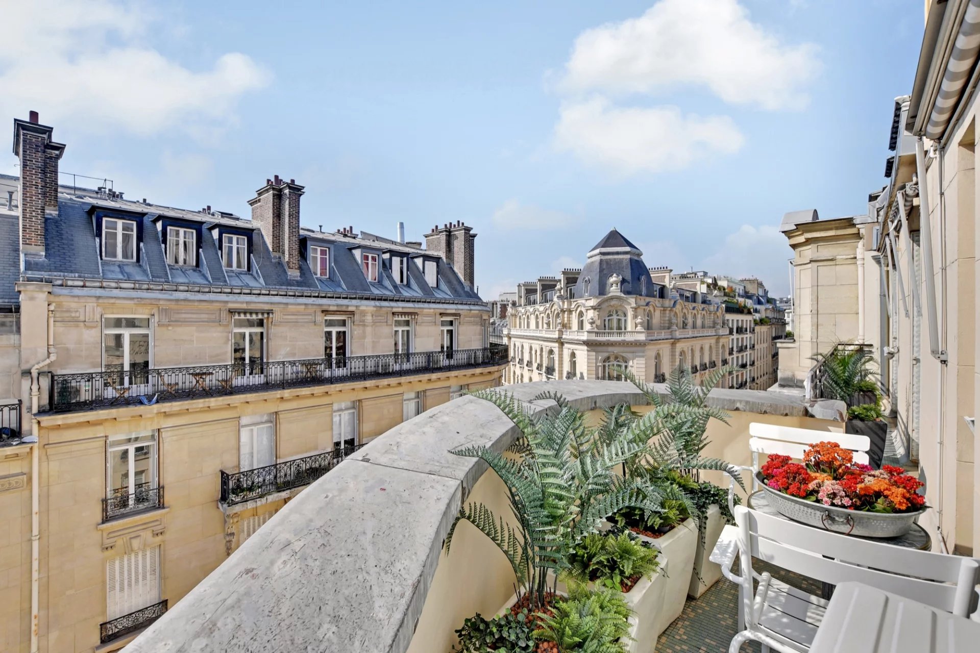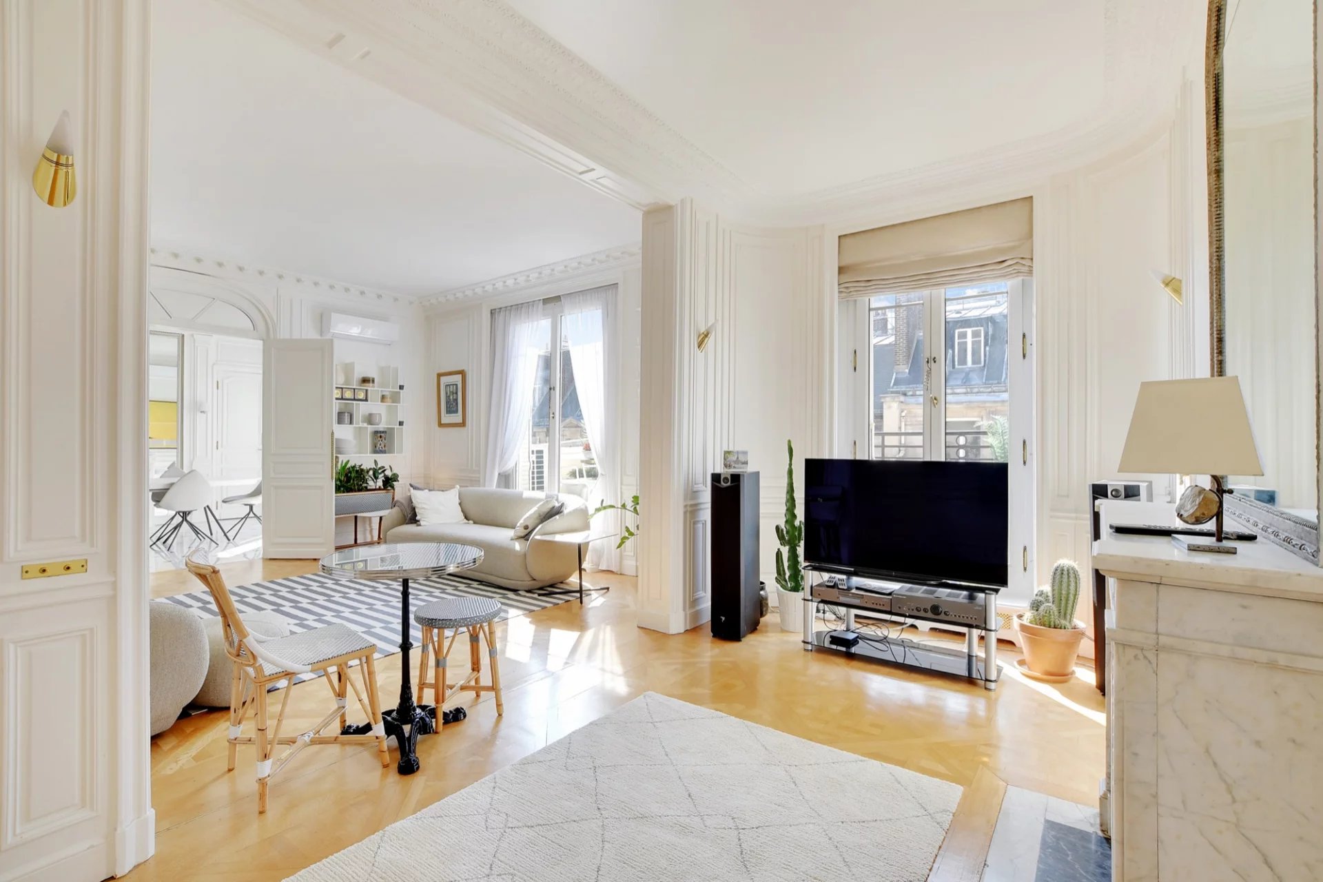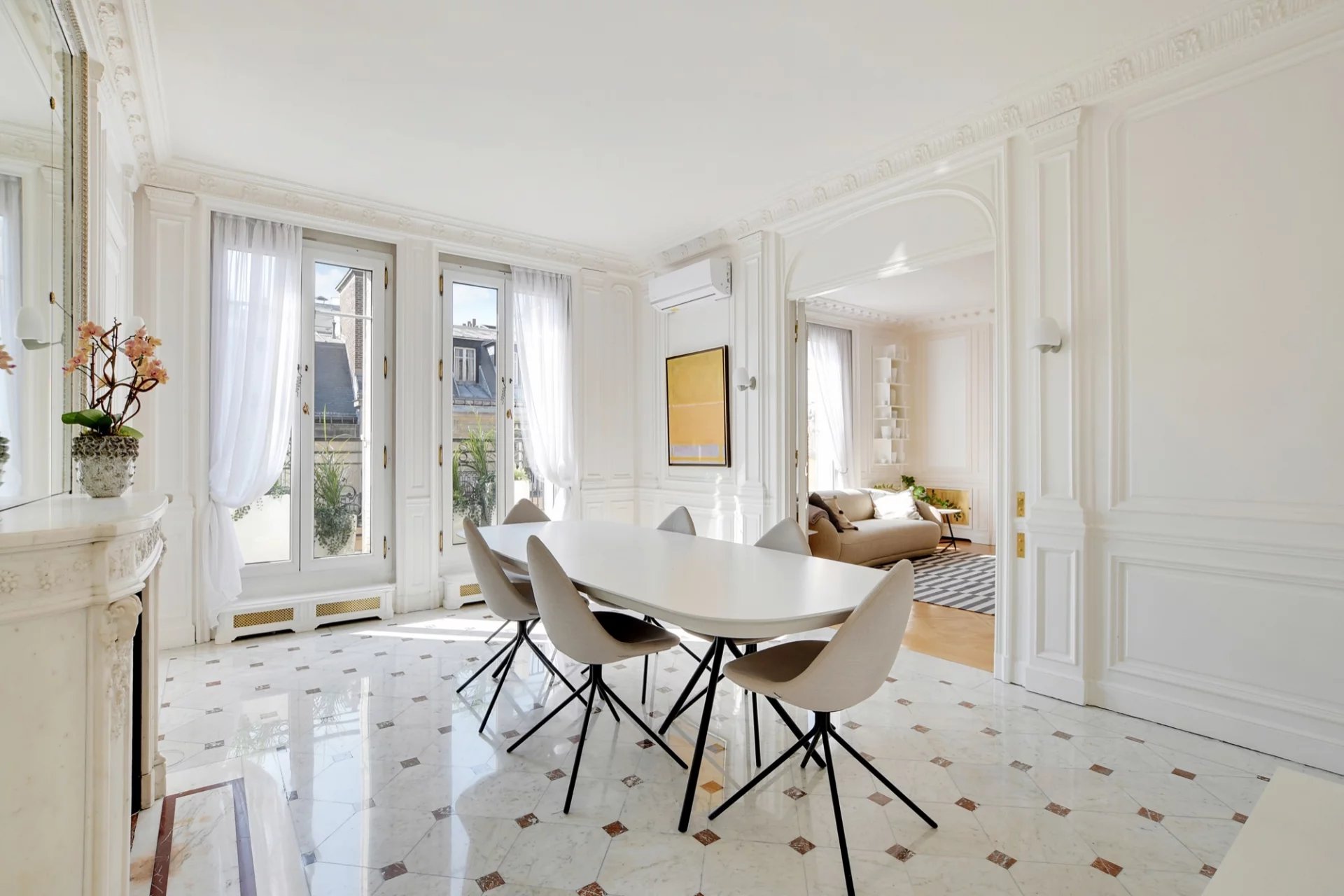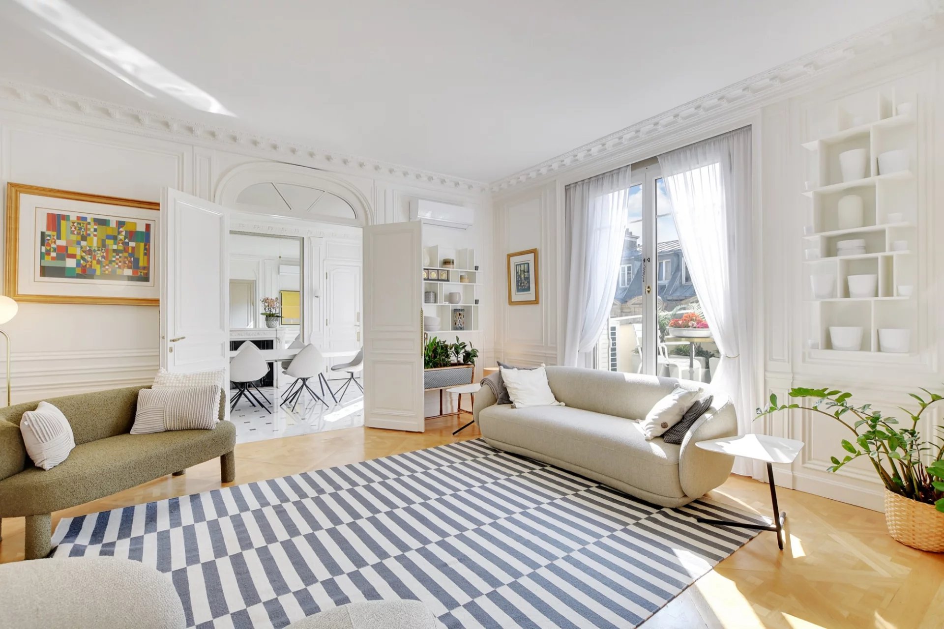 Au 6ème étage avec ascenseur d'un immeuble Art Déco de grand standing, cet élégant et magnifique appartement traversant de réception de 170 m² Loi Carrez offre de beaux volumes et s'ouvre sur un joli balcon/terrasse plein Sud avec une vue dégagée sur les toits de Paris et sur un palace parisien.