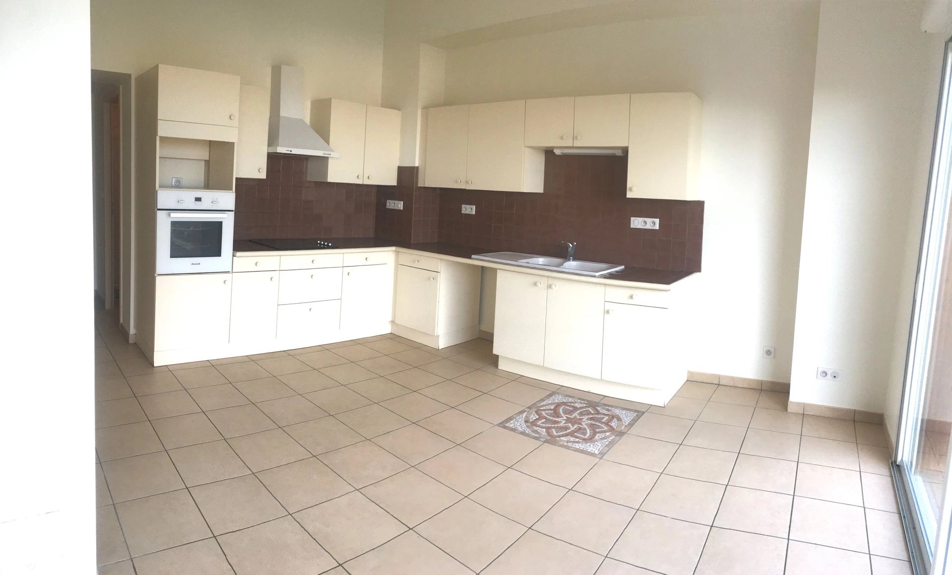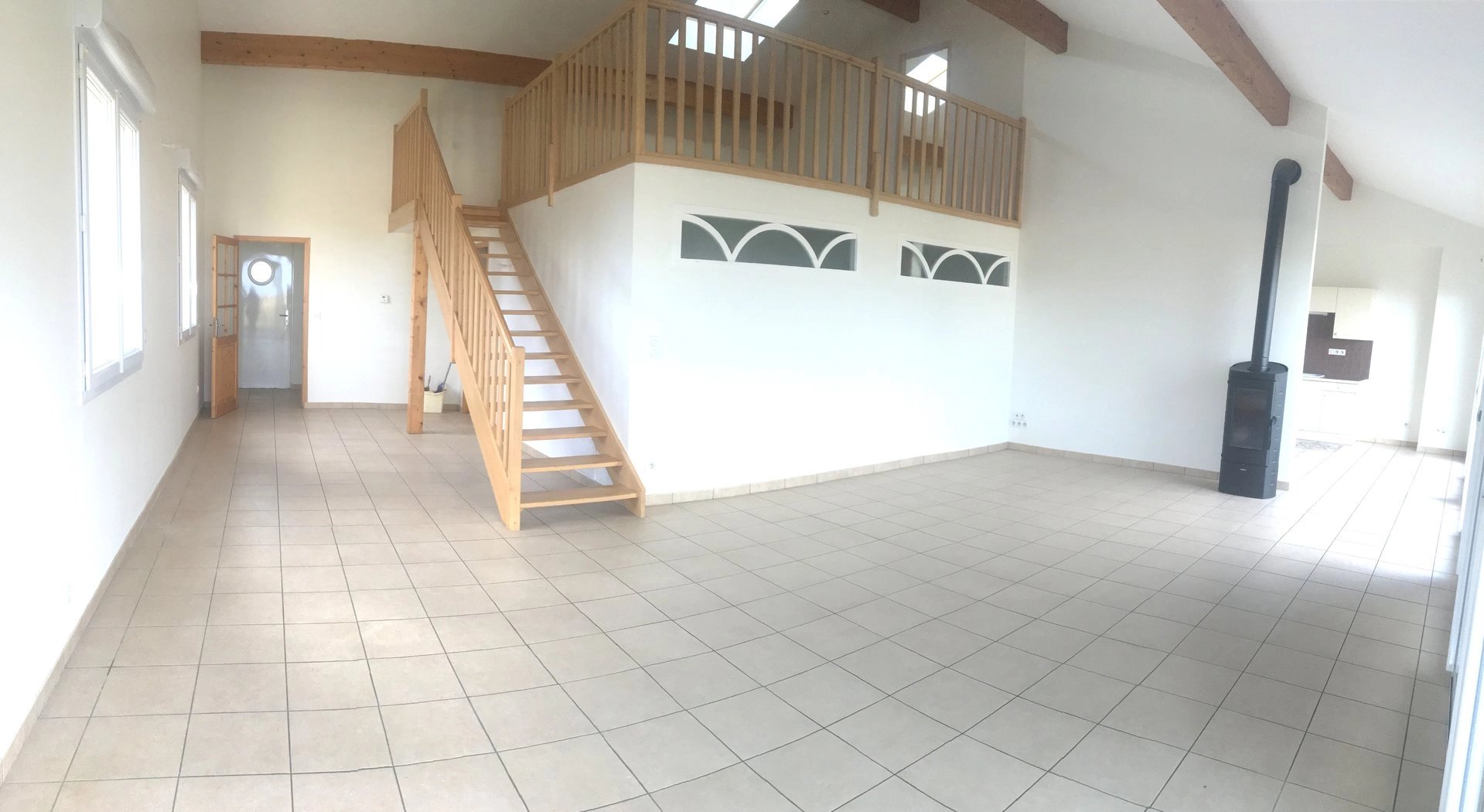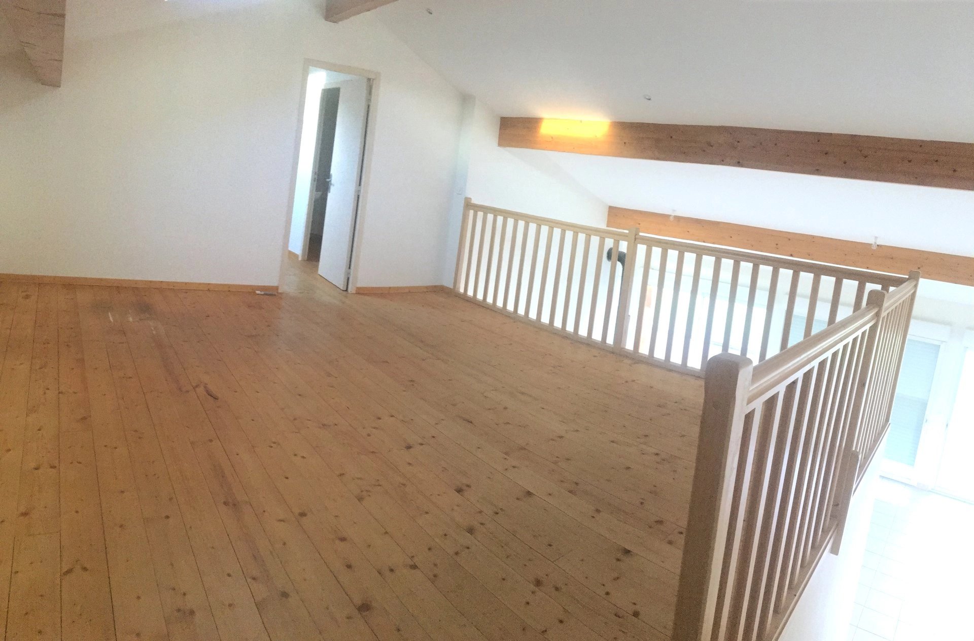 Le séjour et la cuisine sont ouverts sur la terrasse de 58 m² avec une vue imprenable. Quartier calme, chauffage géothermie réversible + poêle. 2 places de parking.
