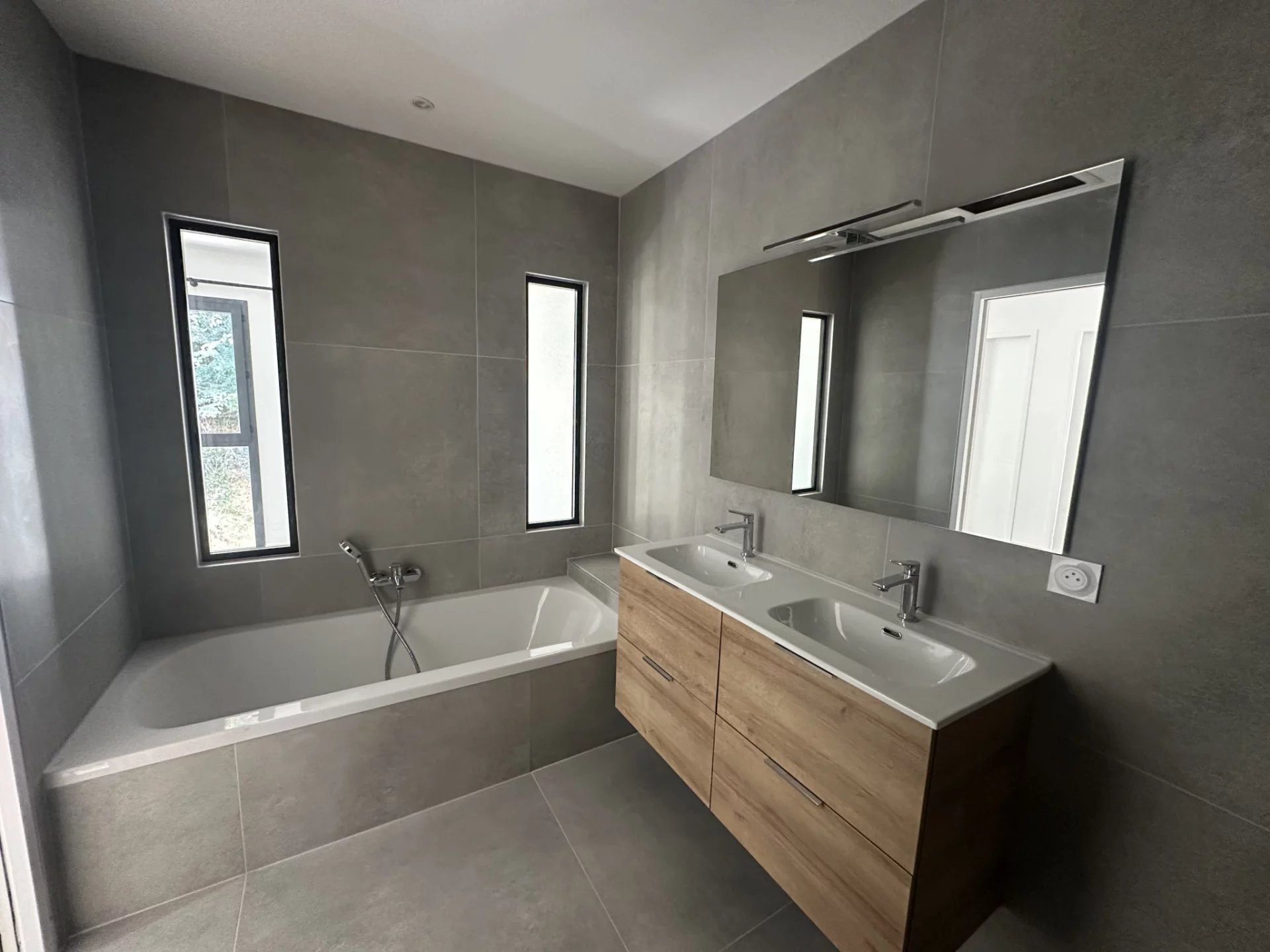 Vous trouverez une vaste et très agréable séjour baigné de lumière et sa cuisine américaine aménagée et équipéé, le tout prolongé par une belle terrasse et un agréable jardin privatif; à l'étage, vous trouverez un espace bureau / détente, deux belles chambre avec placards de rangement, une superbe salle de bain avec douche, baignoire ainsi qu'une double vasque.