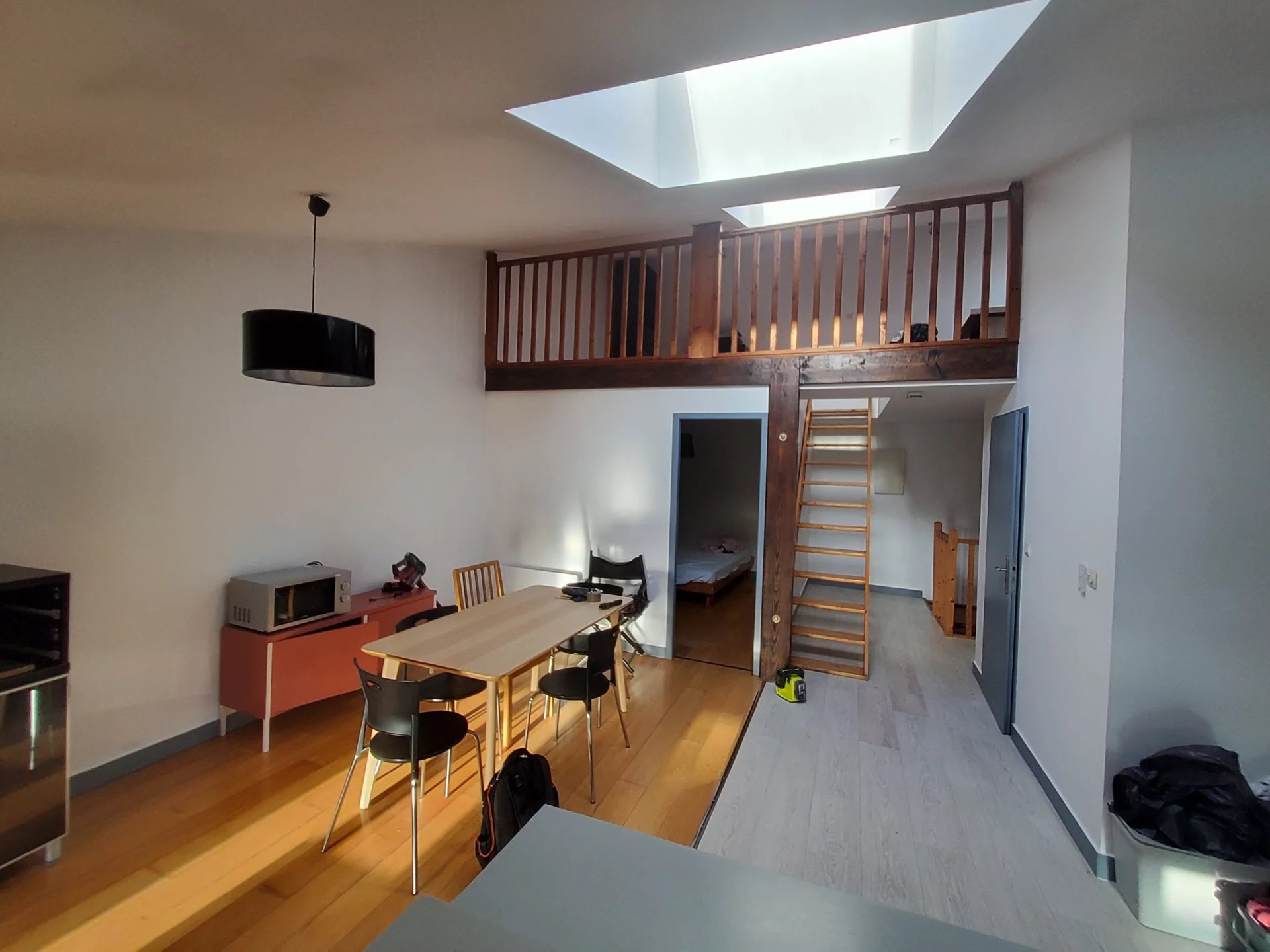 Le logement se distingue par sa belle luminosité et ses volumes agréables. Il se compose d’une pièce de vie avec cuisine équipée, incluant des éléments électroménagers mis à disposition gratuitement, d’une grande mezzanine offrant un espace nuit ou bureau confortable, ainsi que d’une salle d’eau.