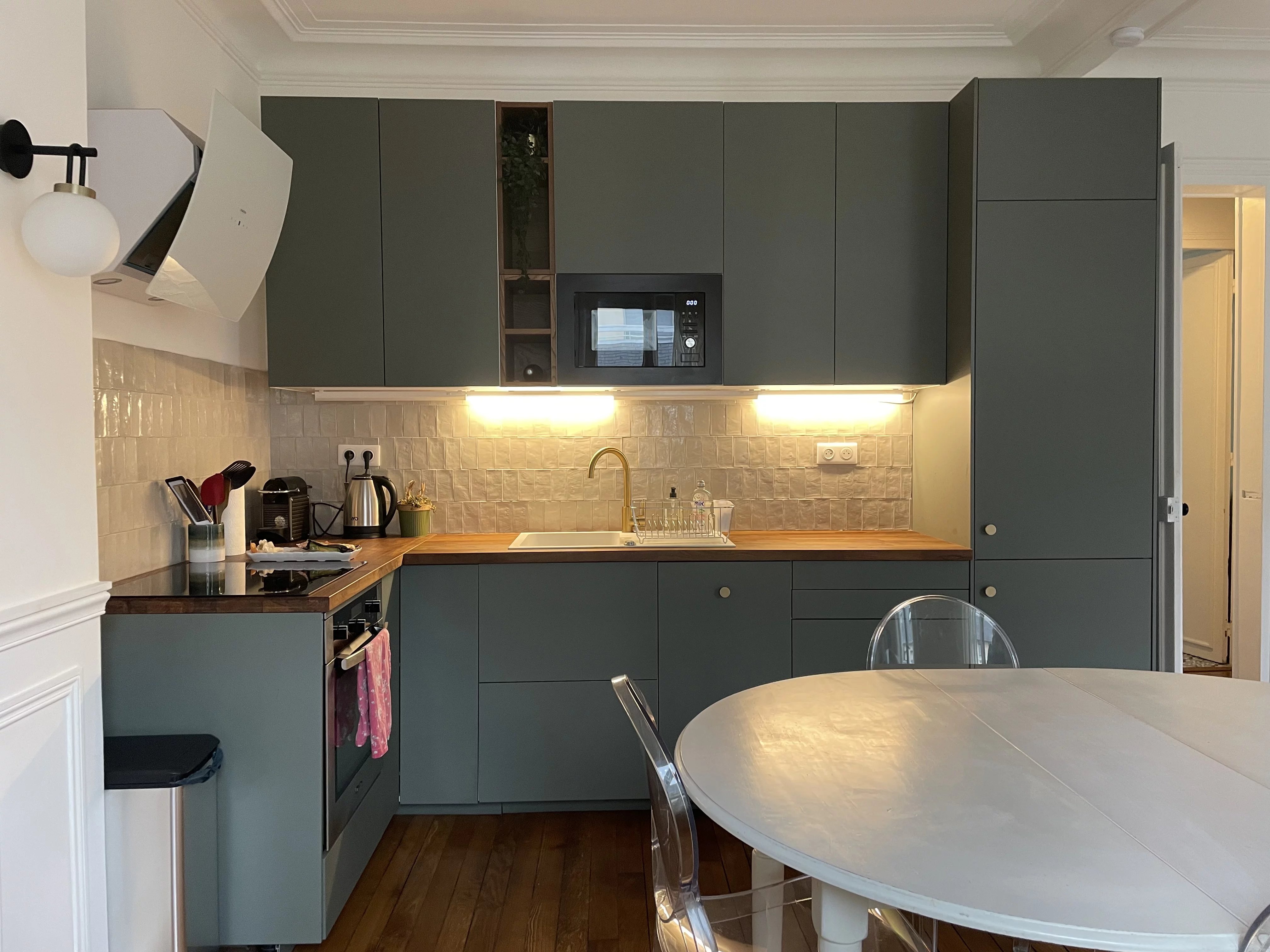 Il comprend : une entrée, une cuisine équipée et aménagée ouverte sur le séjour exposé Ouest, une chambre au calme vue sur les jardins avec un dressing, une salle d'eau et un wc séparé.
