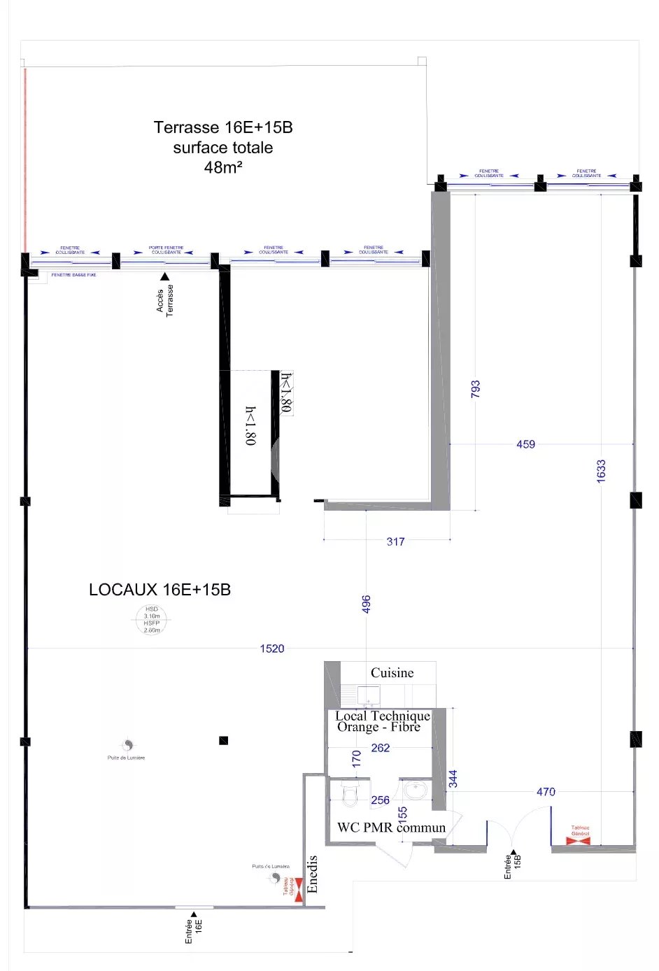 -Prestations Communes : Le bâtiment est équipé de la fibre optique. Les locataires ont accès à une terrasse commune, une cuisine partagée, des douches H/F et des WC PMR.