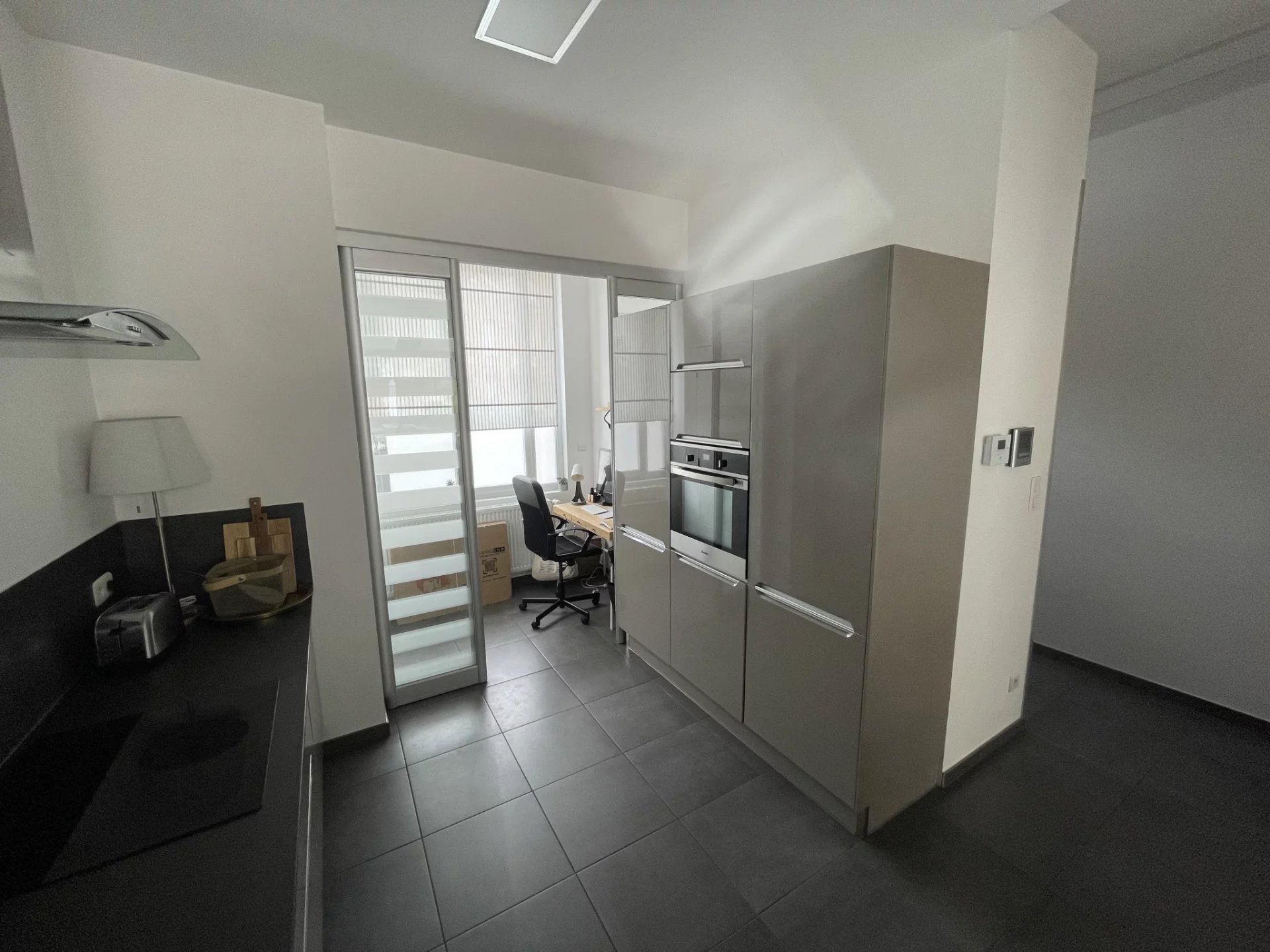 Elle se compose: entrée avec placard et dressing, belle pièce à vivre spacieuse de 34 m2 avec cuisine haut de gamme ouverte toute équipée (plaque induction, four, hotte, réfrigérateur/congélateur & LV) donnant accès à la terrasse bien exposée (sud), WC indépendant.