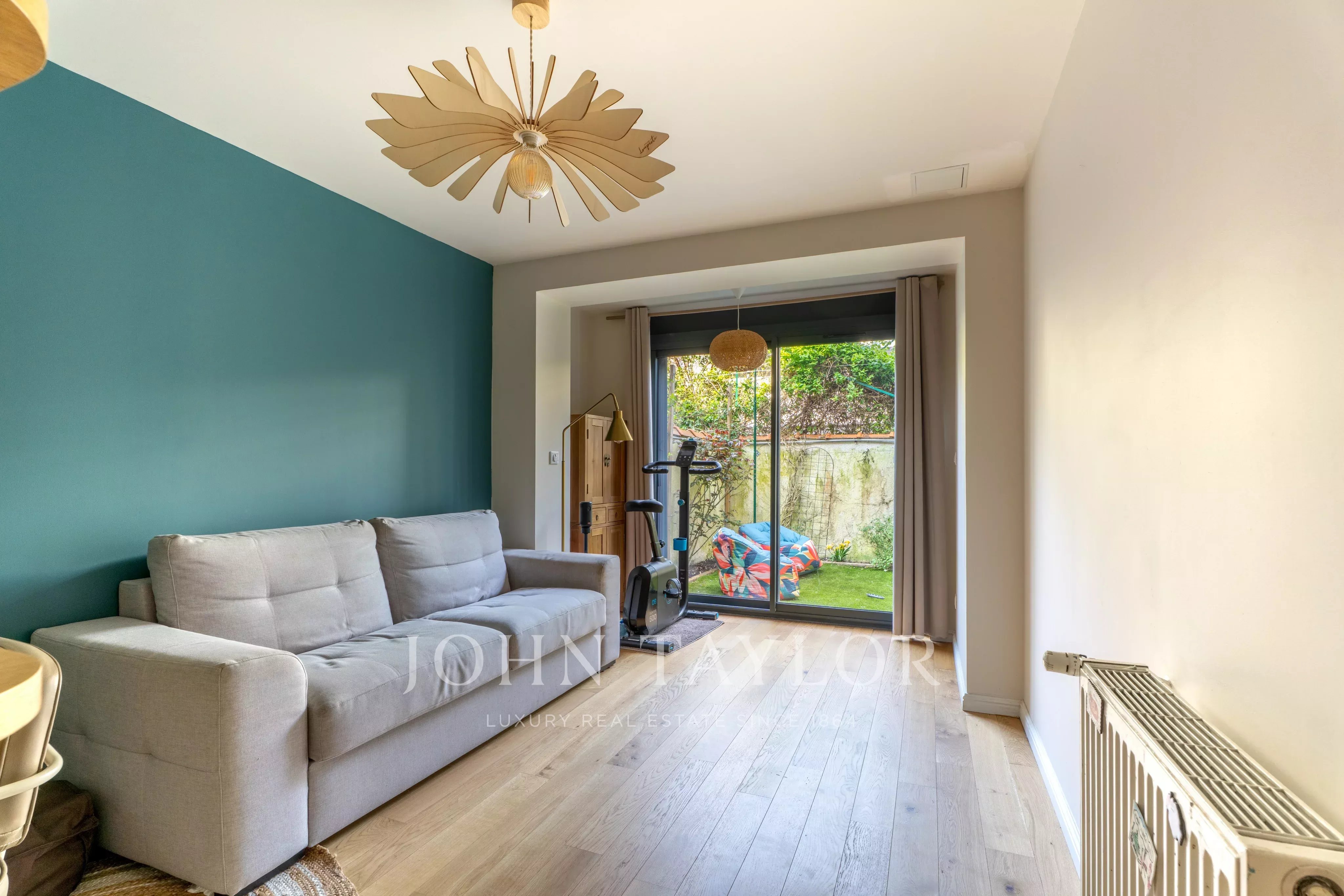 En rez-de-jardin, vous trouverez une belle suite parentale avec accès direct au jardinet, un bureau pouvant également faire office de chambre, une salle de bains avec douche et WC, ainsi qu’une buanderie.