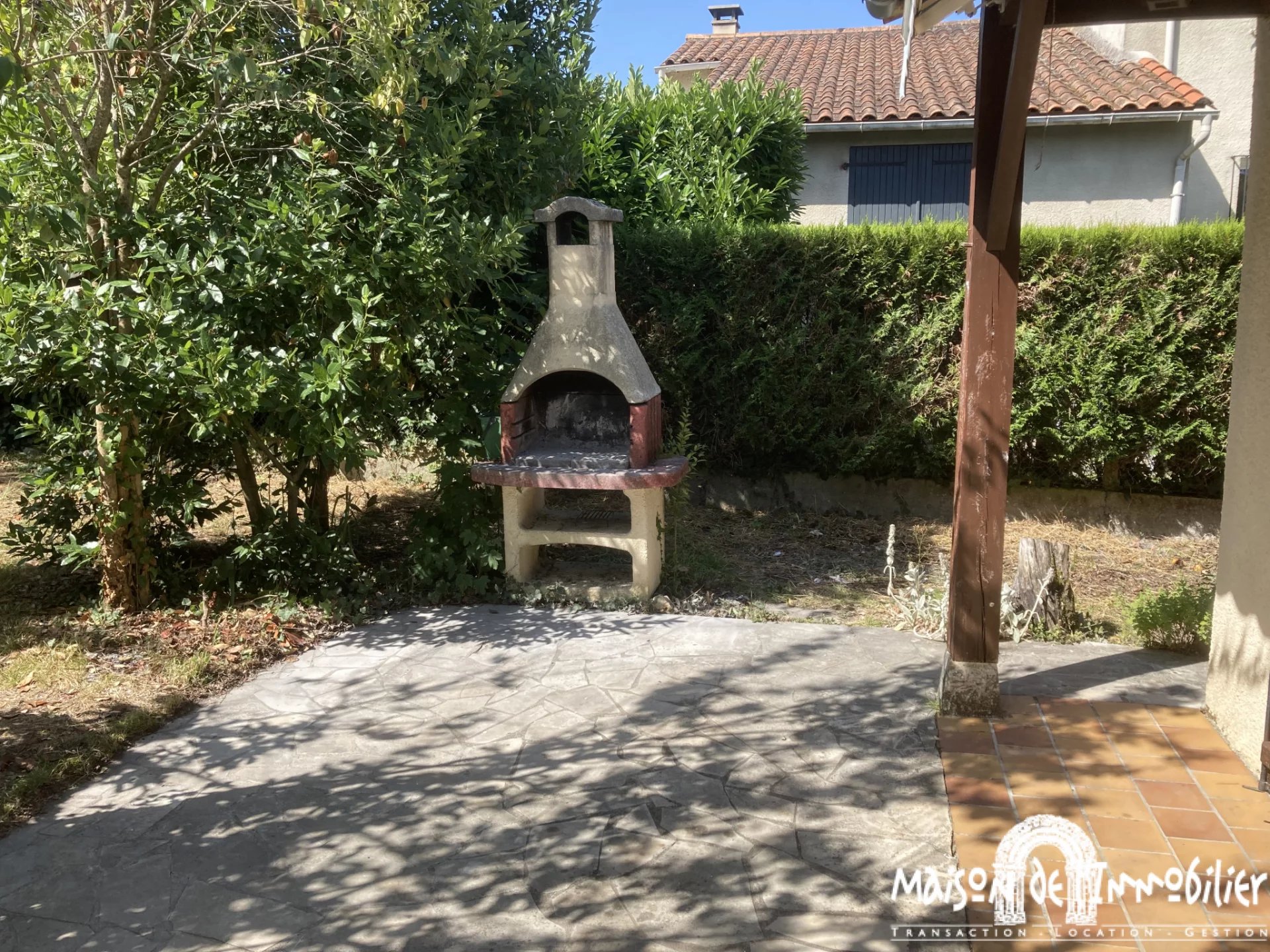 Garage et joli jardin arboré avec barbecue et cabanon en bois.