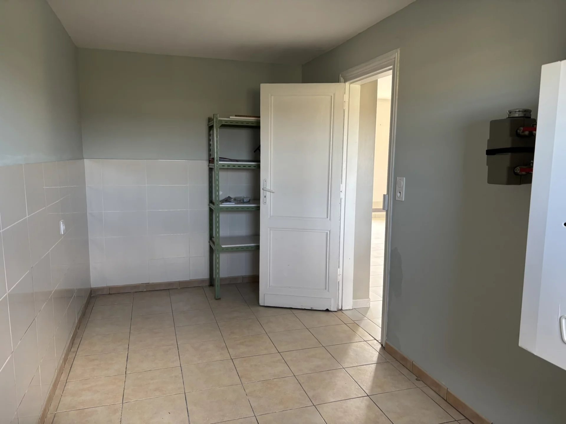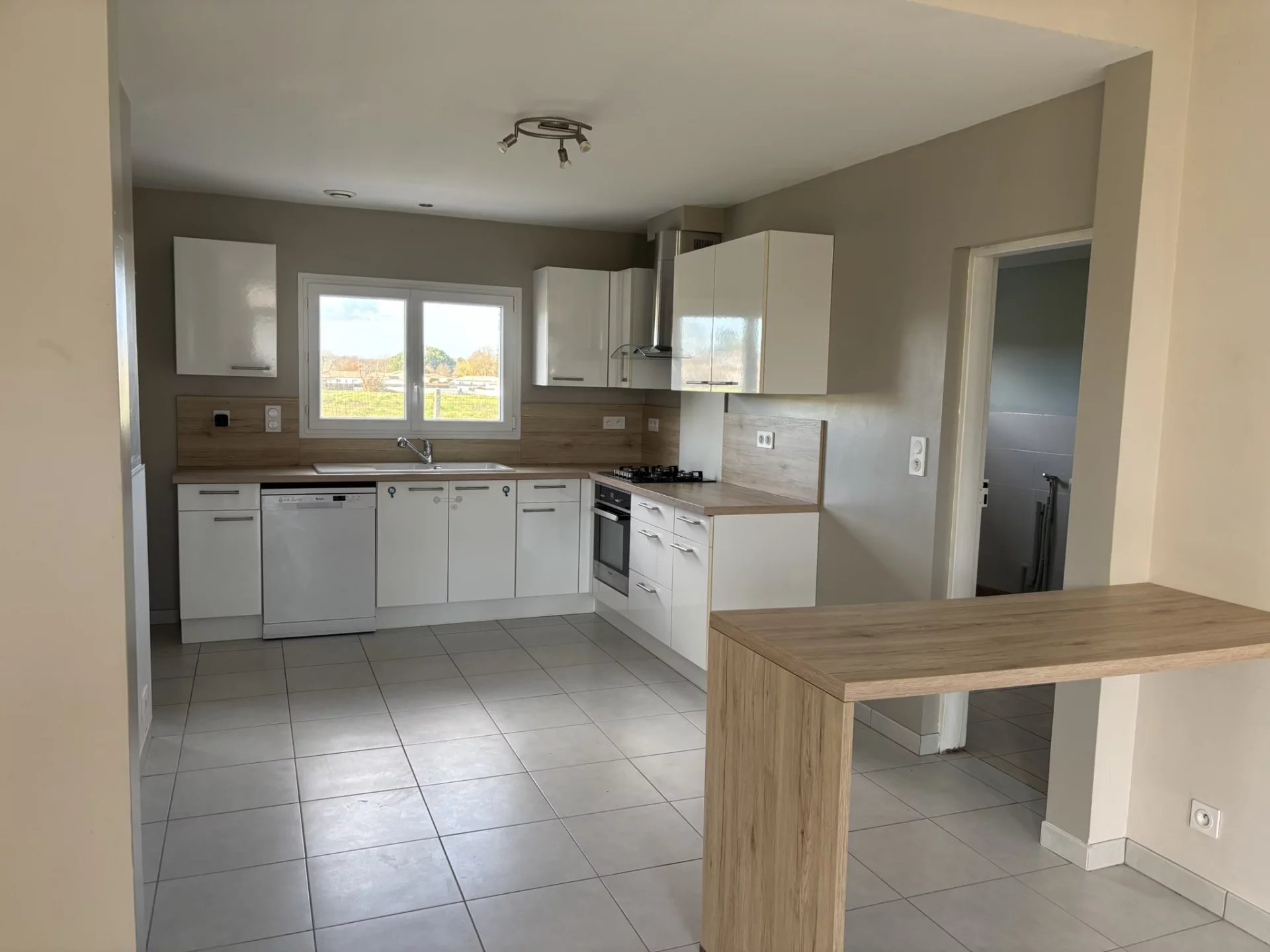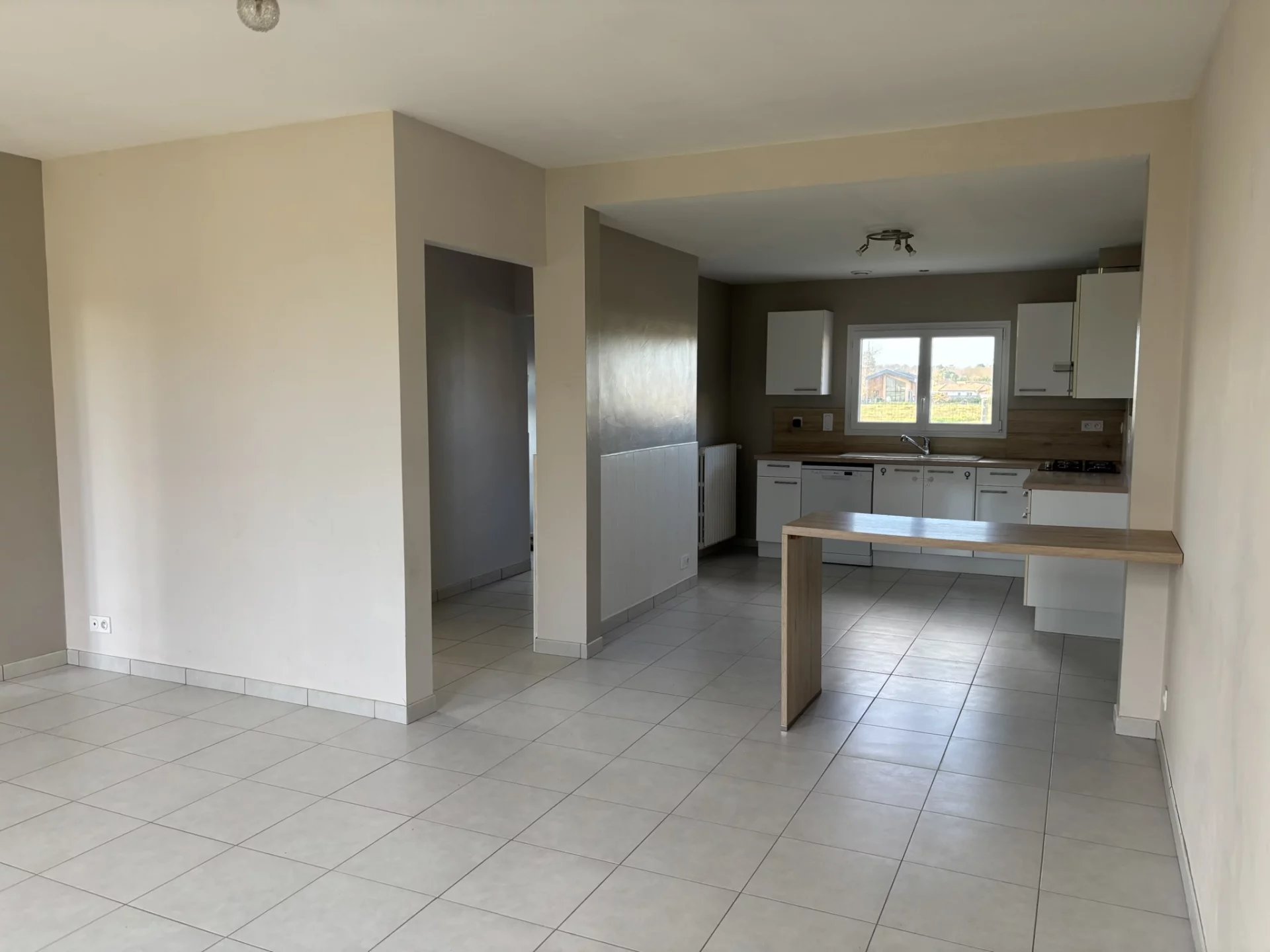 Entrée - Salon séjour avec coin cuisine aménagée ( Meubles + Plaque Gaz + Hotte + Four + Lave-vaisselle ) - Cellier - 2 Chambres avec placards - Salle d'eau - WC -