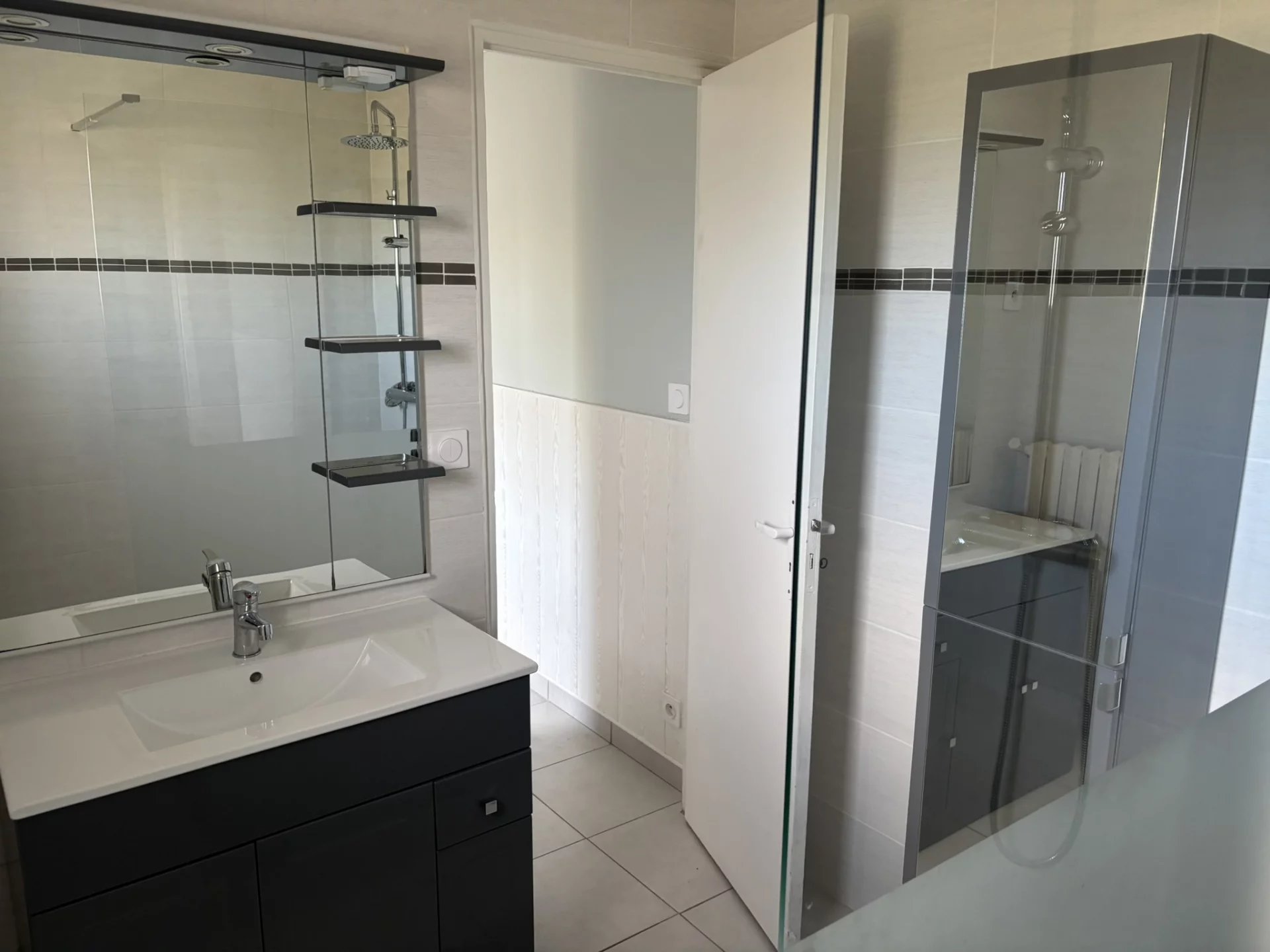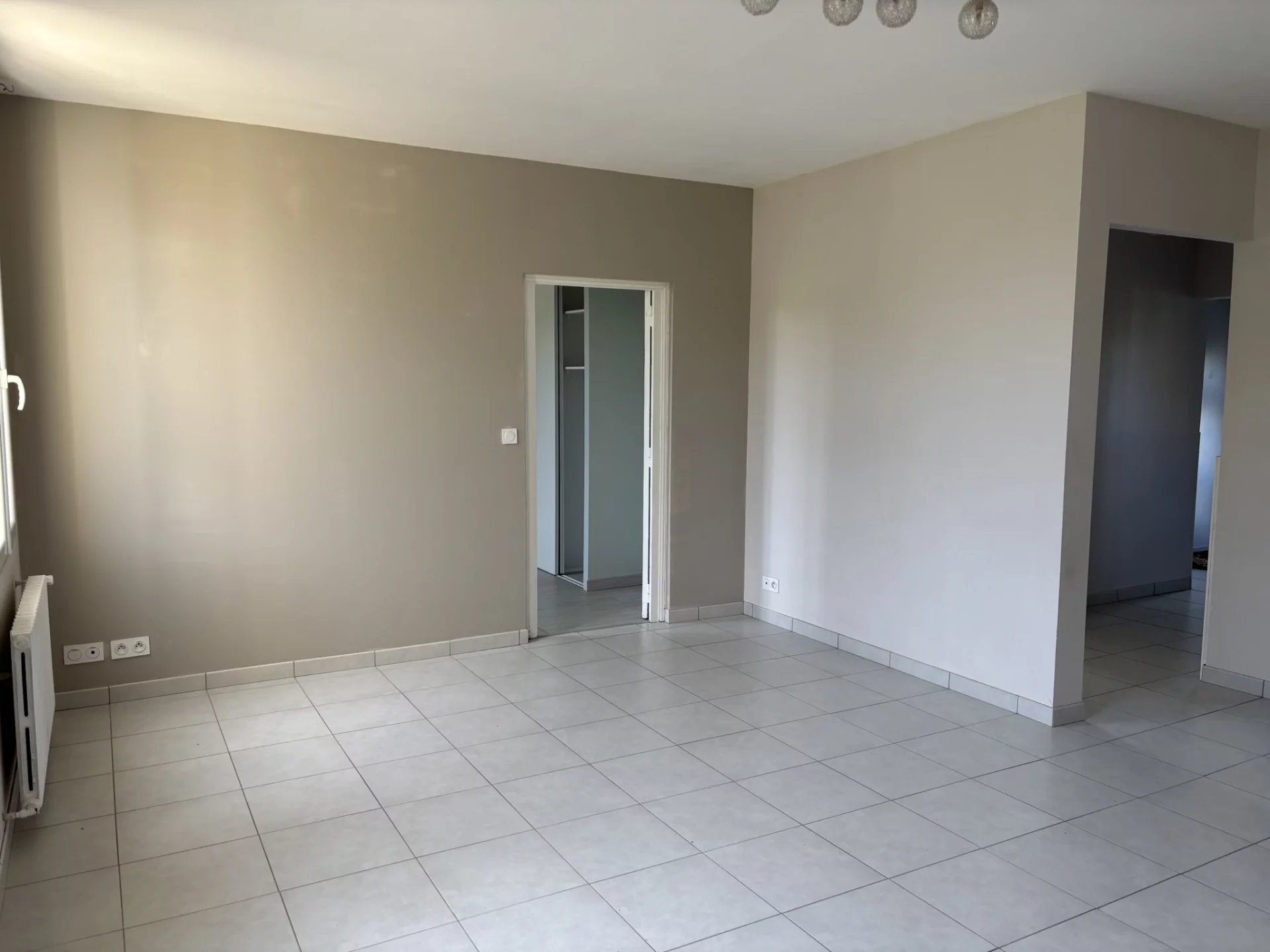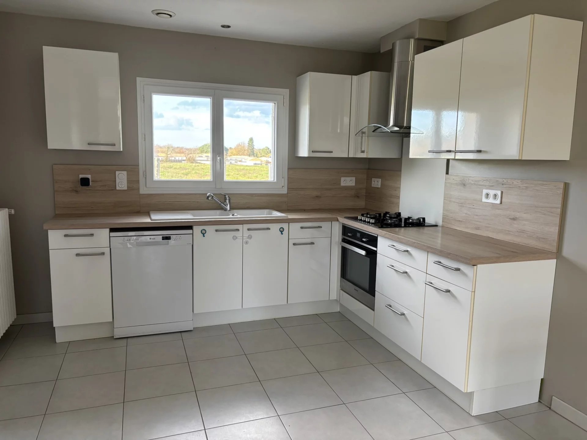 Entrée - Salon séjour avec coin cuisine aménagée ( Meubles + Plaque Gaz + Hotte + Four + Lave-vaisselle ) - Cellier - 2 Chambres avec placards - Salle d'eau - WC -