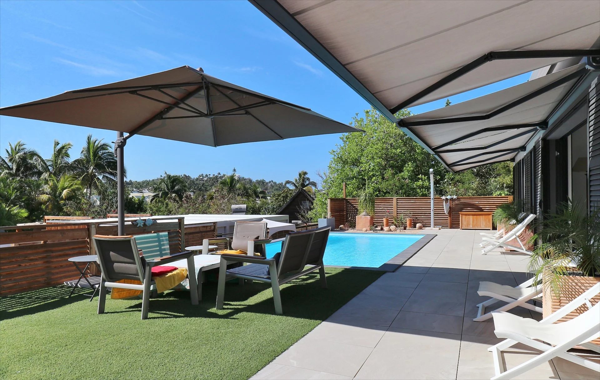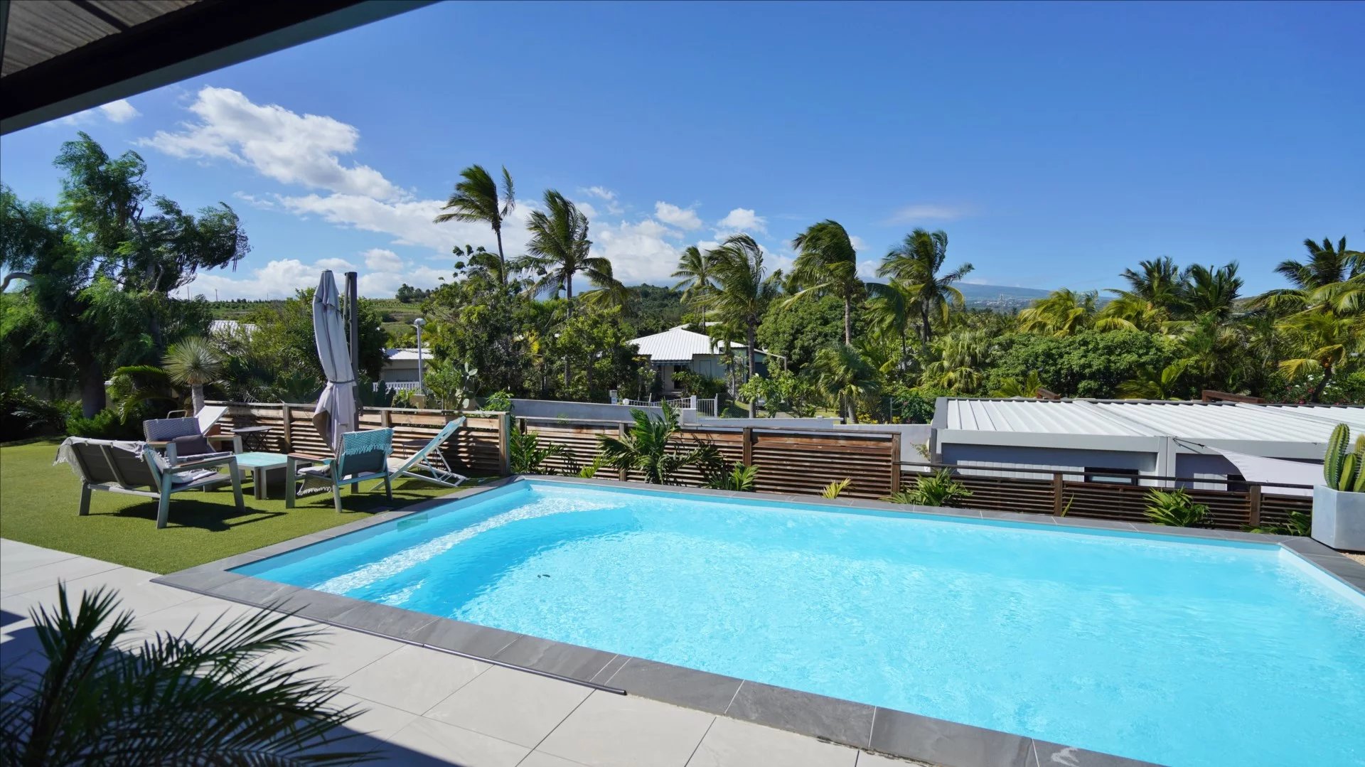 Une piscine et un jardin arboré.