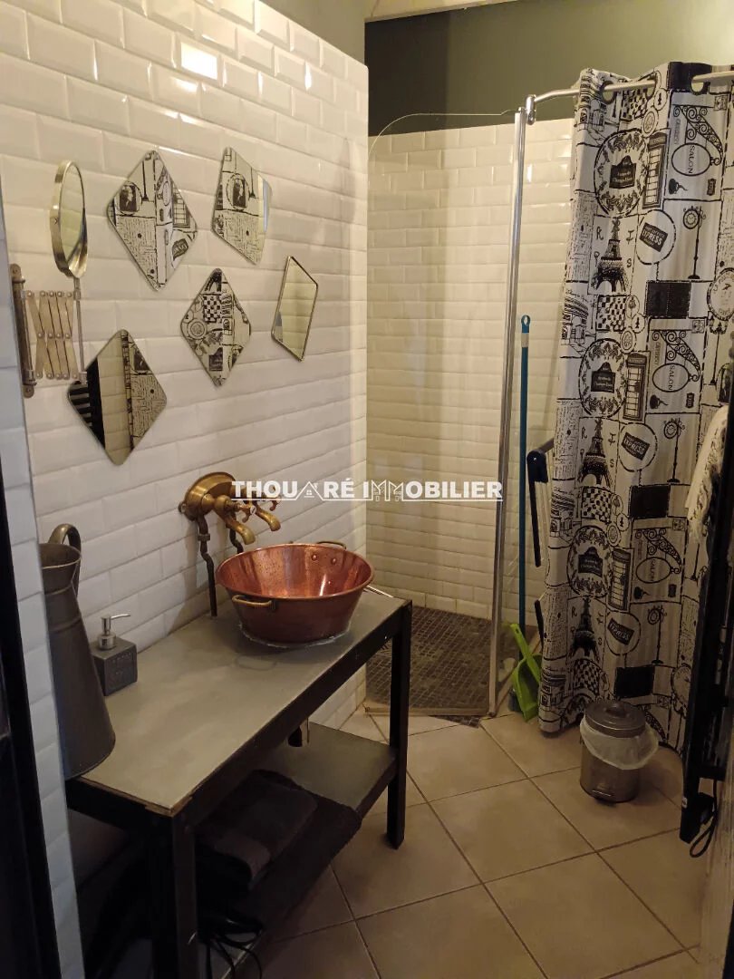 Au rez de chaussée : une cuisine aménagée de placards, tout équipée, (hotte-plaques électriques- four -frigo et micro-ondes) ouverte sur séjour qui comprend une table avec 4 chaises et une table basse. Un WC séparé et une salle d'eau avec douche, meuble vasque et machine à laver. A l'étage: une grande chambre avec un lit double et placards et commode.