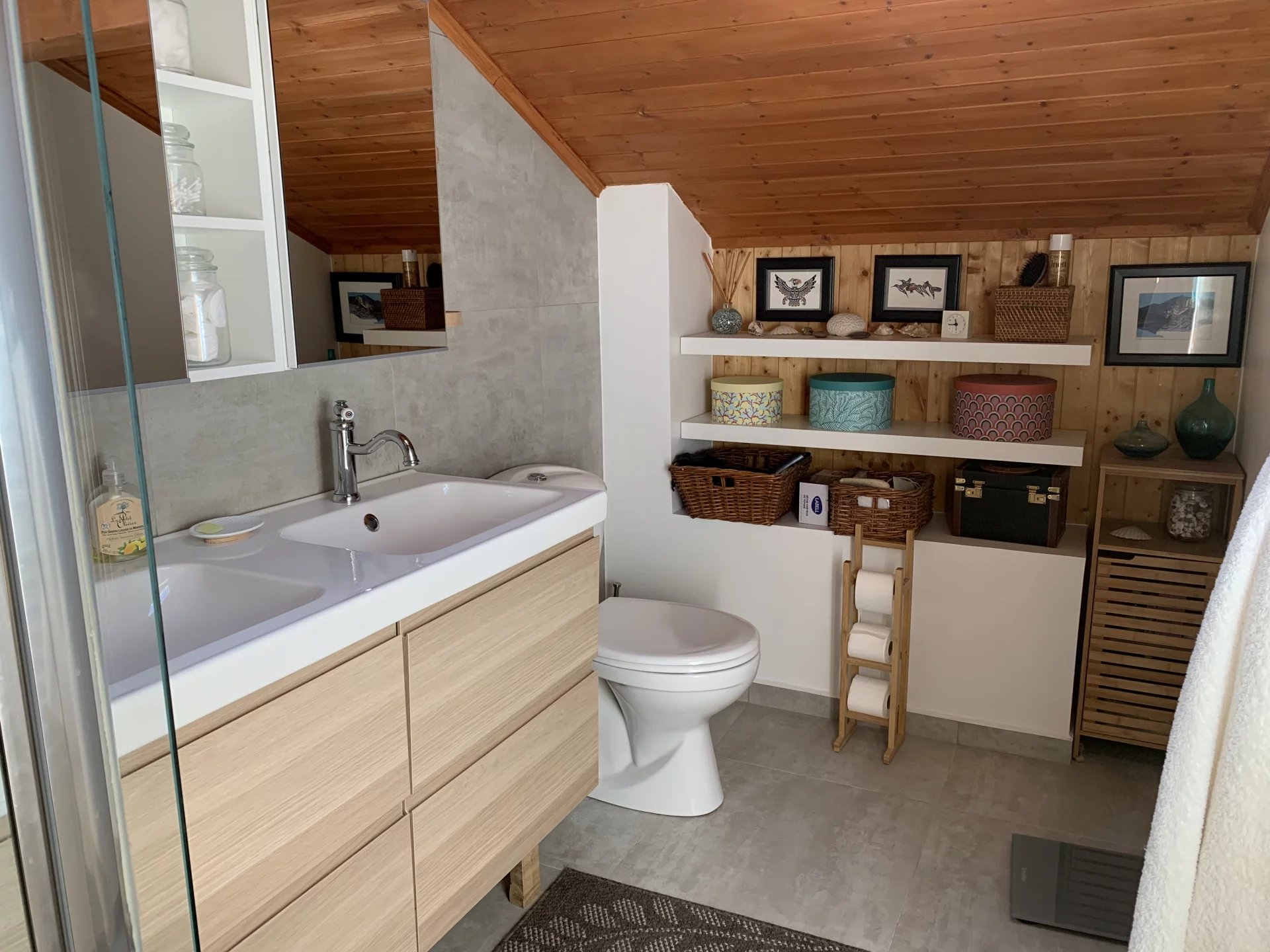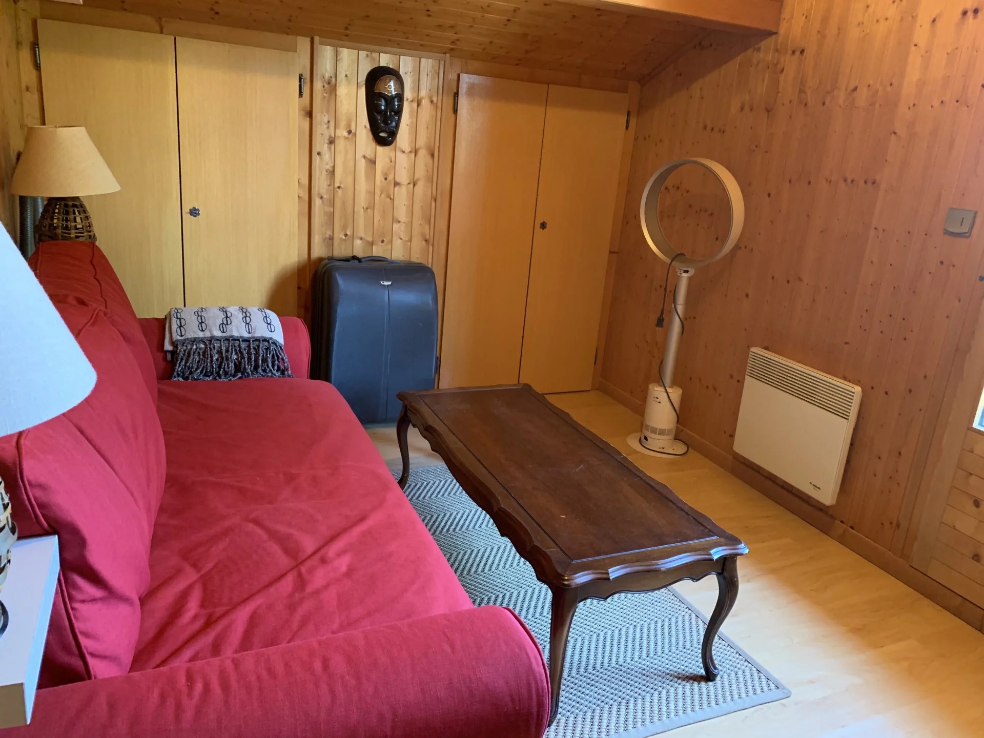Chalet meublé (possibilité de location vide) de 102m² situé sur le coteaux de Nant-Cruy, comprenant : un séjour ouvert sur une cuisine aménagée et équipée avec balcon, un WC avec lave mains et un espace bureau.