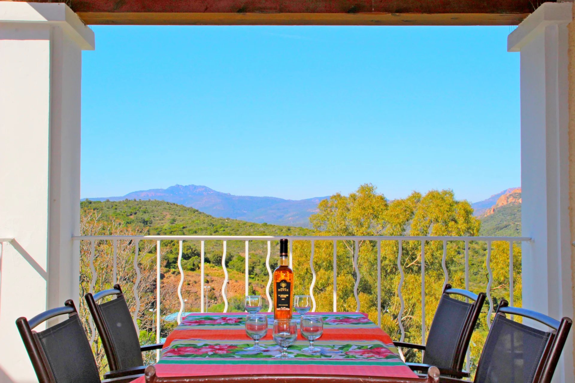 L’atout majeur de ce bien réside dans sa superbe terrasse d’angle couverte de 9 m². Véritable prolongement du séjour, elle offre une vue panoramique dont vous ne vous lasserez jamais. Depuis cet espace extérieur, votre regard embrasse tour à tour les courbes verdoyantes du parcours de Golf, les reliefs flamboyants du Massif de l’Esterel et les eaux scintillantes d'une partie de la baie d’Agay.