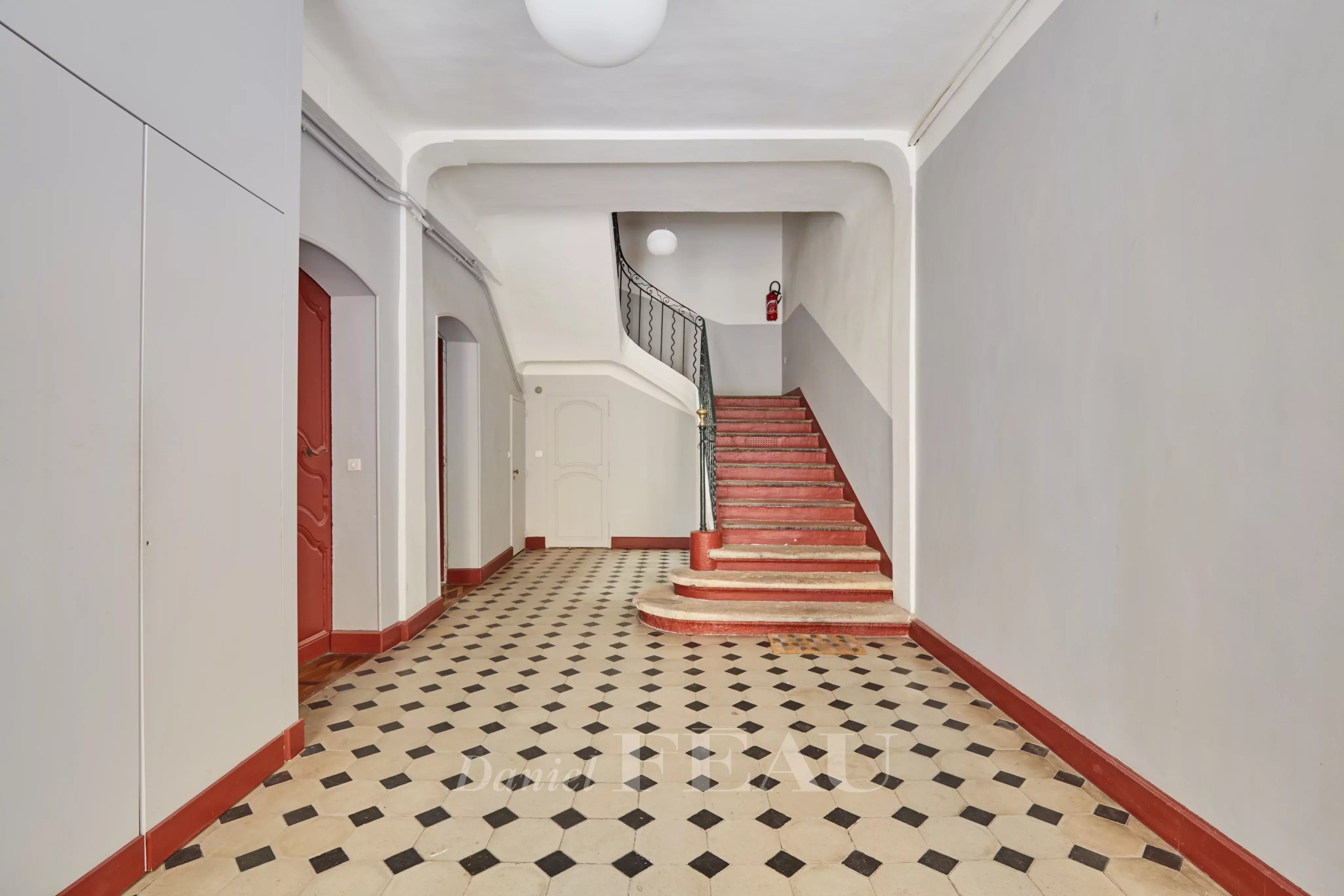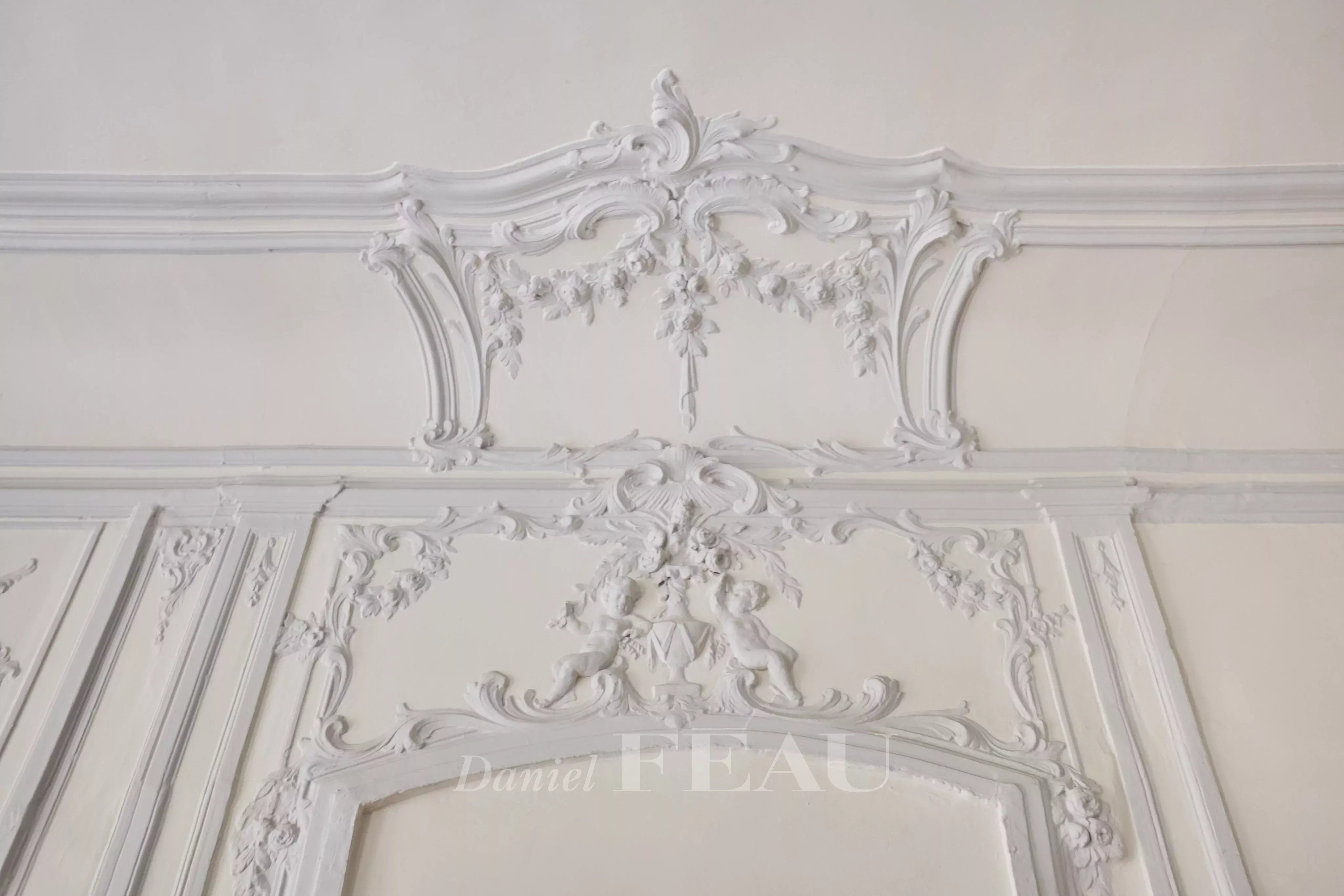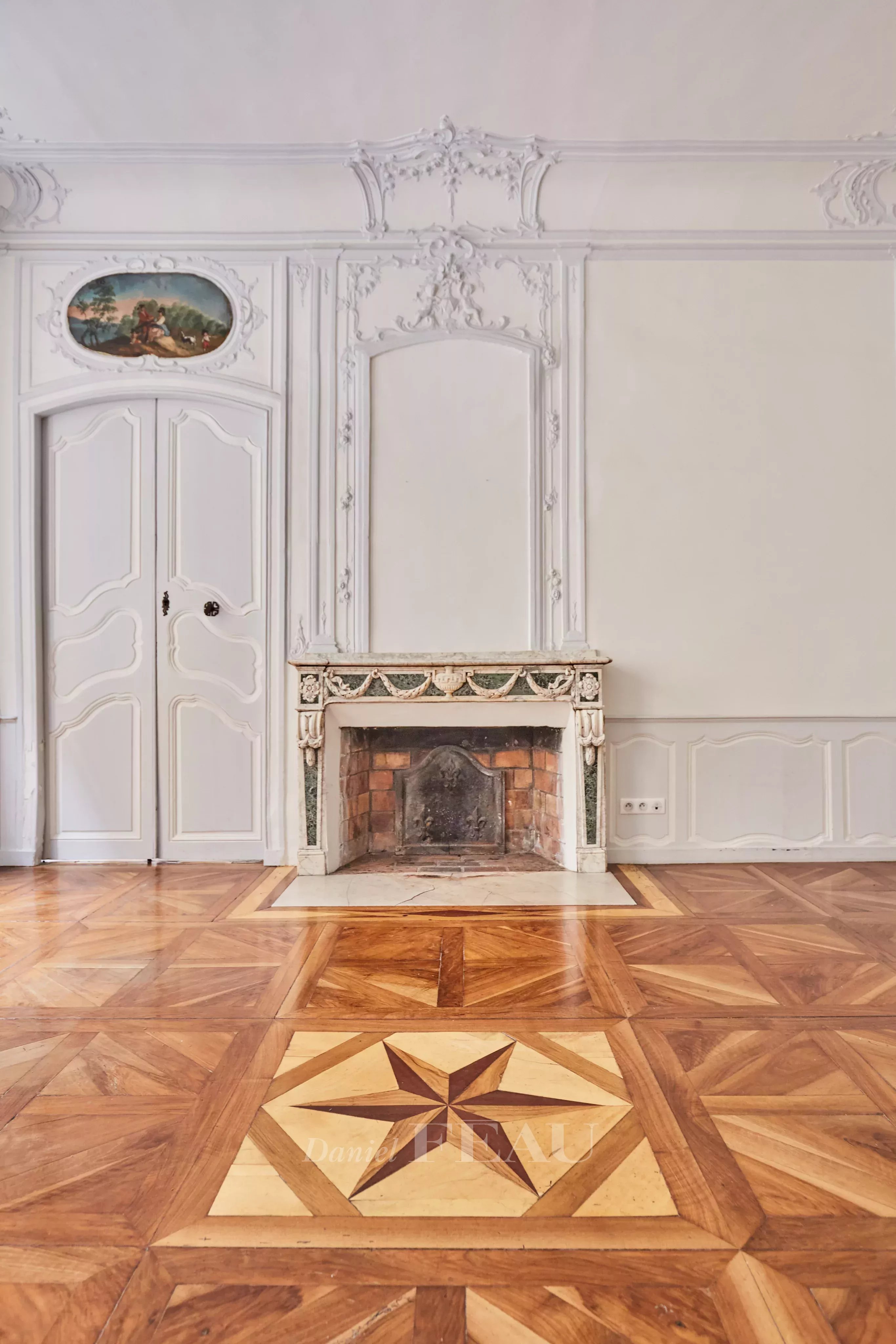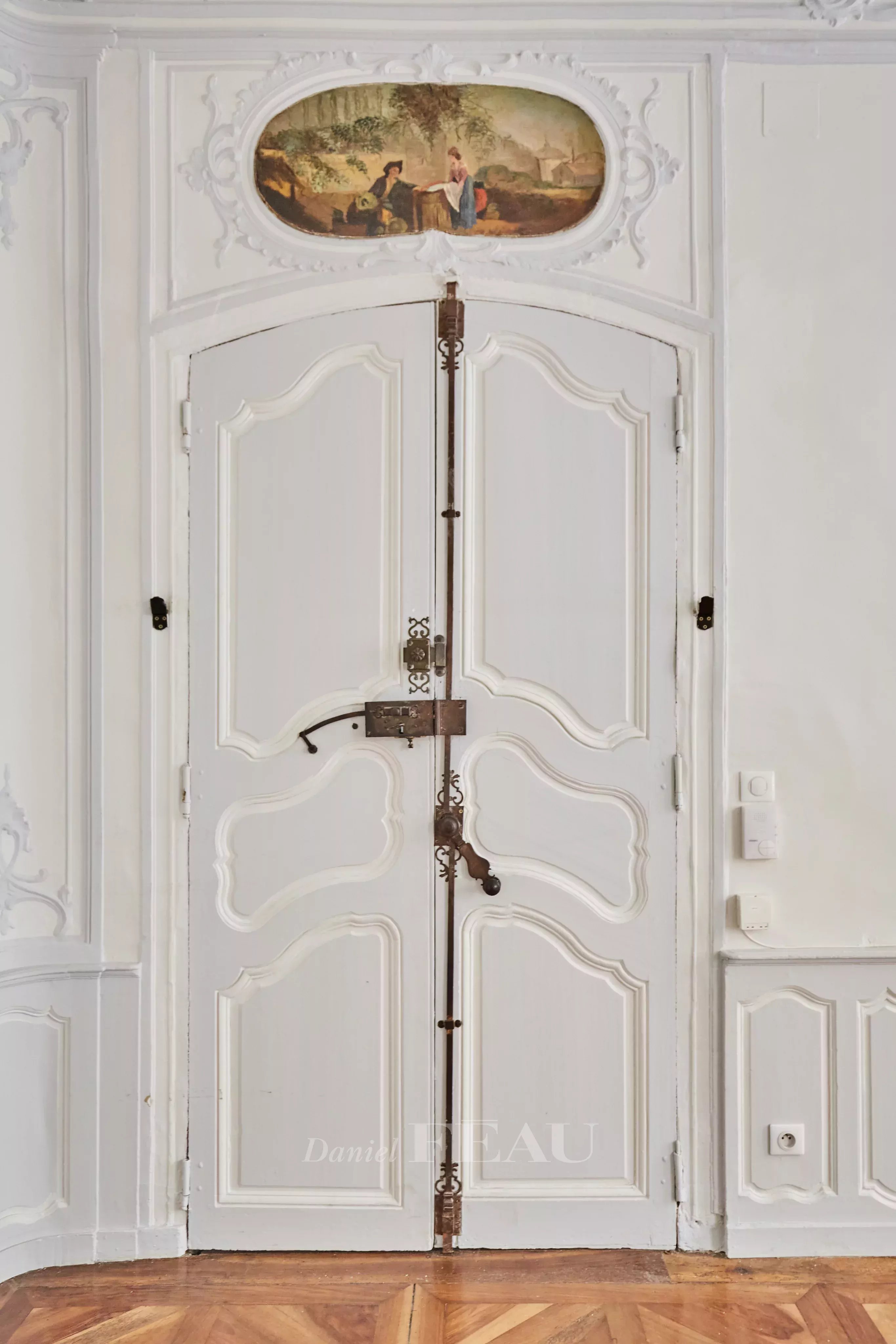 Deux portes d'entrée donnent accès à un salon baigné de lumière, aux gypseries délicates, boiseries sculptées et parquet Versailles. Les dessus de portes ornés, les volets intérieurs et les très belles hauteurs sous plafond témoignent du passé de l'immeuble.