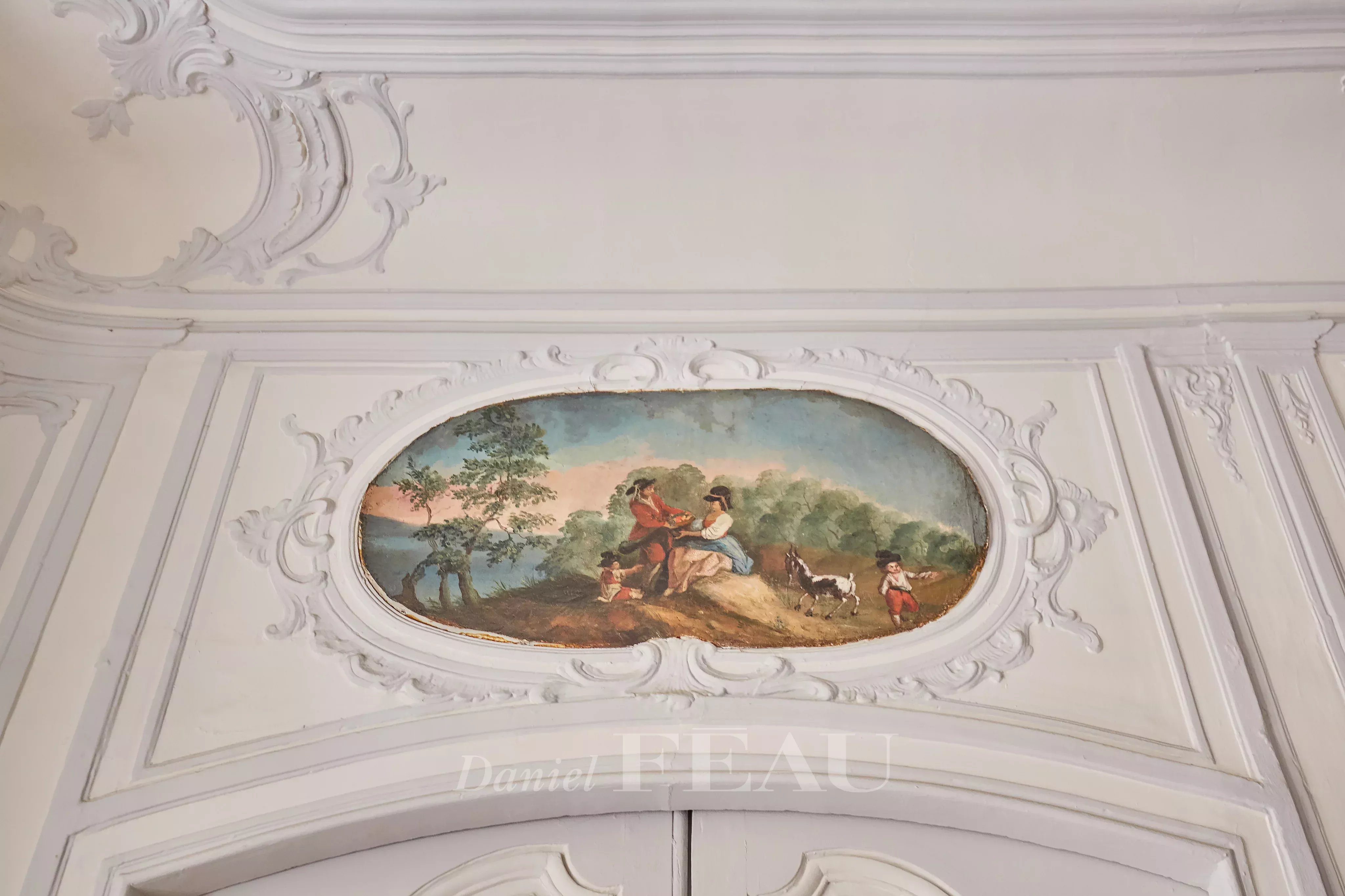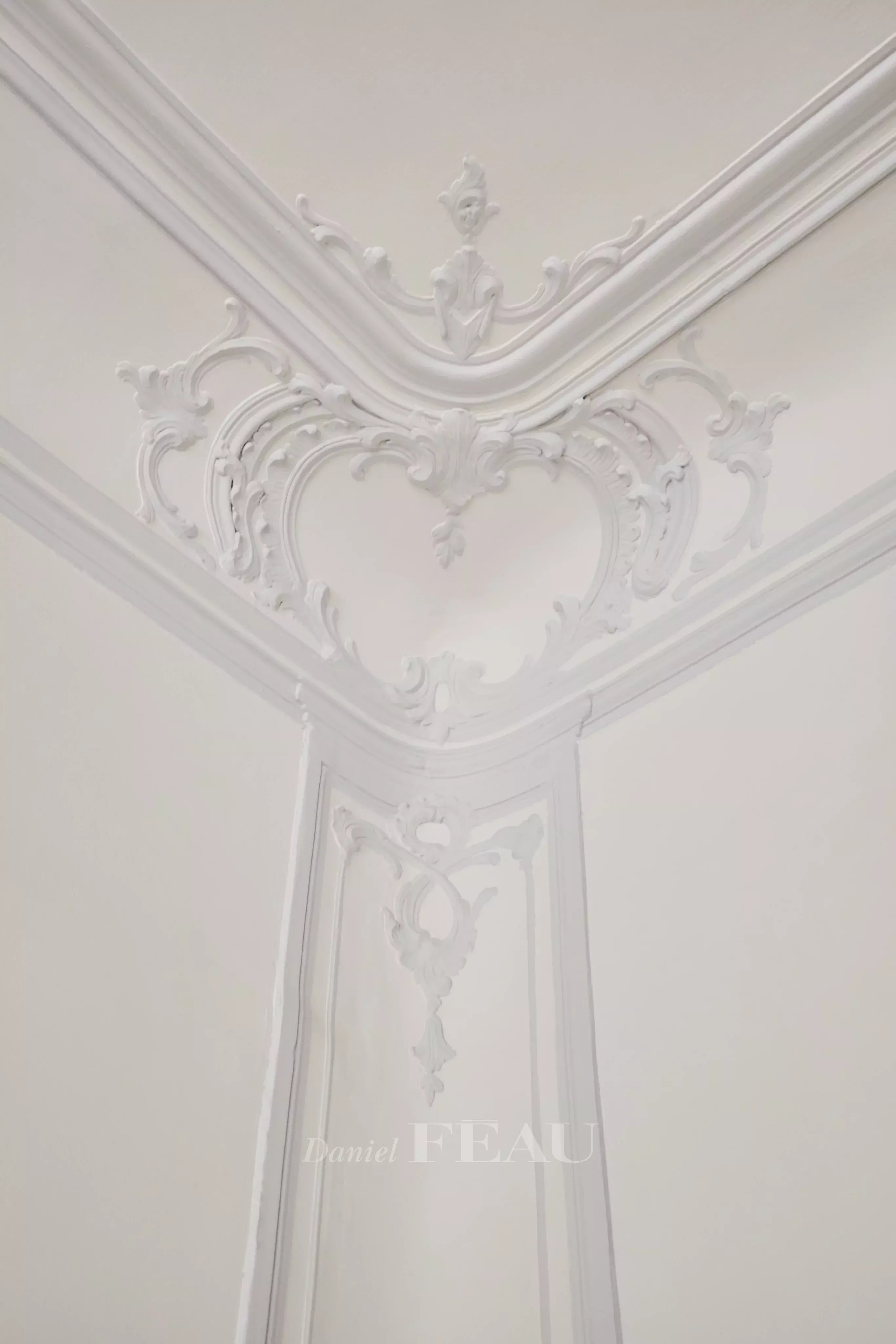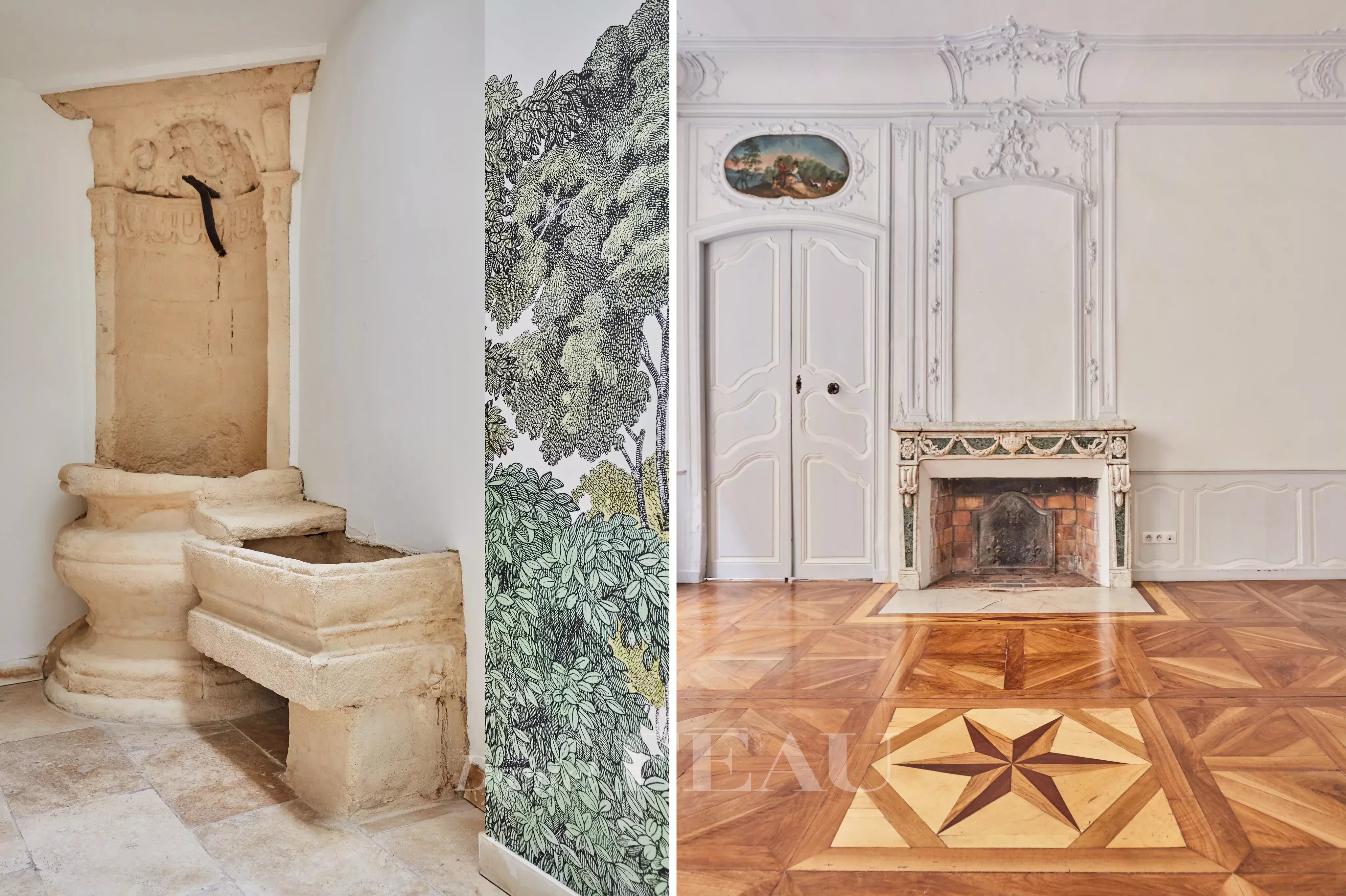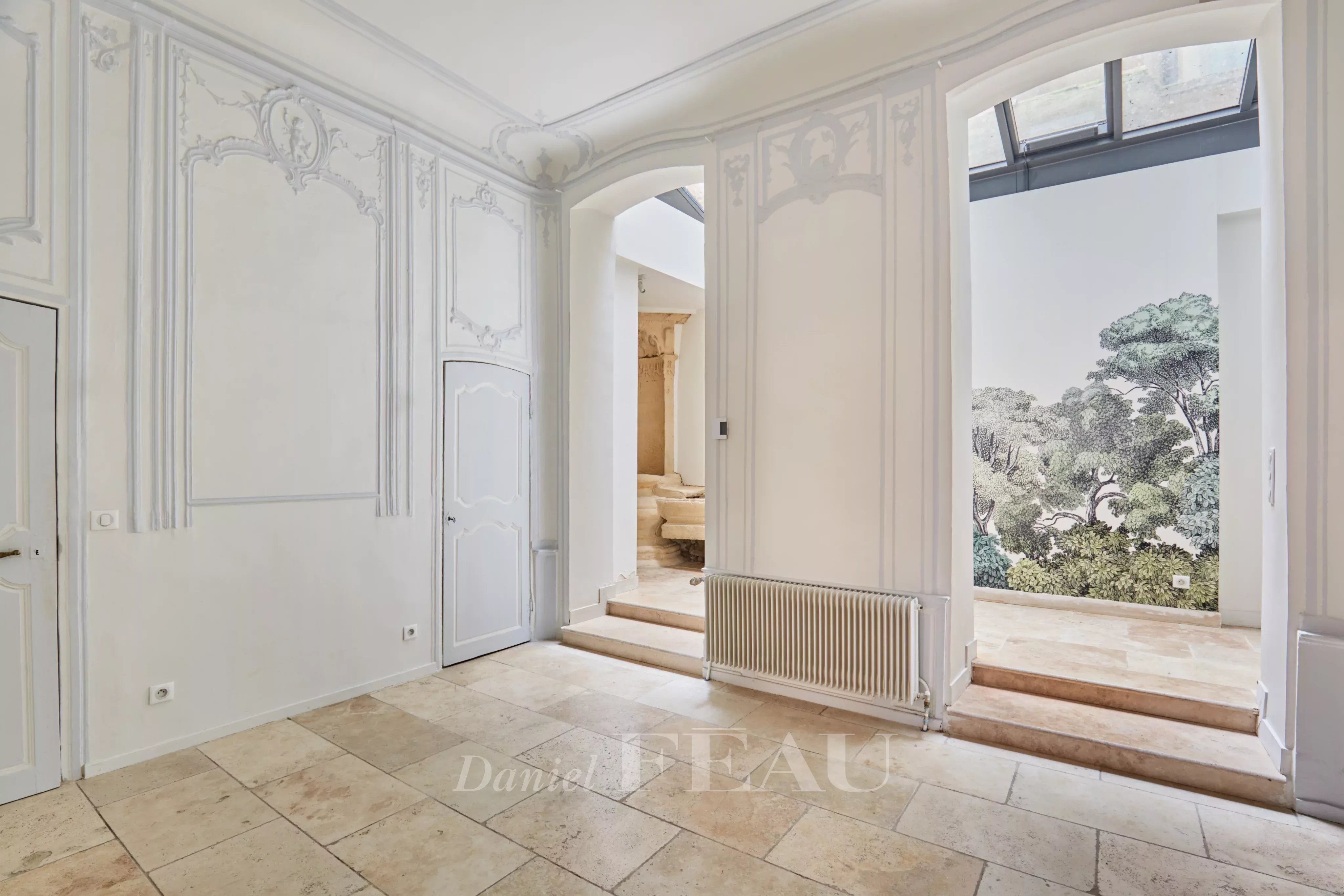 Deux portes d'entrée donnent accès à un salon baigné de lumière, aux gypseries délicates, boiseries sculptées et parquet Versailles. Les dessus de portes ornés, les volets intérieurs et les très belles hauteurs sous plafond témoignent du passé de l'immeuble.