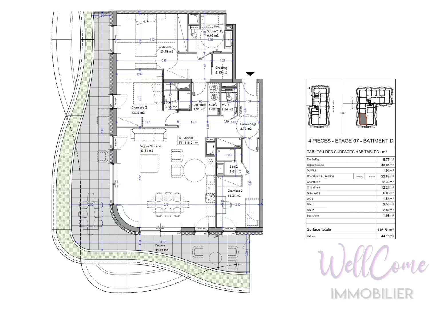 995 000 €Appartement PREMIUM T4 de 116 m² côté N-O + 2 Box inclus À Aix-les-Bains, en cur de ville au sein de la prestigieuse résidence « Les Nouveaux Thermes » découvrez cet appartement 4 pièces de 116,51m² au 7ème étage sur 13 côté Nord-Ouest. Cet appartement de prestige se distingue par ses volumes spectaculaires, sa luminosité omniprésente et une distribution pensée pour un confort de vie haut de gamme. Description de lappartement T4 : -Entrée/Dégagement et Dégagement nuit : 10,68m² -Séjour/Cuisine : 43,81m² -2 Chambres avec salle d'eau : 15,02m² et 14,87m² -1 Chambres avec salle de bains, wc et buanderie : 28,9m² -WC indépendant : 1,54m² -Buanderie : 1,69m² Lappartement souvre sur un balcon végétalisé de 44,15m² en double exposition (Nord-Ouest) offrant une vue panoramique dégagée sur les massifs environnants, le lac et la ville un atout rare pour un appartement en attique à Aix-les-Bains. Vendu avec 2 garage au sous-sol sécurisé. Présence de locaux vélos. Prestations haut de gamme : Plancher chauffant et rafraîchissant par géothermie. Menuiseries aluminium double vitrage. Brise-soleil orientables (BSO) et volets roulants électriques. Possibilité de personnalisation des finitions intérieurs. Une résidence contemporaine à haute performance environnementale : Façades et toitures végétalisées, Récupération des eaux pluviales, Chauffage et rafraîchissement par géothermie. Dautres appartements T4 sont disponibles dans la résidence (de 103m² à 196m² au prix de 995 000 à 2 699 000 ). Pour plus dinformations et pour réserver votre futur appartement contactez votre agence WellCome Immobilier ! Visite virutelle sur demande. Livraison prévue : 1er Trimestre 2029. Frais de notaire réduits. Programme certifié RE2020 seuil 2022 & NF Habitat HQE Surface CARREZ : 116.51 m²
