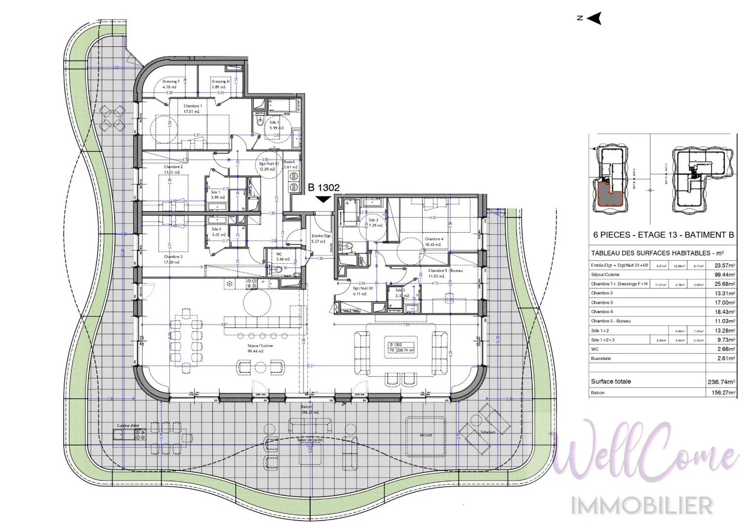 2 779 900 €Appartement PREMIUM T6 de 236 m² en Attique - 1 Box double inclus Résidence « Les Nouveaux Thermes » à Aix-les-Bains Au cur dAix-les-Bains, au sein de la prestigieuse résidence « Les Nouveaux Thermes », découvrez cet appartement T6 de 236,74 m² en attique au 13ème étage côté Ouest, bénéficiant dune triple exposition Nord/Ouest/Sud. Ce bien de prestige séduit par ses volumes exceptionnels, sa luminosité et une distribution pensée pour un confort de vie haut de gamme. Description de lappartement : - 1 Entrée et 2 dégagements nuit - Séjour / cuisine : 99,44 m² côté Ouest - 1 suite parentale avec 2 dressings et SDB / WC : 31,67 m² - 1 suite parentale avec SDB / WC : 25,72 m² - 3 chambres avec SDE : 13,35 m², 17,30 m², 20,42 m² - 1 WC indépendant - 1 buanderie Lappartement souvre sur un balcon végétalisé de 156,27 m² en triple exposition N-O-S, offrant une vue panoramique sur le lac du Bourget et les massifs environnants, un atout rare pour un attique à Aix-les-Bains ! 1 garage double sécurisé en sous-sol inclus. Résidence équipée de locaux vélos et poussettes sécurisés. Prestations haut de gamme : Hauteur sous plafond 2,98, Plancher chauffant et rafraîchissant par géothermie. Menuiseries aluminium double vitrage. Brise-soleil orientables (BSO) et volets roulants électriques. Possibilité de personnalisation des finitions intérieurs. Une résidence contemporaine à haute performance environnementale : Façades et toitures végétalisées, Récupération des eaux pluviales, Chauffage et rafraîchissement par géothermie. Pour plus dinformations et pour réserver votre futur appartement parmis les lots disponibles contactez votre agence WellCome Immobilier ! Livraison : 4ème trimestre 2028 Frais de notaire réduits Programme certifié RE2020 seuil 2022 & NF Habitat HQE