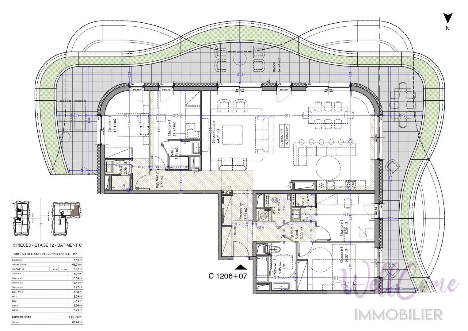 1 869 000 €Appartement PREMIUM T5 de 145m² au 12ème Côté SUD « Les Nouveaux Thermes » à Aix-les-Bains À Aix-les-Bains, en cur de ville au sein de la prestigieuse résidence « Les Nouveaux Thermes » découvrez cet appartement 5 pièces de 145,74m² au 12ème étage côté Sud (triple exposition Est-Sud-Ouest). Cet appartement de prestige se distingue par ses volumes spectaculaires, sa luminosité omniprésente et une distribution pensée pour un confort de vie haut de gamme. Description de lappartement T5 : -Séjour / Cuisine : 64,71 m² -Entrée / Dégagement et Dégagement nuit 1 + 2 -4 Chambres : 14,07 m², 10,59 m², 13,11 m², 11,27 m² -1 Salle de bains avec WC -3 Salle deau -WC indépendant -Buanderie Lappartement souvre sur un balcon végétalisé de 67,74 m² en triple exposition Est-Sud-Ouest offrant une vue panoramique sur le lac, les massifs environnants et la ville, un atout rare pour un appartement en attique à Aix-les-Bains. Vendu avec 1 Box et 1 parking au sous-sol sécurisé. Présence de locaux vélos et poussettes sécurisés. Prestations haut de gamme : Plancher chauffant et rafraîchissant par géothermie. Menuiseries aluminium double vitrage. Brise-soleil orientables (BSO) et volets roulants électriques. Possibilité de personnalisation des finitions intérieurs. Une résidence contemporaine à haute performance environnementale : Façades et toitures végétalisées, Récupération des eaux pluviales, Chauffage et rafraîchissement par géothermie. Dautres appartements T5 sont disponibles dans la résidence (de 145m² à 178m² au prix de 1 582 000 à 2 499 000 ). Pour plus dinformations et pour réserver votre futur appartement contactez votre agence WellCome Immobilier ! Livraison prévue : 1er Trimestre 2029 Frais de notaire réduits Programme certifié RE2020 seuil 2022 & NF Habitat HQE