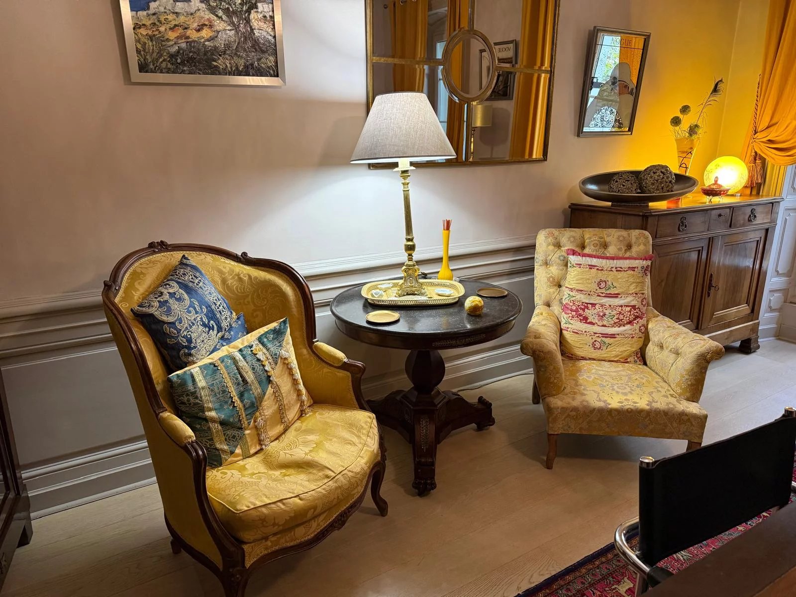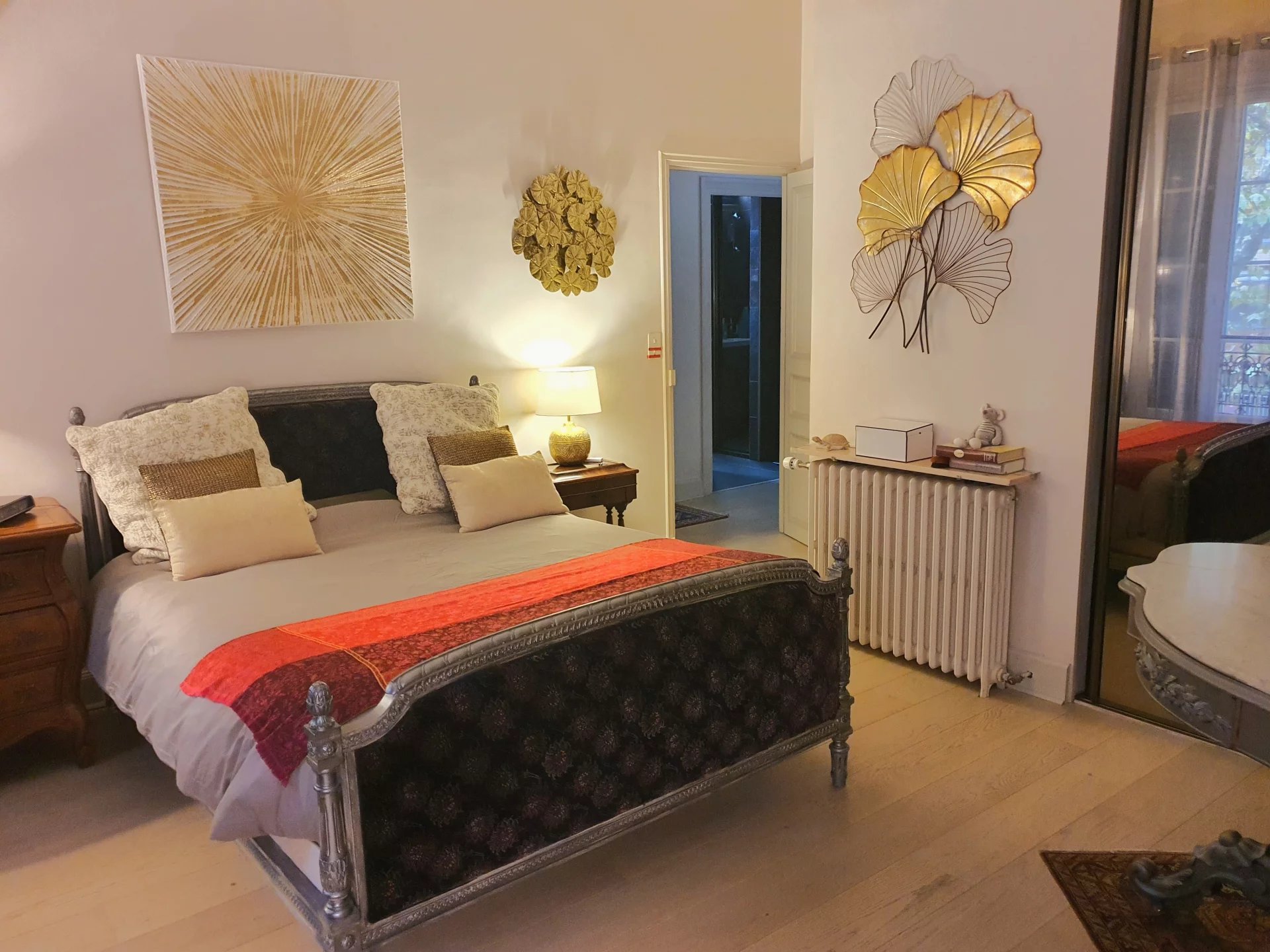 Dès l’entrée, l’esprit haussmannien s’impose avec élégance : généreuse hauteur sous plafond, parquets, moulures délicates et cheminées anciennes soulignent la noblesse des volumes.