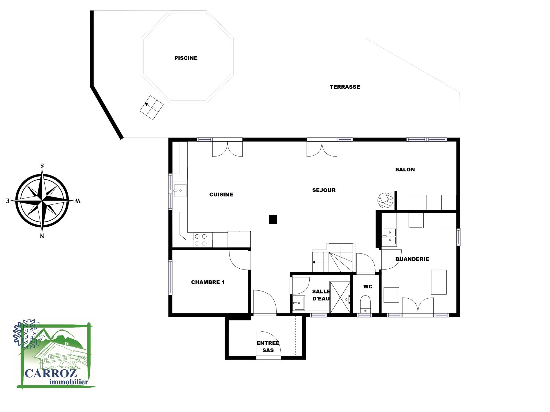 avec un terrain plat cette maison est composée en rez-de-chaussée d'une entrée , une chambre , salle d'eau et toilettes séparés, buanderie et un grand séjour cuisine donnant sur une terrasse avec piscine hors sol.