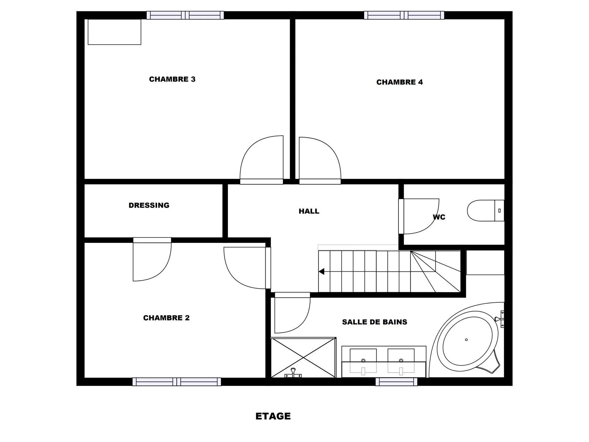 A l'étage 3 chambres une grande salle de bains avec bains et douche, un toilette séparé.
