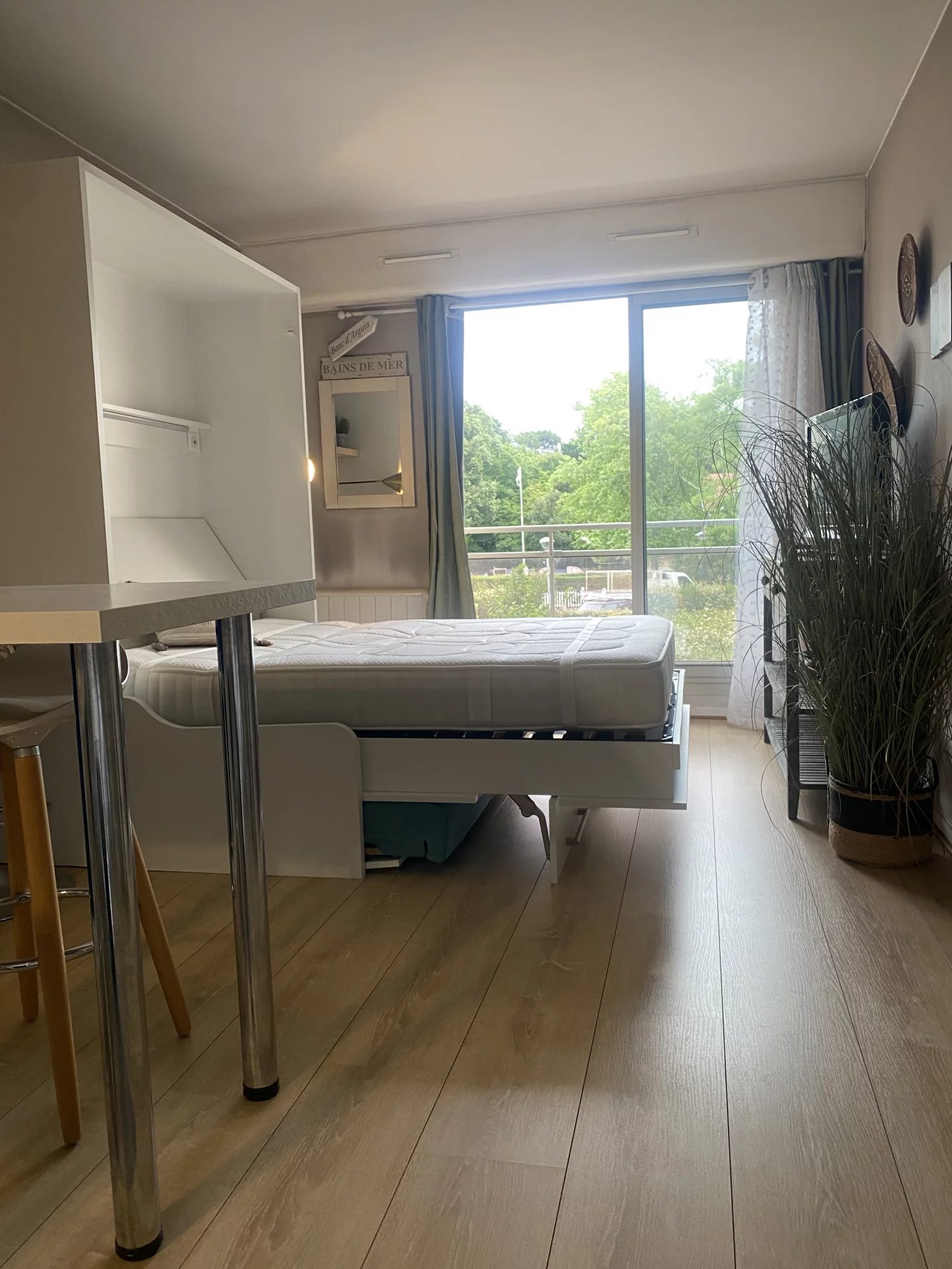Situé au premier étage avec ascenseur, l’appartement comprend une pièce principale astucieusement aménagée avec un lit escamotable, offrant à la fois une pièce de vie confortable en journée et un espace nuit agréable le soir.